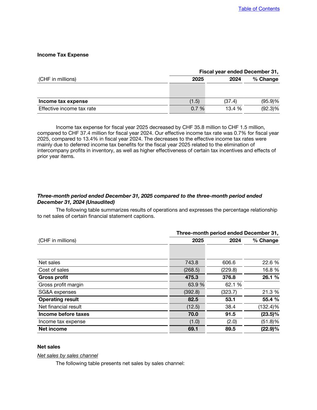 Income Tax Expense Fiscal year ended December 31, (CHF in millions) 2025 2024 % Change Income tax expense (1.5) (37.4) (95.9) % Effective income tax rate 0.7 % 13.4 % (92.3) % Income tax expense for fiscal year 2025 decreased by CHF 35.8 million to CHF 1.5 million, compared to CHF 37.4 million for fiscal year 2024. Our effective income tax rate was 0.7% for fiscal year 2025, compared to 13.4% in fiscal year 2024. The decreases to the effective income tax rates were mainly due to deferred income tax benefits for the fiscal year 2025 related to the elimination of intercompany profits in inventory, as well as higher effectiveness of certain tax incentives and effects of prior year items. Three-month period ended December 31, 2025 compared to the three-month period ended December 31, 2024 (Unaudited) The following table summarizes results of operations and expresses the percentage relationship to net sales of certain financial statement captions. Three-month period ended December 31, (CHF in millions) 2025 2024 % Change Net sales 743.8 606.6 22.6 % Cost of sales (268.5) (229.8) 16.8 % Gross profit 475.3 376.8 26.1 % Gross profit margin 63.9 % 62.1 % SG&A expenses (392.8) (323.7) 21.3 % Operating result 82.5 53.1 55.4 % Net financial result (12.5) 38.4 (132.4) % Income before taxes 70.0 91.5 (23.5) % Income tax expense (1.0) (2.0) (51.8) % Net income 69.1 89.5 (22.9) % Net sales Net sales by sales channel The following table presents net sales by sales channel: Table of Contents