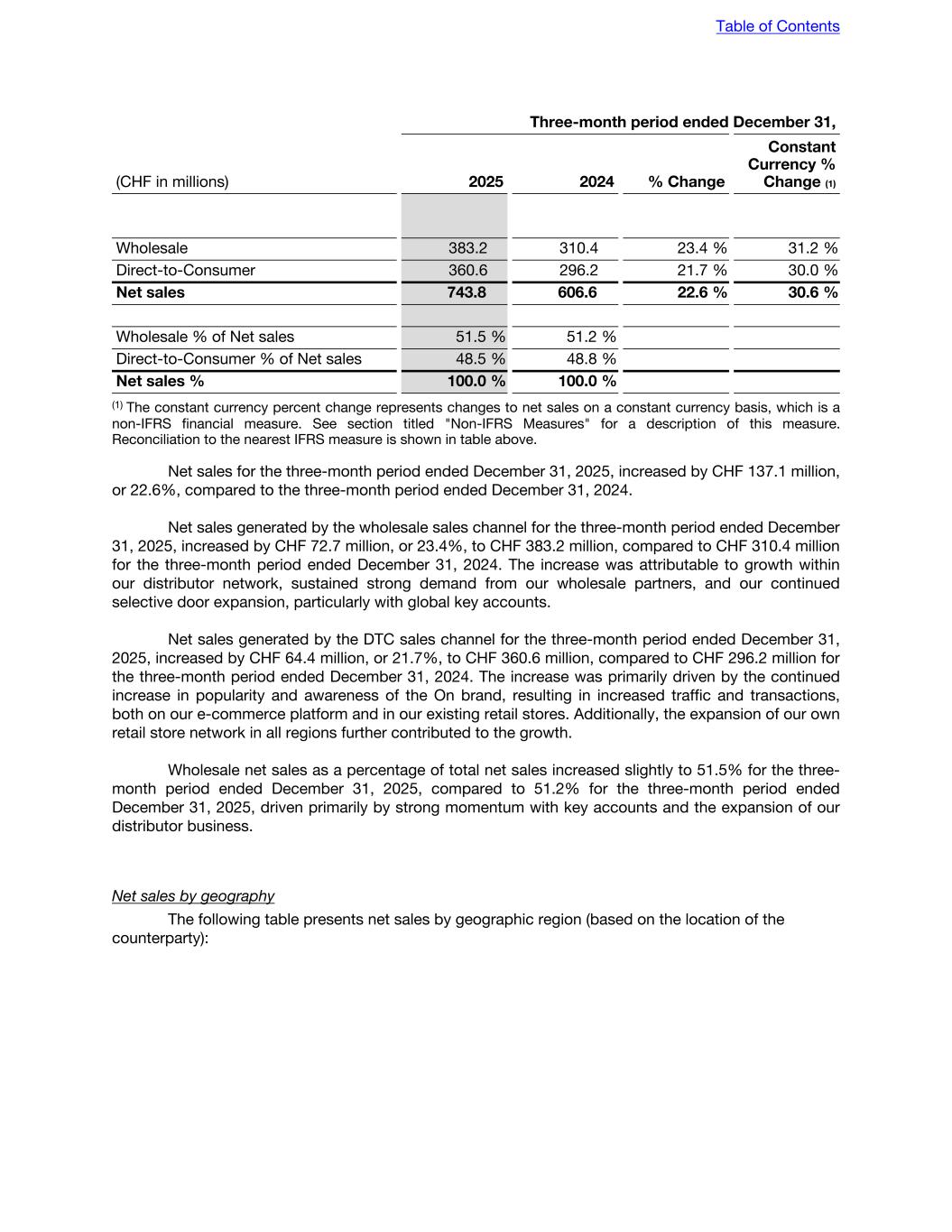 Three-month period ended December 31, (CHF in millions) 2025 2024 % Change Constant Currency % Change (1) Wholesale 383.2 310.4 23.4 % 31.2 % Direct-to-Consumer 360.6 296.2 21.7 % 30.0 % Net sales 743.8 606.6 22.6 % 30.6 % Wholesale % of Net sales 51.5 % 51.2 % Direct-to-Consumer % of Net sales 48.5 % 48.8 % Net sales % 100.0 % 100.0 % (1) The constant currency percent change represents changes to net sales on a constant currency basis, which is a non-IFRS financial measure. See section titled "Non-IFRS Measures" for a description of this measure. Reconciliation to the nearest IFRS measure is shown in table above. Net sales for the three-month period ended December 31, 2025, increased by CHF 137.1 million, or 22.6%, compared to the three-month period ended December 31, 2024. Net sales generated by the wholesale sales channel for the three-month period ended December 31, 2025, increased by CHF 72.7 million, or 23.4%, to CHF 383.2 million, compared to CHF 310.4 million for the three-month period ended December 31, 2024. The increase was attributable to growth within our distributor network, sustained strong demand from our wholesale partners, and our continued selective door expansion, particularly with global key accounts. Net sales generated by the DTC sales channel for the three-month period ended December 31, 2025, increased by CHF 64.4 million, or 21.7%, to CHF 360.6 million, compared to CHF 296.2 million for the three-month period ended December 31, 2024. The increase was primarily driven by the continued increase in popularity and awareness of the On brand, resulting in increased traffic and transactions, both on our e-commerce platform and in our existing retail stores. Additionally, the expansion of our own retail store network in all regions further contributed to the growth. Wholesale net sales as a percentage of total net sales increased slightly to 51.5% for the three- month period ended December 31, 2025, compared to 51.2% for the three-month period ended December 31, 2025, driven primarily by strong momentum with key accounts and the expansion of our distributor business. Net sales by geography The following table presents net sales by geographic region (based on the location of the counterparty): Table of Contents