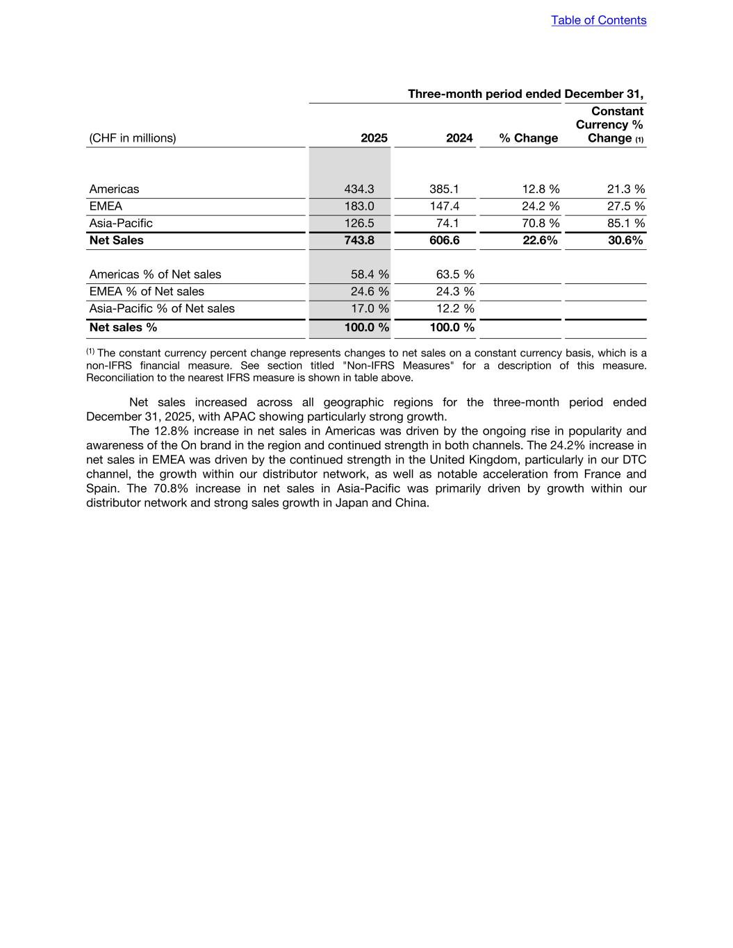 Three-month period ended December 31, (CHF in millions) 2025 2024 % Change Constant Currency % Change (1) Americas 434.3 385.1 12.8 % 21.3 % EMEA 183.0 147.4 24.2 % 27.5 % Asia-Pacific 126.5 74.1 70.8 % 85.1 % Net Sales 743.8 606.6 22.6% 30.6% Americas % of Net sales 58.4 % 63.5 % EMEA % of Net sales 24.6 % 24.3 % Asia-Pacific % of Net sales 17.0 % 12.2 % Net sales % 100.0 % 100.0 % (1) The constant currency percent change represents changes to net sales on a constant currency basis, which is a non-IFRS financial measure. See section titled "Non-IFRS Measures" for a description of this measure. Reconciliation to the nearest IFRS measure is shown in table above. Net sales increased across all geographic regions for the three-month period ended December 31, 2025, with APAC showing particularly strong growth. The 12.8% increase in net sales in Americas was driven by the ongoing rise in popularity and awareness of the On brand in the region and continued strength in both channels. The 24.2% increase in net sales in EMEA was driven by the continued strength in the United Kingdom, particularly in our DTC channel, the growth within our distributor network, as well as notable acceleration from France and Spain. The 70.8% increase in net sales in Asia-Pacific was primarily driven by growth within our distributor network and strong sales growth in Japan and China. Table of Contents