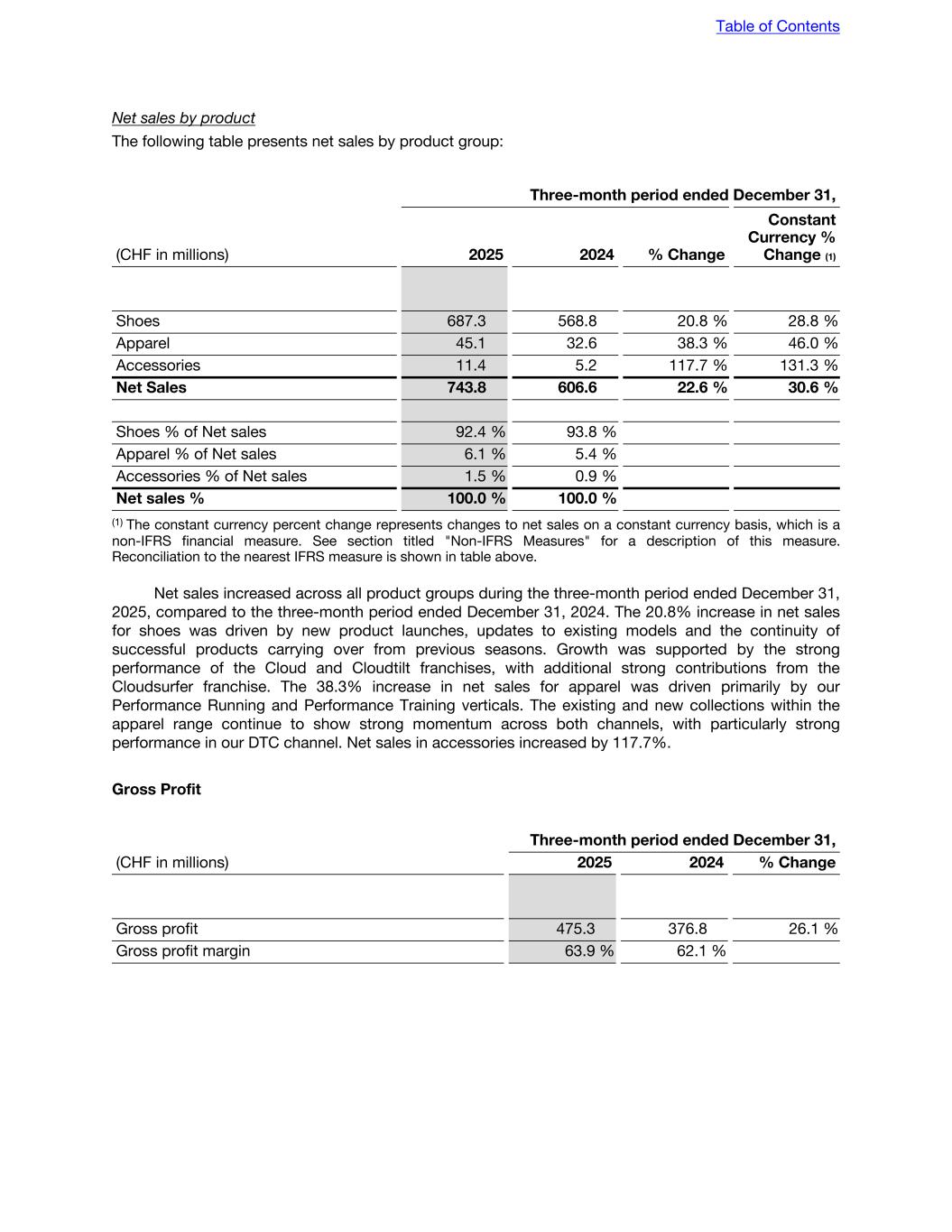 Net sales by product The following table presents net sales by product group: Three-month period ended December 31, (CHF in millions) 2025 2024 % Change Constant Currency % Change (1) Shoes 687.3 568.8 20.8 % 28.8 % Apparel 45.1 32.6 38.3 % 46.0 % Accessories 11.4 5.2 117.7 % 131.3 % Net Sales 743.8 606.6 22.6 % 30.6 % Shoes % of Net sales 92.4 % 93.8 % Apparel % of Net sales 6.1 % 5.4 % Accessories % of Net sales 1.5 % 0.9 % Net sales % 100.0 % 100.0 % (1) The constant currency percent change represents changes to net sales on a constant currency basis, which is a non-IFRS financial measure. See section titled "Non-IFRS Measures" for a description of this measure. Reconciliation to the nearest IFRS measure is shown in table above. Net sales increased across all product groups during the three-month period ended December 31, 2025, compared to the three-month period ended December 31, 2024. The 20.8% increase in net sales for shoes was driven by new product launches, updates to existing models and the continuity of successful products carrying over from previous seasons. Growth was supported by the strong performance of the Cloud and Cloudtilt franchises, with additional strong contributions from the Cloudsurfer franchise. The 38.3% increase in net sales for apparel was driven primarily by our Performance Running and Performance Training verticals. The existing and new collections within the apparel range continue to show strong momentum across both channels, with particularly strong performance in our DTC channel. Net sales in accessories increased by 117.7%. Gross Profit Three-month period ended December 31, (CHF in millions) 2025 2024 % Change Gross profit 475.3 376.8 26.1 % Gross profit margin 63.9 % 62.1 % Table of Contents
