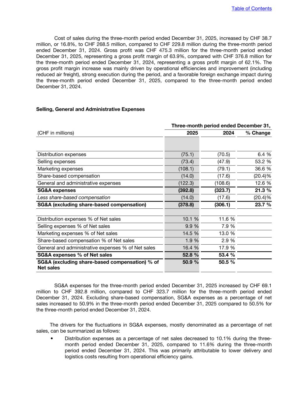 Cost of sales during the three-month period ended December 31, 2025, increased by CHF 38.7 million, or 16.8%, to CHF 268.5 million, compared to CHF 229.8 million during the three-month period ended December 31, 2024. Gross profit was CHF 475.3 million for the three-month period ended December 31, 2025, representing a gross profit margin of 63.9%, compared with CHF 376.8 million for the three-month period ended December 31, 2024, representing a gross profit margin of 62.1%. The gross profit margin increase was mainly driven by operational efficiencies and improvement (including reduced air freight), strong execution during the period, and a favorable foreign exchange impact during the three-month period ended December 31, 2025, compared to the three-month period ended December 31, 2024. Selling, General and Administrative Expenses Three-month period ended December 31, (CHF in millions) 2025 2024 % Change Distribution expenses (75.1) (70.5) 6.4 % Selling expenses (73.4) (47.9) 53.2 % Marketing expenses (108.1) (79.1) 36.6 % Share-based compensation (14.0) (17.6) (20.4) % General and administrative expenses (122.3) (108.6) 12.6 % SG&A expenses (392.8) (323.7) 21.3 % Less share-based compensation (14.0) (17.6) (20.4) % SG&A (excluding share-based compensation) (378.8) (306.1) 23.7 % Distribution expenses % of Net sales 10.1 % 11.6 % Selling expenses % of Net sales 9.9 % 7.9 % Marketing expenses % of Net sales 14.5 % 13.0 % Share-based compensation % of Net sales 1.9 % 2.9 % General and administrative expenses % of Net sales 16.4 % 17.9 % SG&A expenses % of Net sales 52.8 % 53.4 % SG&A (excluding share-based compensation) % of Net sales 50.9 % 50.5 % SG&A expenses for the three-month period ended December 31, 2025 increased by CHF 69.1 million to CHF 392.8 million, compared to CHF 323.7 million for the three-month period ended December 31, 2024. Excluding share-based compensation, SG&A expenses as a percentage of net sales increased to 50.9% in the three-month period ended December 31, 2025 compared to 50.5% for the three-month period ended December 31, 2024. The drivers for the fluctuations in SG&A expenses, mostly denominated as a percentage of net sales, can be summarized as follows: • Distribution expenses as a percentage of net sales decreased to 10.1% during the three- month period ended December 31, 2025, compared to 11.6% during the three-month period ended December 31, 2024. This was primarily attributable to lower delivery and logistics costs resulting from operational efficiency gains. Table of Contents