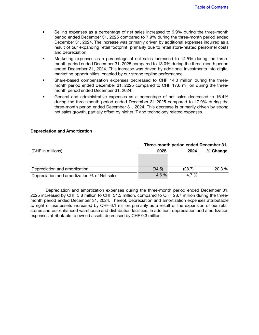 • Selling expenses as a percentage of net sales increased to 9.9% during the three-month period ended December 31, 2025 compared to 7.9% during the three-month period ended December 31, 2024. The increase was primarily driven by additional expenses incurred as a result of our expanding retail footprint, primarily due to retail store-related personnel costs and depreciation. • Marketing expenses as a percentage of net sales increased to 14.5% during the three- month period ended December 31, 2025 compared to 13.0% during the three-month period ended December 31, 2024. This increase was driven by additional investments into digital marketing opportunities, enabled by our strong topline performance. • Share-based compensation expenses decreased to CHF 14.0 million during the three- month period ended December 31, 2025 compared to CHF 17.6 million during the three- month period ended December 31, 2024. • General and administrative expenses as a percentage of net sales decreased to 16.4% during the three-month period ended December 31 2025 compared to 17.9% during the three-month period ended December 31, 2024. This decrease is primarily driven by strong net sales growth, partially offset by higher IT and technology related expenses. Depreciation and Amortization Three-month period ended December 31, (CHF in millions) 2025 2024 % Change Depreciation and amortization (34.5) (28.7) 20.3 % Depreciation and amortization % of Net sales 4.6 % 4.7 % Depreciation and amortization expenses during the three-month period ended December 31, 2025 increased by CHF 5.8 million to CHF 34.5 million, compared to CHF 28.7 million during the three- month period ended December 31, 2024. Thereof, depreciation and amortization expenses attributable to right of use assets increased by CHF 6.1 million primarily as a result of the expansion of our retail stores and our enhanced warehouse and distribution facilities. In addition, depreciation and amortization expenses attributable to owned assets decreased by CHF 0.3 million. Table of Contents