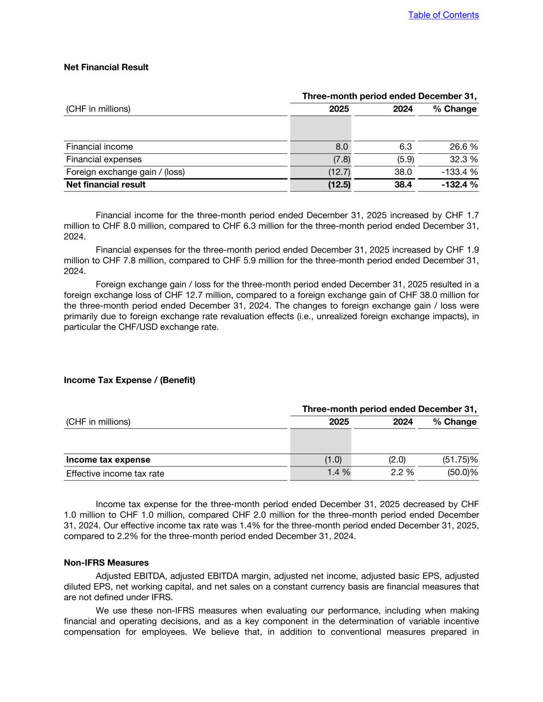 Net Financial Result Three-month period ended December 31, (CHF in millions) 2025 2024 % Change Financial income 8.0 6.3 26.6 % Financial expenses (7.8) (5.9) 32.3 % Foreign exchange gain / (loss) (12.7) 38.0 -133.4 % Net financial result (12.5) 38.4 -132.4 % Financial income for the three-month period ended December 31, 2025 increased by CHF 1.7 million to CHF 8.0 million, compared to CHF 6.3 million for the three-month period ended December 31, 2024. Financial expenses for the three-month period ended December 31, 2025 increased by CHF 1.9 million to CHF 7.8 million, compared to CHF 5.9 million for the three-month period ended December 31, 2024. Foreign exchange gain / loss for the three-month period ended December 31, 2025 resulted in a foreign exchange loss of CHF 12.7 million, compared to a foreign exchange gain of CHF 38.0 million for the three-month period ended December 31, 2024. The changes to foreign exchange gain / loss were primarily due to foreign exchange rate revaluation effects (i.e., unrealized foreign exchange impacts), in particular the CHF/USD exchange rate. Income Tax Expense / (Benefit) Three-month period ended December 31, (CHF in millions) 2025 2024 % Change Income tax expense (1.0) (2.0) (51.75) % Effective income tax rate 1.4 % 2.2 % (50.0) % Income tax expense for the three-month period ended December 31, 2025 decreased by CHF 1.0 million to CHF 1.0 million, compared CHF 2.0 million for the three-month period ended December 31, 2024. Our effective income tax rate was 1.4% for the three-month period ended December 31, 2025, compared to 2.2% for the three-month period ended December 31, 2024. Non-IFRS Measures Adjusted EBITDA, adjusted EBITDA margin, adjusted net income, adjusted basic EPS, adjusted diluted EPS, net working capital, and net sales on a constant currency basis are financial measures that are not defined under IFRS. We use these non-IFRS measures when evaluating our performance, including when making financial and operating decisions, and as a key component in the determination of variable incentive compensation for employees. We believe that, in addition to conventional measures prepared in Table of Contents