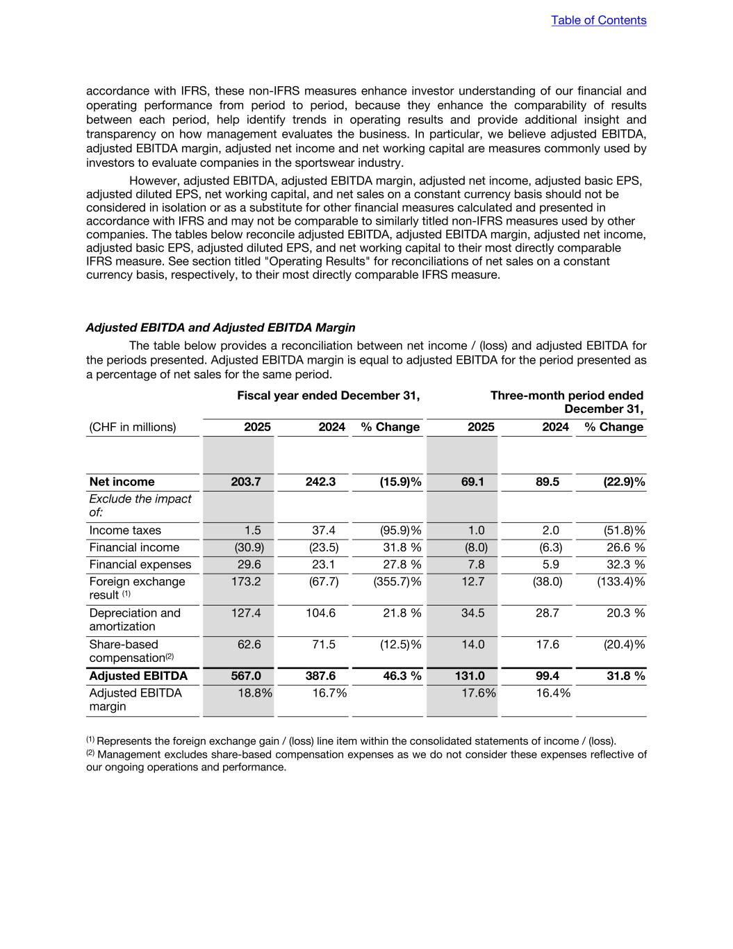 accordance with IFRS, these non-IFRS measures enhance investor understanding of our financial and operating performance from period to period, because they enhance the comparability of results between each period, help identify trends in operating results and provide additional insight and transparency on how management evaluates the business. In particular, we believe adjusted EBITDA, adjusted EBITDA margin, adjusted net income and net working capital are measures commonly used by investors to evaluate companies in the sportswear industry. However, adjusted EBITDA, adjusted EBITDA margin, adjusted net income, adjusted basic EPS, adjusted diluted EPS, net working capital, and net sales on a constant currency basis should not be considered in isolation or as a substitute for other financial measures calculated and presented in accordance with IFRS and may not be comparable to similarly titled non-IFRS measures used by other companies. The tables below reconcile adjusted EBITDA, adjusted EBITDA margin, adjusted net income, adjusted basic EPS, adjusted diluted EPS, and net working capital to their most directly comparable IFRS measure. See section titled "Operating Results" for reconciliations of net sales on a constant currency basis, respectively, to their most directly comparable IFRS measure. Adjusted EBITDA and Adjusted EBITDA Margin The table below provides a reconciliation between net income / (loss) and adjusted EBITDA for the periods presented. Adjusted EBITDA margin is equal to adjusted EBITDA for the period presented as a percentage of net sales for the same period. Fiscal year ended December 31, Three-month period ended December 31, (CHF in millions) 2025 2024 % Change 2025 2024 % Change Net income 203.7 242.3 (15.9) % 69.1 89.5 (22.9) % Exclude the impact of: Income taxes 1.5 37.4 (95.9) % 1.0 2.0 (51.8) % Financial income (30.9) (23.5) 31.8 % (8.0) (6.3) 26.6 % Financial expenses 29.6 23.1 27.8 % 7.8 5.9 32.3 % Foreign exchange result (1) 173.2 (67.7) (355.7) % 12.7 (38.0) (133.4) % Depreciation and amortization 127.4 104.6 21.8 % 34.5 28.7 20.3 % Share-based compensation(2) 62.6 71.5 (12.5) % 14.0 17.6 (20.4) % Adjusted EBITDA 567.0 387.6 46.3 % 131.0 99.4 31.8 % Adjusted EBITDA margin 18.8 % 16.7 % 17.6 % 16.4 % (1) Represents the foreign exchange gain / (loss) line item within the consolidated statements of income / (loss). (2) Management excludes share-based compensation expenses as we do not consider these expenses reflective of our ongoing operations and performance. Table of Contents