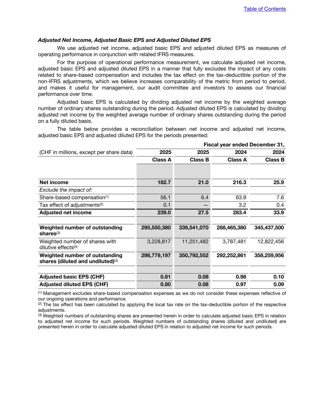 Adjusted Net Income, Adjusted Basic EPS and Adjusted Diluted EPS We use adjusted net income, adjusted basic EPS and adjusted diluted EPS as measures of operating performance in conjunction with related IFRS measures. For the purpose of operational performance measurement, we calculate adjusted net income, adjusted basic EPS and adjusted diluted EPS in a manner that fully excludes the impact of any costs related to share-based compensation and includes the tax effect on the tax-deductible portion of the non-IFRS adjustments, which we believe increases comparability of the metric from period to period, and makes it useful for management, our audit committee and investors to assess our financial performance over time. Adjusted basic EPS is calculated by dividing adjusted net income by the weighted average number of ordinary shares outstanding during the period. Adjusted diluted EPS is calculated by dividing adjusted net income by the weighted average number of ordinary shares outstanding during the period on a fully diluted basis. The table below provides a reconciliation between net income and adjusted net income, adjusted basic EPS and adjusted diluted EPS for the periods presented: Fiscal year ended December 31, (CHF in millions, except per share data) 2025 2025 2024 2024 Class A Class B Class A Class B Net income 182.7 21.0 216.3 25.9 Exclude the impact of: Share-based compensation(1) 56.1 6.4 63.9 7.6 Tax effect of adjustments(2) 0.1 — 3.2 0.4 Adjusted net income 239.0 27.5 283.4 33.9 Weighted number of outstanding shares(3) 295,550,380 339,541,070 288,465,380 345,437,500 Weighted number of shares with dilutive effects(3) 3,228,817 11,251,482 3,787,481 12,822,456 Weighted number of outstanding shares (diluted and undiluted)(3) 298,779,197 350,792,552 292,252,861 358,259,956 Adjusted basic EPS (CHF) 0.81 0.08 0.98 0.10 Adjusted diluted EPS (CHF) 0.80 0.08 0.97 0.09 (1) Management excludes share-based compensation expenses as we do not consider these expenses reflective of our ongoing operations and performance. (2) The tax effect has been calculated by applying the local tax rate on the tax-deductible portion of the respective adjustments. (3) Weighted numbers of outstanding shares are presented herein in order to calculate adjusted basic EPS in relation to adjusted net income for such periods. Weighted numbers of outstanding shares (diluted and undiluted) are presented herein in order to calculate adjusted diluted EPS in relation to adjusted net income for such periods. Table of Contents