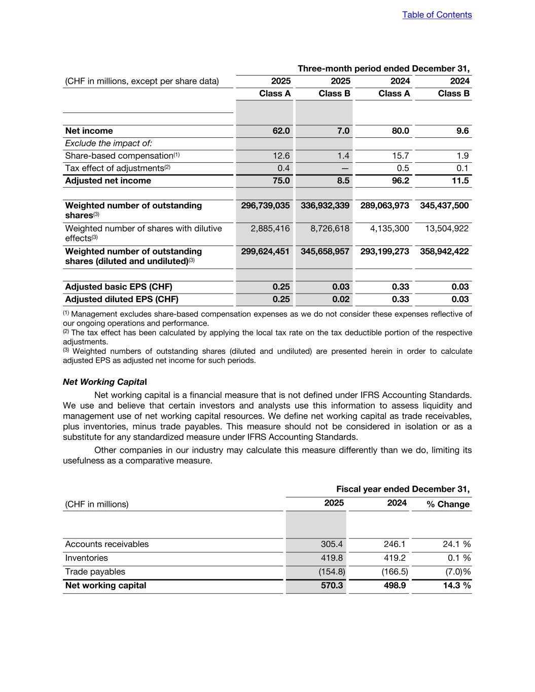 Three-month period ended December 31, (CHF in millions, except per share data) 2025 2025 2024 2024 Class A Class B Class A Class B Net income 62.0 7.0 80.0 9.6 Exclude the impact of: Share-based compensation(1) 12.6 1.4 15.7 1.9 Tax effect of adjustments(2) 0.4 — 0.5 0.1 Adjusted net income 75.0 8.5 96.2 11.5 Weighted number of outstanding shares(3) 296,739,035 336,932,339 289,063,973 345,437,500 Weighted number of shares with dilutive effects(3) 2,885,416 8,726,618 4,135,300 13,504,922 Weighted number of outstanding shares (diluted and undiluted)(3) 299,624,451 345,658,957 293,199,273 358,942,422 Adjusted basic EPS (CHF) 0.25 0.03 0.33 0.03 Adjusted diluted EPS (CHF) 0.25 0.02 0.33 0.03 (1) Management excludes share-based compensation expenses as we do not consider these expenses reflective of our ongoing operations and performance. (2) The tax effect has been calculated by applying the local tax rate on the tax deductible portion of the respective adjustments. (3) Weighted numbers of outstanding shares (diluted and undiluted) are presented herein in order to calculate adjusted EPS as adjusted net income for such periods. Net Working Capital Net working capital is a financial measure that is not defined under IFRS Accounting Standards. We use and believe that certain investors and analysts use this information to assess liquidity and management use of net working capital resources. We define net working capital as trade receivables, plus inventories, minus trade payables. This measure should not be considered in isolation or as a substitute for any standardized measure under IFRS Accounting Standards. Other companies in our industry may calculate this measure differently than we do, limiting its usefulness as a comparative measure. Fiscal year ended December 31, (CHF in millions) 2025 2024 % Change Accounts receivables 305.4 246.1 24.1 % Inventories 419.8 419.2 0.1 % Trade payables (154.8) (166.5) (7.0) % Net working capital 570.3 498.9 14.3 % Table of Contents