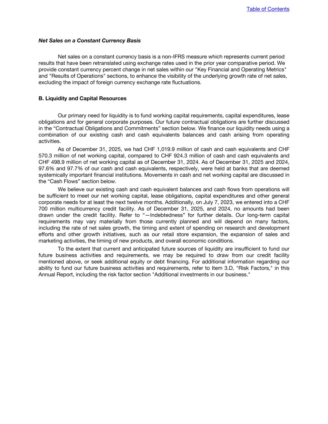 Net Sales on a Constant Currency Basis Net sales on a constant currency basis is a non-IFRS measure which represents current period results that have been retranslated using exchange rates used in the prior year comparative period. We provide constant currency percent change in net sales within our "Key Financial and Operating Metrics" and "Results of Operations" sections, to enhance the visibility of the underlying growth rate of net sales, excluding the impact of foreign currency exchange rate fluctuations. B. Liquidity and Capital Resources Our primary need for liquidity is to fund working capital requirements, capital expenditures, lease obligations and for general corporate purposes. Our future contractual obligations are further discussed in the “Contractual Obligations and Commitments” section below. We finance our liquidity needs using a combination of our existing cash and cash equivalents balances and cash arising from operating activities. As of December 31, 2025, we had CHF 1,019.9 million of cash and cash equivalents and CHF 570.3 million of net working capital, compared to CHF 924.3 million of cash and cash equivalents and CHF 498.9 million of net working capital as of December 31, 2024. As of December 31, 2025 and 2024, 97.6% and 97.7% of our cash and cash equivalents, respectively, were held at banks that are deemed systemically important financial institutions. Movements in cash and net working capital are discussed in the “Cash Flows” section below. We believe our existing cash and cash equivalent balances and cash flows from operations will be sufficient to meet our net working capital, lease obligations, capital expenditures and other general corporate needs for at least the next twelve months. Additionally, on July 7, 2023, we entered into a CHF 700 million multicurrency credit facility. As of December 31, 2025, and 2024, no amounts had been drawn under the credit facility. Refer to “—Indebtedness” for further details. Our long-term capital requirements may vary materially from those currently planned and will depend on many factors, including the rate of net sales growth, the timing and extent of spending on research and development efforts and other growth initiatives, such as our retail store expansion, the expansion of sales and marketing activities, the timing of new products, and overall economic conditions. To the extent that current and anticipated future sources of liquidity are insufficient to fund our future business activities and requirements, we may be required to draw from our credit facility mentioned above, or seek additional equity or debt financing. For additional information regarding our ability to fund our future business activities and requirements, refer to Item 3.D, "Risk Factors," in this Annual Report, including the risk factor section "Additional investments in our business." Table of Contents