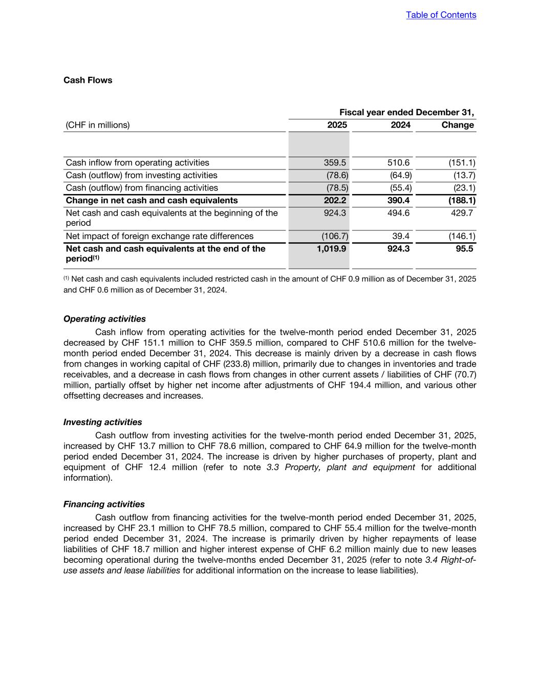 Cash Flows Fiscal year ended December 31, (CHF in millions) 2025 2024 Change Cash inflow from operating activities 359.5 510.6 (151.1) Cash (outflow) from investing activities (78.6) (64.9) (13.7) Cash (outflow) from financing activities (78.5) (55.4) (23.1) Change in net cash and cash equivalents 202.2 390.4 (188.1) Net cash and cash equivalents at the beginning of the period 924.3 494.6 429.7 Net impact of foreign exchange rate differences (106.7) 39.4 (146.1) Net cash and cash equivalents at the end of the period(1) 1,019.9 924.3 95.5 (1) Net cash and cash equivalents included restricted cash in the amount of CHF 0.9 million as of December 31, 2025 and CHF 0.6 million as of December 31, 2024. Operating activities Cash inflow from operating activities for the twelve-month period ended December 31, 2025 decreased by CHF 151.1 million to CHF 359.5 million, compared to CHF 510.6 million for the twelve- month period ended December 31, 2024. This decrease is mainly driven by a decrease in cash flows from changes in working capital of CHF (233.8) million, primarily due to changes in inventories and trade receivables, and a decrease in cash flows from changes in other current assets / liabilities of CHF (70.7) million, partially offset by higher net income after adjustments of CHF 194.4 million, and various other offsetting decreases and increases. Investing activities Cash outflow from investing activities for the twelve-month period ended December 31, 2025, increased by CHF 13.7 million to CHF 78.6 million, compared to CHF 64.9 million for the twelve-month period ended December 31, 2024. The increase is driven by higher purchases of property, plant and equipment of CHF 12.4 million (refer to note 3.3 Property, plant and equipment for additional information). Financing activities Cash outflow from financing activities for the twelve-month period ended December 31, 2025, increased by CHF 23.1 million to CHF 78.5 million, compared to CHF 55.4 million for the twelve-month period ended December 31, 2024. The increase is primarily driven by higher repayments of lease liabilities of CHF 18.7 million and higher interest expense of CHF 6.2 million mainly due to new leases becoming operational during the twelve-months ended December 31, 2025 (refer to note 3.4 Right-of- use assets and lease liabilities for additional information on the increase to lease liabilities). Table of Contents