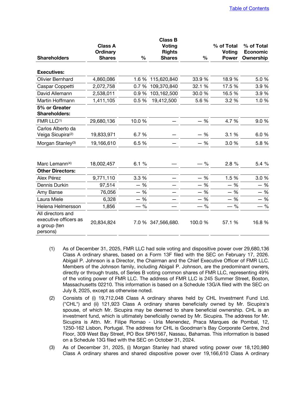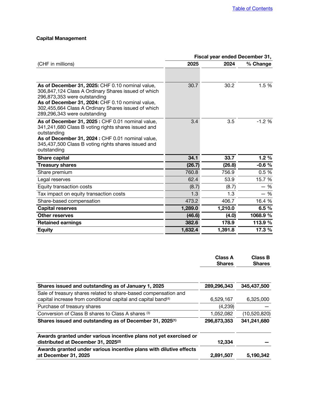 Capital Management Fiscal year ended December 31, (CHF in millions) 2025 2024 % Change As of December 31, 2025: CHF 0.10 nominal value, 306,847,124 Class A Ordinary Shares issued of which 296,873,353 were outstanding As of December 31, 2024: CHF 0.10 nominal value, 302,455,664 Class A Ordinary Shares issued of which 289,296,343 were outstanding 30.7 30.2 1.5 % As of December 31, 2025 : CHF 0.01 nominal value, 341,241,680 Class B voting rights shares issued and outstanding As of December 31, 2024 : CHF 0.01 nominal value, 345,437,500 Class B voting rights shares issued and outstanding 3.4 3.5 -1.2 % Share capital 34.1 33.7 1.2 % Treasury shares (26.7) (26.8) -0.6 % Share premium 760.8 756.9 0.5 % Legal reserves 62.4 53.9 15.7 % Equity transaction costs (8.7) (8.7) — % Tax impact on equity transaction costs 1.3 1.3 — % Share-based compensation 473.2 406.7 16.4 % Capital reserves 1,289.0 1,210.0 6.5 % Other reserves (46.6) (4.0) 1068.9 % Retained earnings 382.6 178.9 113.9 % Equity 1,632.4 1,391.8 17.3 % Class A Shares Class B Shares Shares issued and outstanding as of January 1, 2025 289,296,343 345,437,500 Sale of treasury shares related to share-based compensation and capital increase from conditional capital and capital band(4) 6,529,167 6,325,000 Purchase of treasury shares (4,239) — Conversion of Class B shares to Class A shares (3) 1,052,082 (10,520,820) Shares issued and outstanding as of December 31, 2025(1) 296,873,353 341,241,680 Awards granted under various incentive plans not yet exercised or distributed at December 31, 2025(2) 12,334 — Awards granted under various incentive plans with dilutive effects at December 31, 2025 2,891,507 5,190,342 Table of Contents