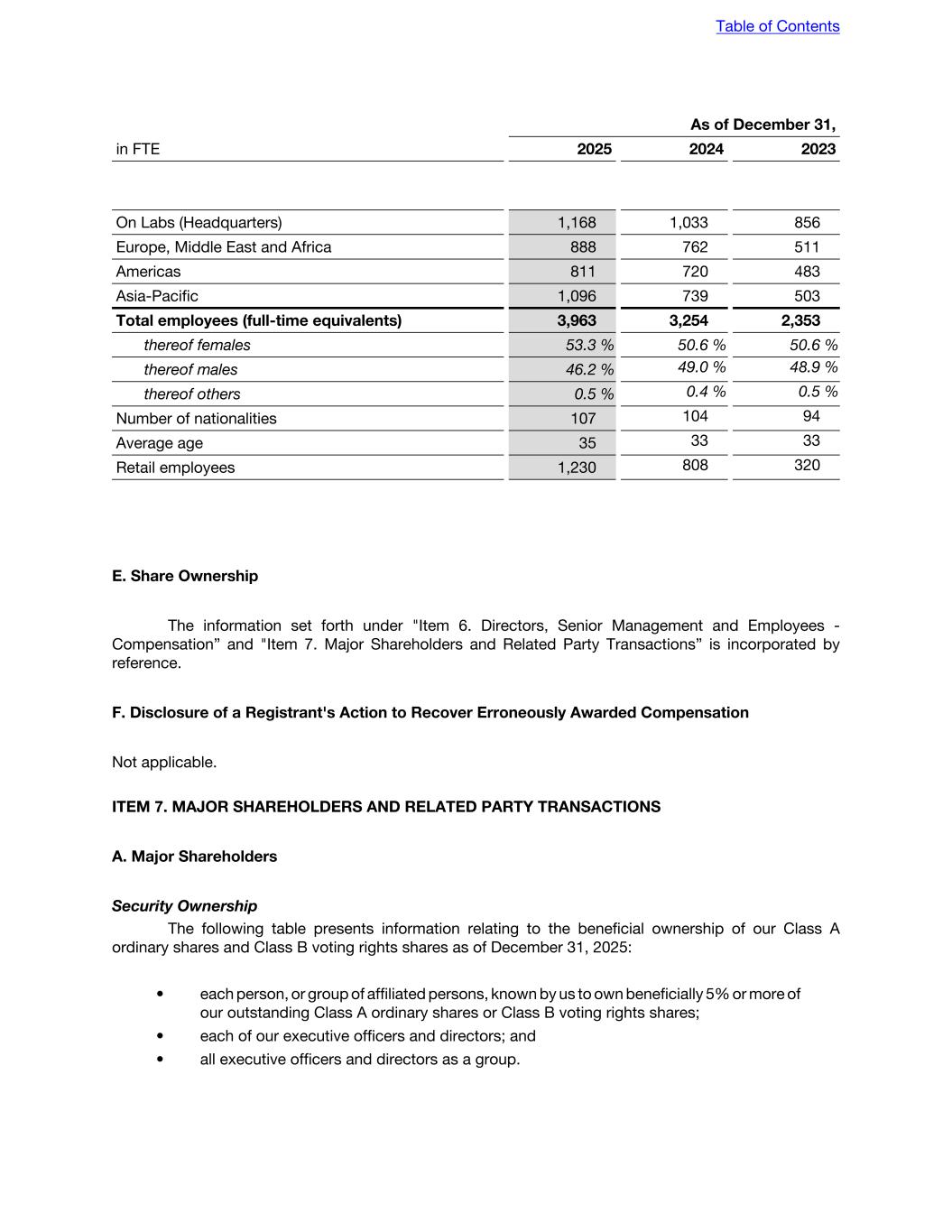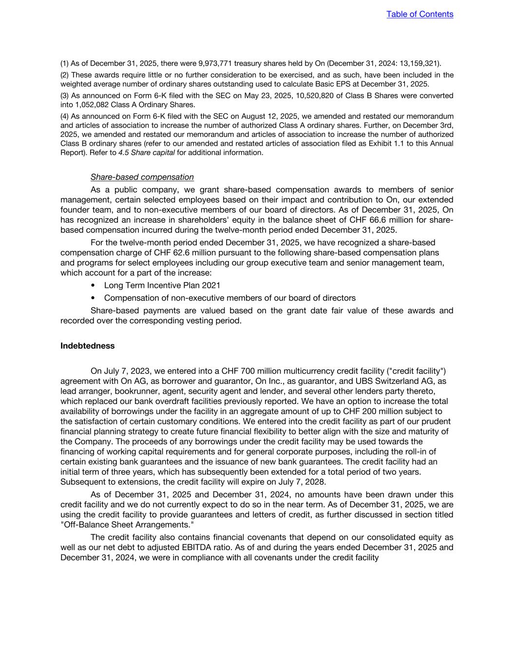 (1) As of December 31, 2025, there were 9,973,771 treasury shares held by On (December 31, 2024: 13,159,321). (2) These awards require little or no further consideration to be exercised, and as such, have been included in the weighted average number of ordinary shares outstanding used to calculate Basic EPS at December 31, 2025. (3) As announced on Form 6-K filed with the SEC on May 23, 2025, 10,520,820 of Class B Shares were converted into 1,052,082 Class A Ordinary Shares. (4) As announced on Form 6-K filed with the SEC on August 12, 2025, we amended and restated our memorandum and articles of association to increase the number of authorized Class A ordinary shares. Further, on December 3rd, 2025, we amended and restated our memorandum and articles of association to increase the number of authorized Class B ordinary shares (refer to our amended and restated articles of association filed as Exhibit 1.1 to this Annual Report). Refer to 4.5 Share capital for additional information. Share-based compensation As a public company, we grant share-based compensation awards to members of senior management, certain selected employees based on their impact and contribution to On, our extended founder team, and to non-executive members of our board of directors. As of December 31, 2025, On has recognized an increase in shareholders' equity in the balance sheet of CHF 66.6 million for share- based compensation incurred during the twelve-month period ended December 31, 2025. For the twelve-month period ended December 31, 2025, we have recognized a share-based compensation charge of CHF 62.6 million pursuant to the following share-based compensation plans and programs for select employees including our group executive team and senior management team, which account for a part of the increase: • Long Term Incentive Plan 2021 • Compensation of non-executive members of our board of directors Share-based payments are valued based on the grant date fair value of these awards and recorded over the corresponding vesting period. Indebtedness On July 7, 2023, we entered into a CHF 700 million multicurrency credit facility ("credit facility") agreement with On AG, as borrower and guarantor, On Inc., as guarantor, and UBS Switzerland AG, as lead arranger, bookrunner, agent, security agent and lender, and several other lenders party thereto, which replaced our bank overdraft facilities previously reported. We have an option to increase the total availability of borrowings under the facility in an aggregate amount of up to CHF 200 million subject to the satisfaction of certain customary conditions. We entered into the credit facility as part of our prudent financial planning strategy to create future financial flexibility to better align with the size and maturity of the Company. The proceeds of any borrowings under the credit facility may be used towards the financing of working capital requirements and for general corporate purposes, including the roll-in of certain existing bank guarantees and the issuance of new bank guarantees. The credit facility had an initial term of three years, which has subsequently been extended for a total period of two years. Subsequent to extensions, the credit facility will expire on July 7, 2028. As of December 31, 2025 and December 31, 2024, no amounts have been drawn under this credit facility and we do not currently expect to do so in the near term. As of December 31, 2025, we are using the credit facility to provide guarantees and letters of credit, as further discussed in section titled "Off-Balance Sheet Arrangements." The credit facility also contains financial covenants that depend on our consolidated equity as well as our net debt to adjusted EBITDA ratio. As of and during the years ended December 31, 2025 and December 31, 2024, we were in compliance with all covenants under the credit facility Table of Contents