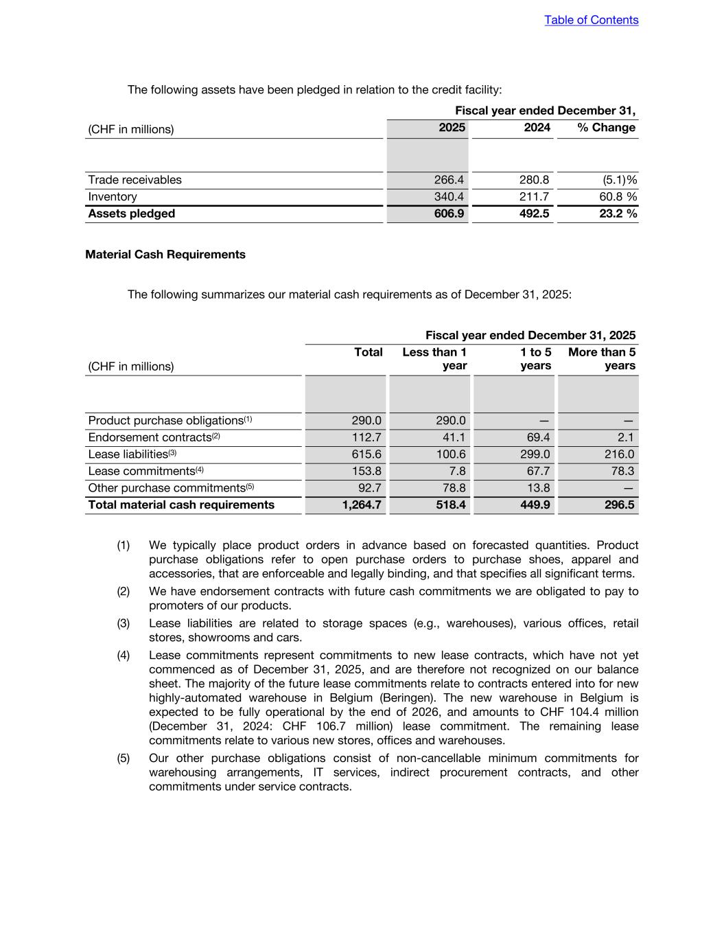 The following assets have been pledged in relation to the credit facility: Fiscal year ended December 31, (CHF in millions) 2025 2024 % Change Trade receivables 266.4 280.8 (5.1) % Inventory 340.4 211.7 60.8 % Assets pledged 606.9 492.5 23.2 % Material Cash Requirements The following summarizes our material cash requirements as of December 31, 2025: Fiscal year ended December 31, 2025 (CHF in millions) Total Less than 1 year 1 to 5 years More than 5 years Product purchase obligations(1) 290.0 290.0 — — Endorsement contracts(2) 112.7 41.1 69.4 2.1 Lease liabilities(3) 615.6 100.6 299.0 216.0 Lease commitments(4) 153.8 7.8 67.7 78.3 Other purchase commitments(5) 92.7 78.8 13.8 — Total material cash requirements 1,264.7 518.4 449.9 296.5 (1) We typically place product orders in advance based on forecasted quantities. Product purchase obligations refer to open purchase orders to purchase shoes, apparel and accessories, that are enforceable and legally binding, and that specifies all significant terms. (2) We have endorsement contracts with future cash commitments we are obligated to pay to promoters of our products. (3) Lease liabilities are related to storage spaces (e.g., warehouses), various offices, retail stores, showrooms and cars. (4) Lease commitments represent commitments to new lease contracts, which have not yet commenced as of December 31, 2025, and are therefore not recognized on our balance sheet. The majority of the future lease commitments relate to contracts entered into for new highly-automated warehouse in Belgium (Beringen). The new warehouse in Belgium is expected to be fully operational by the end of 2026, and amounts to CHF 104.4 million (December 31, 2024: CHF 106.7 million) lease commitment. The remaining lease commitments relate to various new stores, offices and warehouses. (5) Our other purchase obligations consist of non-cancellable minimum commitments for warehousing arrangements, IT services, indirect procurement contracts, and other commitments under service contracts. Table of Contents