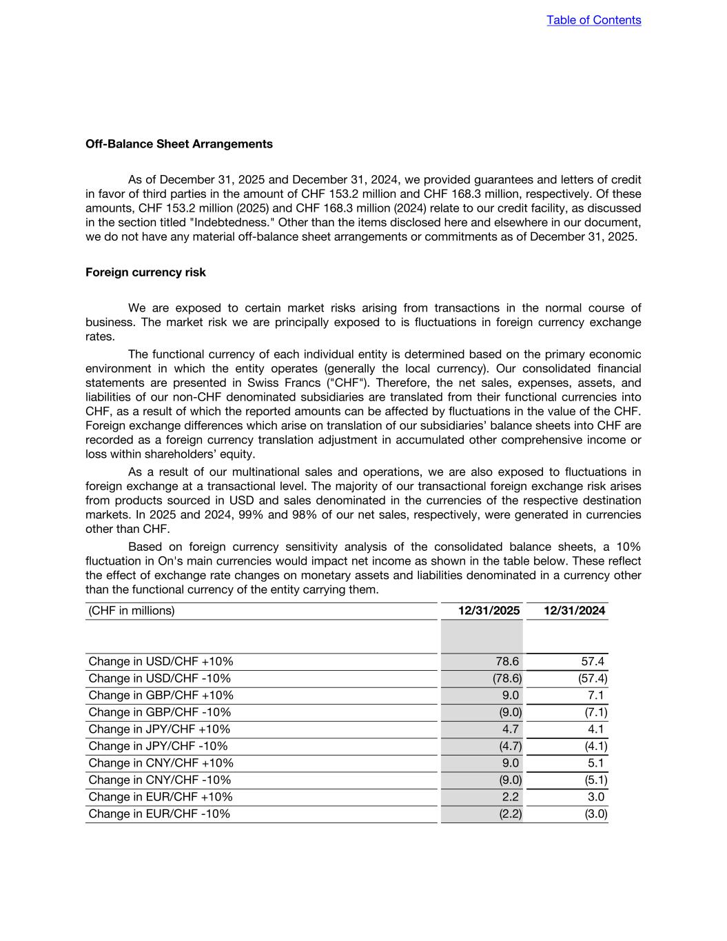 Off-Balance Sheet Arrangements As of December 31, 2025 and December 31, 2024, we provided guarantees and letters of credit in favor of third parties in the amount of CHF 153.2 million and CHF 168.3 million, respectively. Of these amounts, CHF 153.2 million (2025) and CHF 168.3 million (2024) relate to our credit facility, as discussed in the section titled "Indebtedness." Other than the items disclosed here and elsewhere in our document, we do not have any material off-balance sheet arrangements or commitments as of December 31, 2025. Foreign currency risk We are exposed to certain market risks arising from transactions in the normal course of business. The market risk we are principally exposed to is fluctuations in foreign currency exchange rates. The functional currency of each individual entity is determined based on the primary economic environment in which the entity operates (generally the local currency). Our consolidated financial statements are presented in Swiss Francs ("CHF"). Therefore, the net sales, expenses, assets, and liabilities of our non-CHF denominated subsidiaries are translated from their functional currencies into CHF, as a result of which the reported amounts can be affected by fluctuations in the value of the CHF. Foreign exchange differences which arise on translation of our subsidiaries’ balance sheets into CHF are recorded as a foreign currency translation adjustment in accumulated other comprehensive income or loss within shareholders’ equity. As a result of our multinational sales and operations, we are also exposed to fluctuations in foreign exchange at a transactional level. The majority of our transactional foreign exchange risk arises from products sourced in USD and sales denominated in the currencies of the respective destination markets. In 2025 and 2024, 99% and 98% of our net sales, respectively, were generated in currencies other than CHF. Based on foreign currency sensitivity analysis of the consolidated balance sheets, a 10% fluctuation in On's main currencies would impact net income as shown in the table below. These reflect the effect of exchange rate changes on monetary assets and liabilities denominated in a currency other than the functional currency of the entity carrying them. (CHF in millions) 12/31/2025 12/31/2024 Change in USD/CHF +10% 78.6 57.4 Change in USD/CHF -10% (78.6) (57.4) Change in GBP/CHF +10% 9.0 7.1 Change in GBP/CHF -10% (9.0) (7.1) Change in JPY/CHF +10% 4.7 4.1 Change in JPY/CHF -10% (4.7) (4.1) Change in CNY/CHF +10% 9.0 5.1 Change in CNY/CHF -10% (9.0) (5.1) Change in EUR/CHF +10% 2.2 3.0 Change in EUR/CHF -10% (2.2) (3.0) Table of Contents