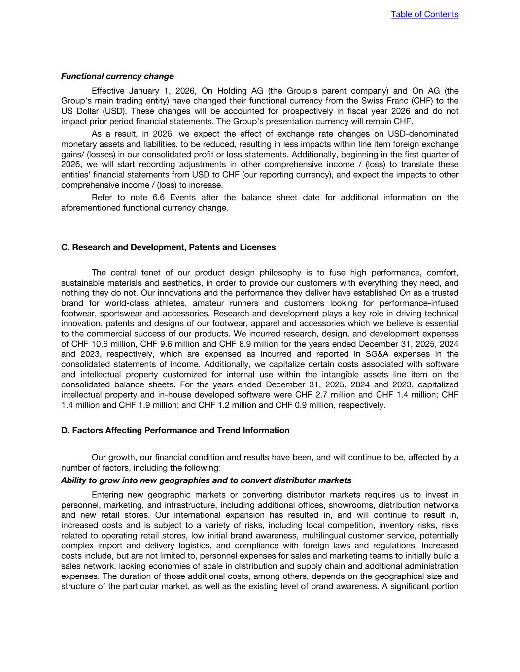 Functional currency change Effective January 1, 2026, On Holding AG (the Group's parent company) and On AG (the Group's main trading entity) have changed their functional currency from the Swiss Franc (CHF) to the US Dollar (USD). These changes will be accounted for prospectively in fiscal year 2026 and do not impact prior period financial statements. The Group’s presentation currency will remain CHF. As a result, in 2026, we expect the effect of exchange rate changes on USD-denominated monetary assets and liabilities, to be reduced, resulting in less impacts within line item foreign exchange gains/ (losses) in our consolidated profit or loss statements. Additionally, beginning in the first quarter of 2026, we will start recording adjustments in other comprehensive income / (loss) to translate these entities' financial statements from USD to CHF (our reporting currency), and expect the impacts to other comprehensive income / (loss) to increase. Refer to note 6.6 Events after the balance sheet date for additional information on the aforementioned functional currency change. C. Research and Development, Patents and Licenses The central tenet of our product design philosophy is to fuse high performance, comfort, sustainable materials and aesthetics, in order to provide our customers with everything they need, and nothing they do not. Our innovations and the performance they deliver have established On as a trusted brand for world-class athletes, amateur runners and customers looking for performance-infused footwear, sportswear and accessories. Research and development plays a key role in driving technical innovation, patents and designs of our footwear, apparel and accessories which we believe is essential to the commercial success of our products. We incurred research, design, and development expenses of CHF 10.6 million, CHF 9.6 million and CHF 8.9 million for the years ended December 31, 2025, 2024 and 2023, respectively, which are expensed as incurred and reported in SG&A expenses in the consolidated statements of income. Additionally, we capitalize certain costs associated with software and intellectual property customized for internal use within the intangible assets line item on the consolidated balance sheets. For the years ended December 31, 2025, 2024 and 2023, capitalized intellectual property and in-house developed software were CHF 2.7 million and CHF 1.4 million; CHF 1.4 million and CHF 1.9 million; and CHF 1.2 million and CHF 0.9 million, respectively. D. Factors Affecting Performance and Trend Information Our growth, our financial condition and results have been, and will continue to be, affected by a number of factors, including the following: Ability to grow into new geographies and to convert distributor markets Entering new geographic markets or converting distributor markets requires us to invest in personnel, marketing, and infrastructure, including additional offices, showrooms, distribution networks and new retail stores. Our international expansion has resulted in, and will continue to result in, increased costs and is subject to a variety of risks, including local competition, inventory risks, risks related to operating retail stores, low initial brand awareness, multilingual customer service, potentially complex import and delivery logistics, and compliance with foreign laws and regulations. Increased costs include, but are not limited to, personnel expenses for sales and marketing teams to initially build a sales network, lacking economies of scale in distribution and supply chain and additional administration expenses. The duration of those additional costs, among others, depends on the geographical size and structure of the particular market, as well as the existing level of brand awareness. A significant portion Table of Contents