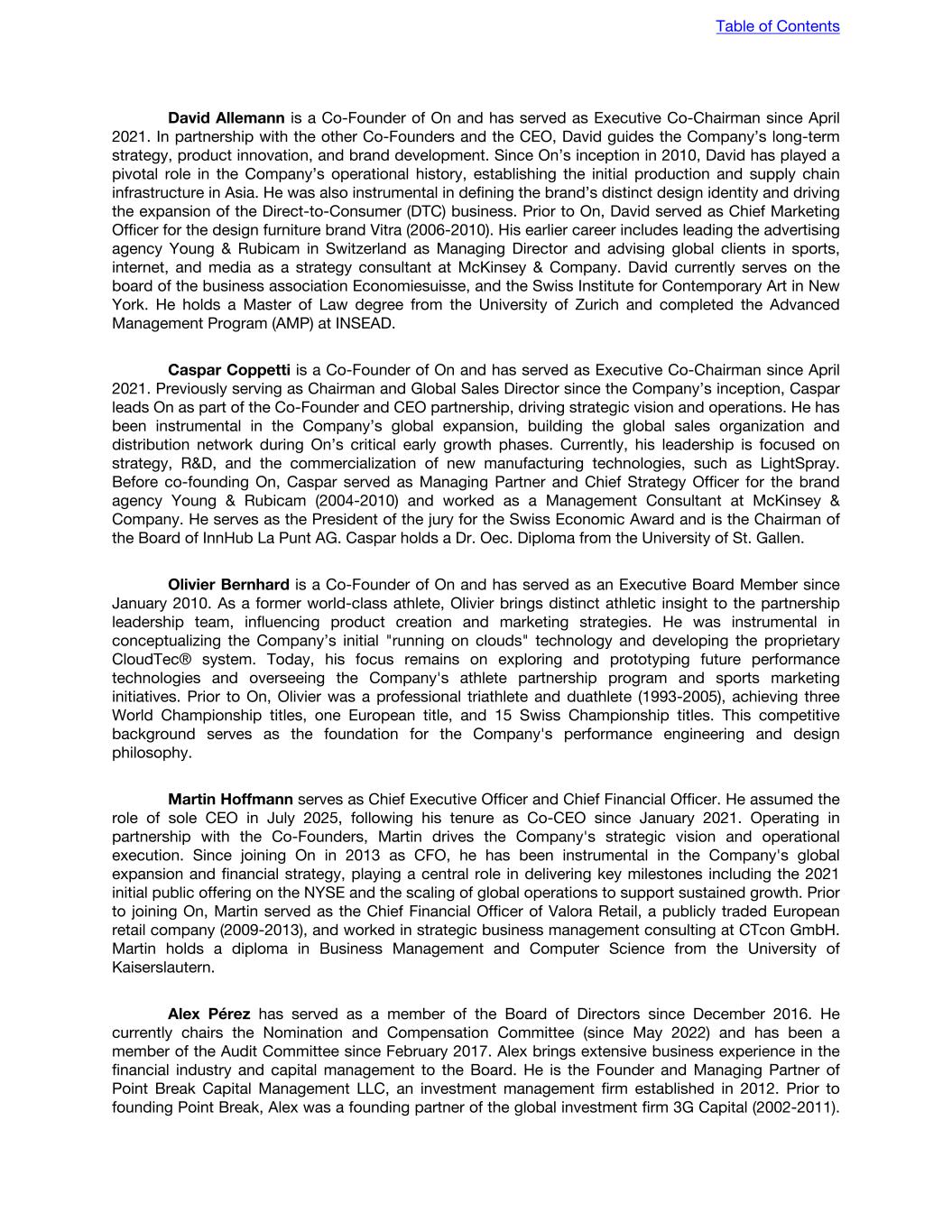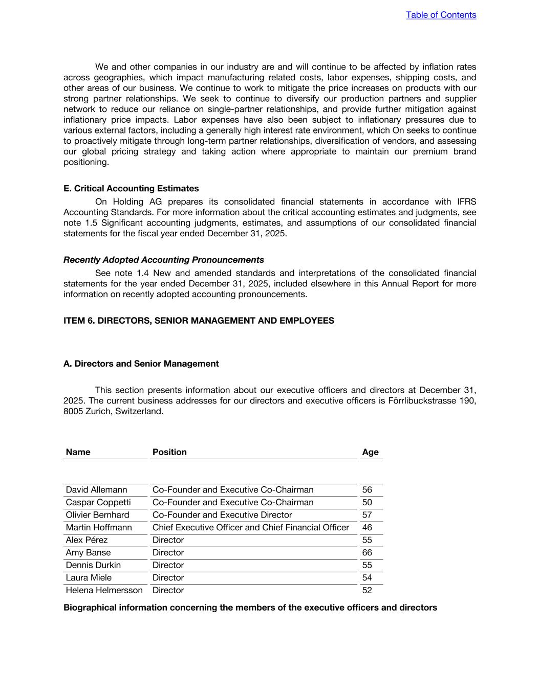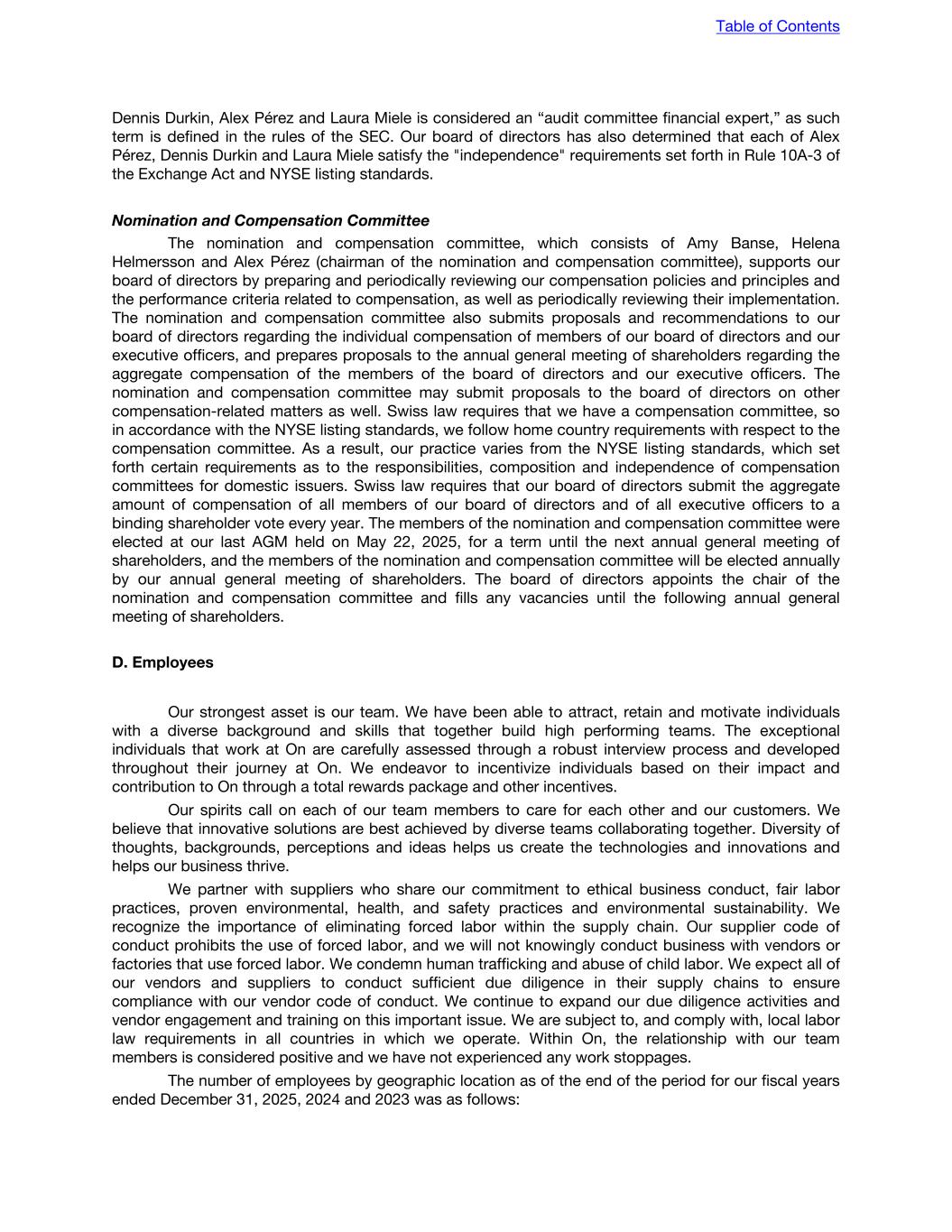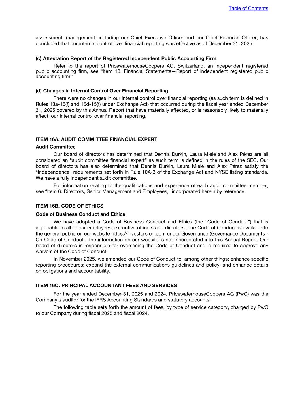 assessment, management, including our Chief Executive Officer and our Chief Financial Officer, has concluded that our internal control over financial reporting was effective as of December 31, 2025. (c) Attestation Report of the Registered Independent Public Accounting Firm Refer to the report of PricewaterhouseCoopers AG, Switzerland, an independent registered public accounting firm, see “Item 18. Financial Statements—Report of independent registered public accounting firm.” (d) Changes in Internal Control Over Financial Reporting There were no changes in our internal control over financial reporting (as such term is defined in Rules 13a-15(f) and 15d-15(f) under Exchange Act) that occurred during the fiscal year ended December 31, 2025 covered by this Annual Report that have materially affected, or is reasonably likely to materially affect, our internal control over financial reporting. ITEM 16A. AUDIT COMMITTEE FINANCIAL EXPERT Audit Committee Our board of directors has determined that Dennis Durkin, Laura Miele and Alex Pérez are all considered an “audit committee financial expert” as such term is defined in the rules of the SEC. Our board of directors has also determined that Dennis Durkin, Laura Miele and Alex Pérez satisfy the “independence” requirements set forth in Rule 10A-3 of the Exchange Act and NYSE listing standards. We have a fully independent audit committee. For information relating to the qualifications and experience of each audit committee member, see “Item 6. Directors, Senior Management and Employees,” incorporated herein by reference. ITEM 16B. CODE OF ETHICS Code of Business Conduct and Ethics We have adopted a Code of Business Conduct and Ethics (the “Code of Conduct”) that is applicable to all of our employees, executive officers and directors. The Code of Conduct is available to the general public on our website https://investors.on.com under Governance (Governance Documents - On Code of Conduct). The information on our website is not incorporated into this Annual Report. Our board of directors is responsible for overseeing the Code of Conduct and is required to approve any waivers of the Code of Conduct. In November 2025, we amended our Code of Conduct to, among other things: enhance specific reporting procedures; expand the external communications guidelines and policy; and enhance details on obligations and accountability. ITEM 16C. PRINCIPAL ACCOUNTANT FEES AND SERVICES For the year ended December 31, 2025 and 2024, PricewaterhouseCoopers AG (PwC) was the Company's auditor for the IFRS Accounting Standards and statutory accounts. The following table sets forth the amount of fees, by type of service category, charged by PwC to our Company during fiscal 2025 and fiscal 2024. Table of Contents