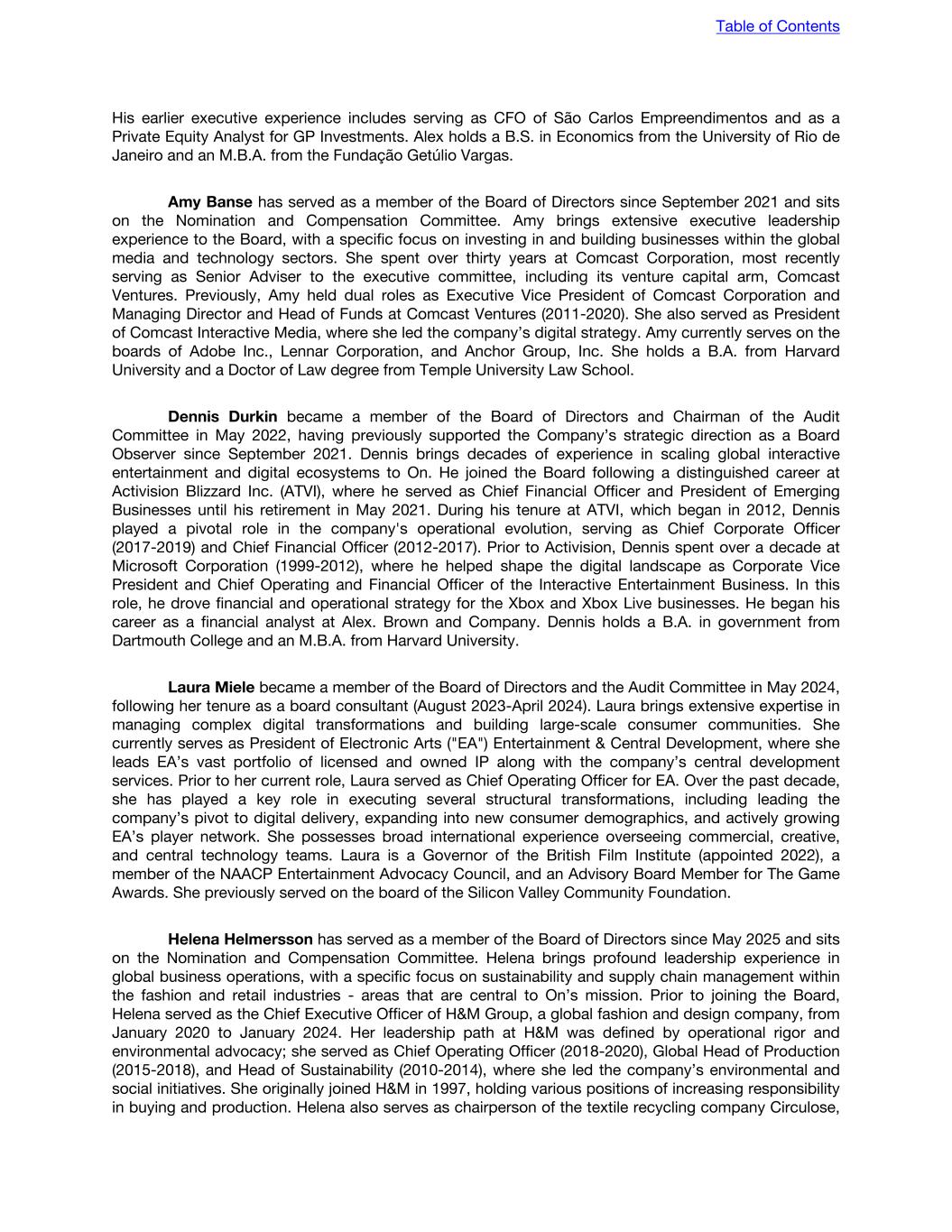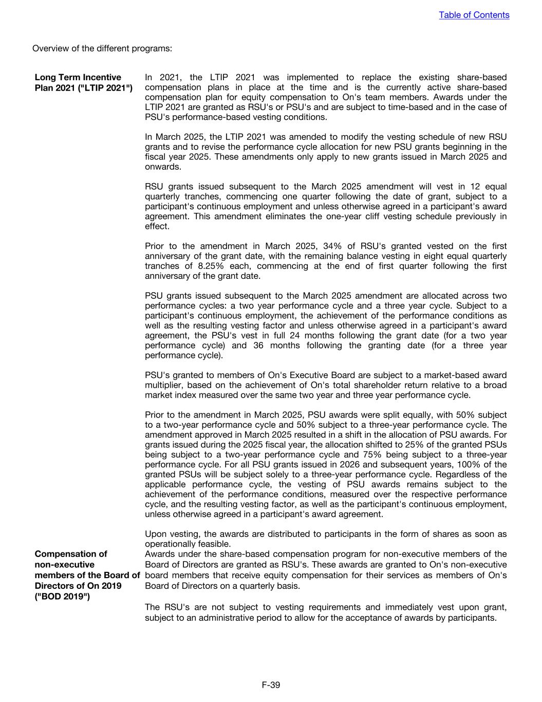 Overview of the different programs: Long Term Incentive Plan 2021 ("LTIP 2021") In 2021, the LTIP 2021 was implemented to replace the existing share-based compensation plans in place at the time and is the currently active share-based compensation plan for equity compensation to On's team members. Awards under the LTIP 2021 are granted as RSU's or PSU's and are subject to time-based and in the case of PSU's performance-based vesting conditions. In March 2025, the LTIP 2021 was amended to modify the vesting schedule of new RSU grants and to revise the performance cycle allocation for new PSU grants beginning in the fiscal year 2025. These amendments only apply to new grants issued in March 2025 and onwards. RSU grants issued subsequent to the March 2025 amendment will vest in 12 equal quarterly tranches, commencing one quarter following the date of grant, subject to a participant's continuous employment and unless otherwise agreed in a participant's award agreement. This amendment eliminates the one-year cliff vesting schedule previously in effect. Prior to the amendment in March 2025, 34% of RSU's granted vested on the first anniversary of the grant date, with the remaining balance vesting in eight equal quarterly tranches of 8.25% each, commencing at the end of first quarter following the first anniversary of the grant date. PSU grants issued subsequent to the March 2025 amendment are allocated across two performance cycles: a two year performance cycle and a three year cycle. Subject to a participant's continuous employment, the achievement of the performance conditions as well as the resulting vesting factor and unless otherwise agreed in a participant's award agreement, the PSU's vest in full 24 months following the grant date (for a two year performance cycle) and 36 months following the granting date (for a three year performance cycle). PSU's granted to members of On's Executive Board are subject to a market-based award multiplier, based on the achievement of On's total shareholder return relative to a broad market index measured over the same two year and three year performance cycle. Prior to the amendment in March 2025, PSU awards were split equally, with 50% subject to a two-year performance cycle and 50% subject to a three-year performance cycle. The amendment approved in March 2025 resulted in a shift in the allocation of PSU awards. For grants issued during the 2025 fiscal year, the allocation shifted to 25% of the granted PSUs being subject to a two-year performance cycle and 75% being subject to a three-year performance cycle. For all PSU grants issued in 2026 and subsequent years, 100% of the granted PSUs will be subject solely to a three-year performance cycle. Regardless of the applicable performance cycle, the vesting of PSU awards remains subject to the achievement of the performance conditions, measured over the respective performance cycle, and the resulting vesting factor, as well as the participant's continuous employment, unless otherwise agreed in a participant's award agreement. Upon vesting, the awards are distributed to participants in the form of shares as soon as operationally feasible. Compensation of non-executive members of the Board of Directors of On 2019 ("BOD 2019") Awards under the share-based compensation program for non-executive members of the Board of Directors are granted as RSU's. These awards are granted to On's non-executive board members that receive equity compensation for their services as members of On's Board of Directors on a quarterly basis. The RSU's are not subject to vesting requirements and immediately vest upon grant, subject to an administrative period to allow for the acceptance of awards by participants. Table of Contents F-39