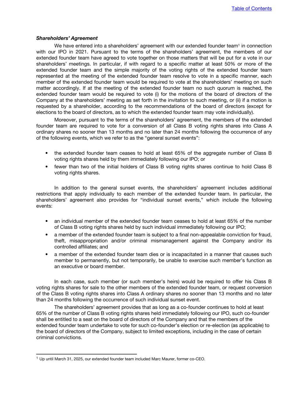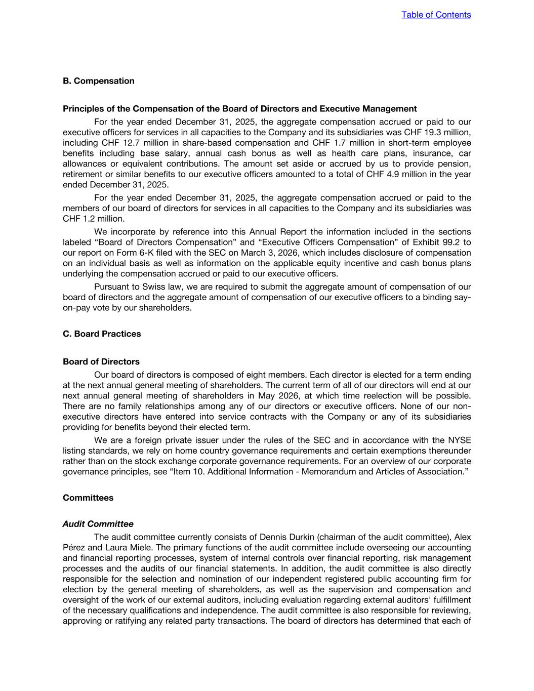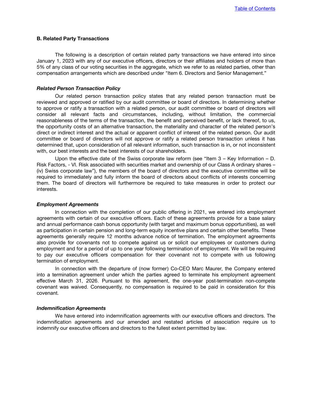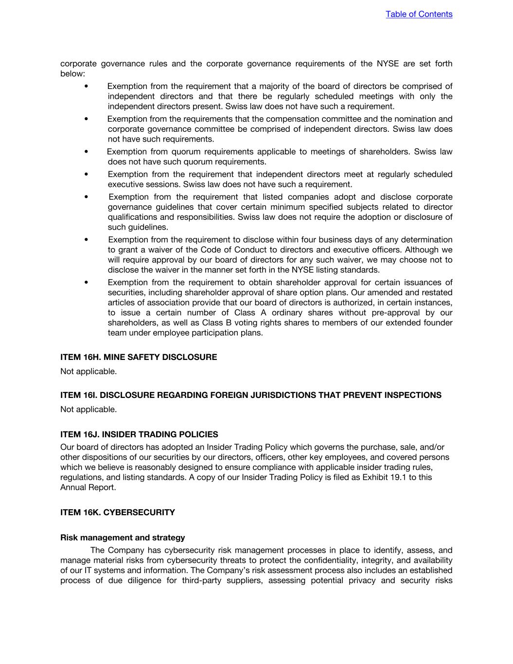 corporate governance rules and the corporate governance requirements of the NYSE are set forth below: • Exemption from the requirement that a majority of the board of directors be comprised of independent directors and that there be regularly scheduled meetings with only the independent directors present. Swiss law does not have such a requirement. • Exemption from the requirements that the compensation committee and the nomination and corporate governance committee be comprised of independent directors. Swiss law does not have such requirements. • Exemption from quorum requirements applicable to meetings of shareholders. Swiss law does not have such quorum requirements. • Exemption from the requirement that independent directors meet at regularly scheduled executive sessions. Swiss law does not have such a requirement. • Exemption from the requirement that listed companies adopt and disclose corporate governance guidelines that cover certain minimum specified subjects related to director qualifications and responsibilities. Swiss law does not require the adoption or disclosure of such guidelines. • Exemption from the requirement to disclose within four business days of any determination to grant a waiver of the Code of Conduct to directors and executive officers. Although we will require approval by our board of directors for any such waiver, we may choose not to disclose the waiver in the manner set forth in the NYSE listing standards. • Exemption from the requirement to obtain shareholder approval for certain issuances of securities, including shareholder approval of share option plans. Our amended and restated articles of association provide that our board of directors is authorized, in certain instances, to issue a certain number of Class A ordinary shares without pre-approval by our shareholders, as well as Class B voting rights shares to members of our extended founder team under employee participation plans. ITEM 16H. MINE SAFETY DISCLOSURE Not applicable. ITEM 16I. DISCLOSURE REGARDING FOREIGN JURISDICTIONS THAT PREVENT INSPECTIONS Not applicable. ITEM 16J. INSIDER TRADING POLICIES Our board of directors has adopted an Insider Trading Policy which governs the purchase, sale, and/or other dispositions of our securities by our directors, officers, other key employees, and covered persons which we believe is reasonably designed to ensure compliance with applicable insider trading rules, regulations, and listing standards. A copy of our Insider Trading Policy is filed as Exhibit 19.1 to this Annual Report. ITEM 16K. CYBERSECURITY Risk management and strategy The Company has cybersecurity risk management processes in place to identify, assess, and manage material risks from cybersecurity threats to protect the confidentiality, integrity, and availability of our IT systems and information. The Company’s risk assessment process also includes an established process of due diligence for third-party suppliers, assessing potential privacy and security risks Table of Contents
