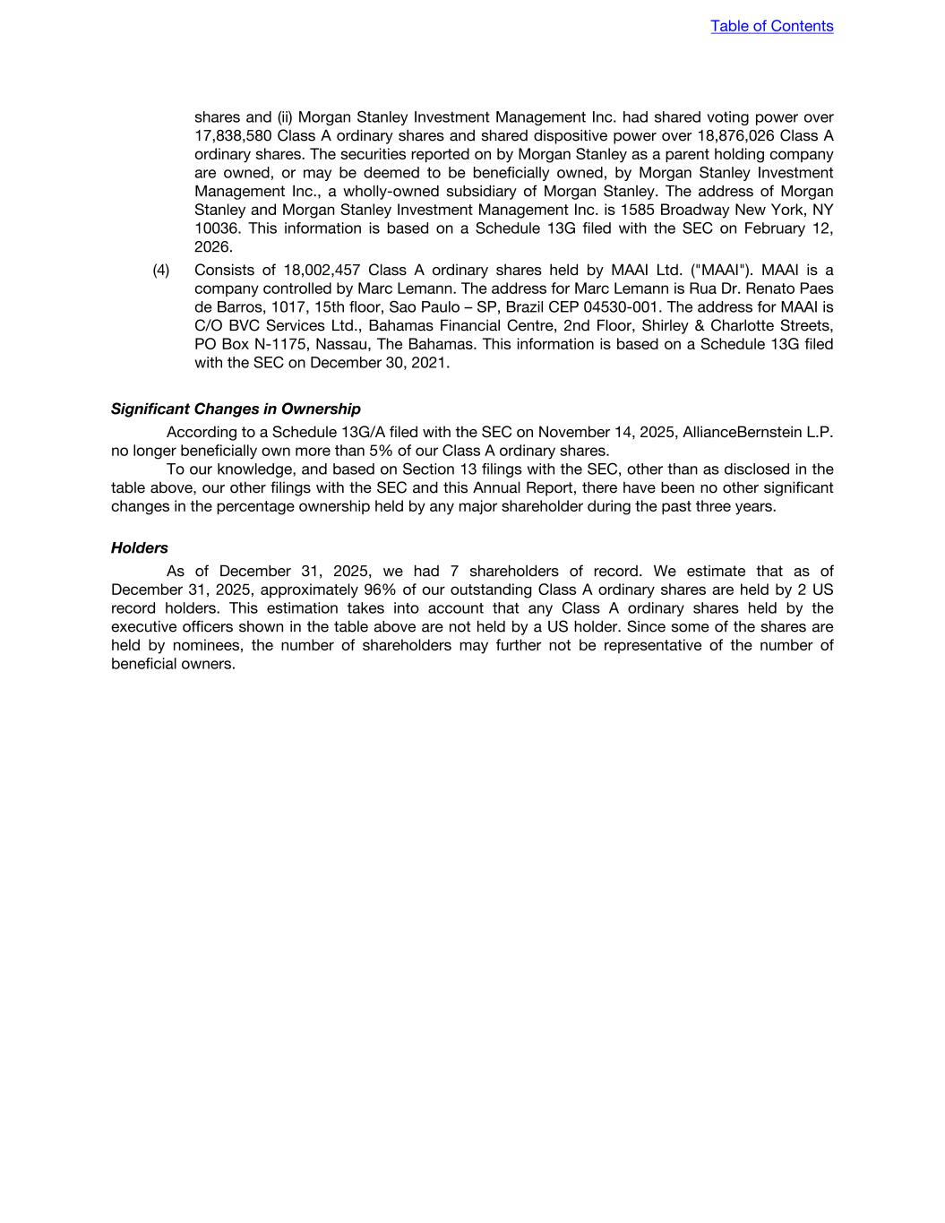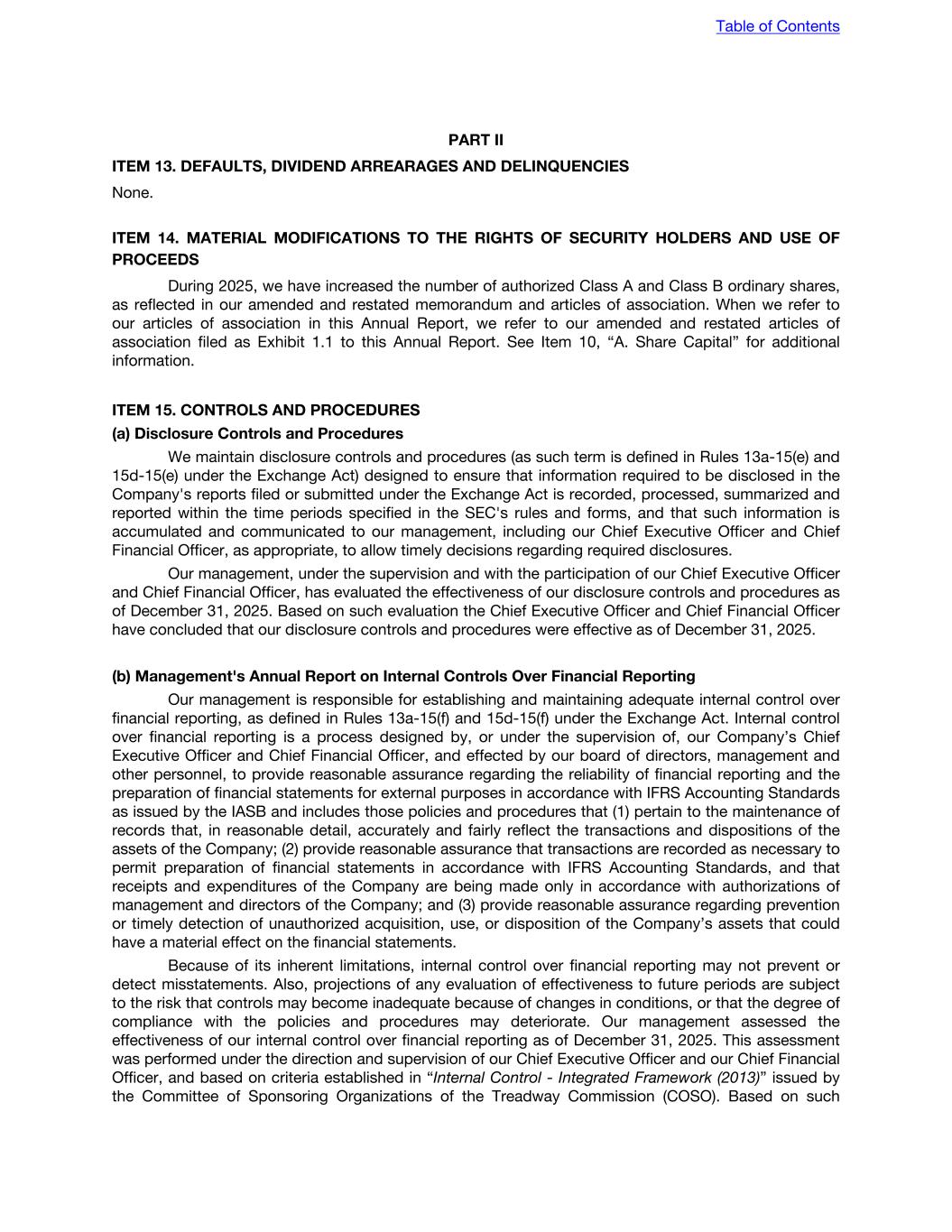 PART II ITEM 13. DEFAULTS, DIVIDEND ARREARAGES AND DELINQUENCIES None. ITEM 14. MATERIAL MODIFICATIONS TO THE RIGHTS OF SECURITY HOLDERS AND USE OF PROCEEDS During 2025, we have increased the number of authorized Class A and Class B ordinary shares, as reflected in our amended and restated memorandum and articles of association. When we refer to our articles of association in this Annual Report, we refer to our amended and restated articles of association filed as Exhibit 1.1 to this Annual Report. See Item 10, “A. Share Capital” for additional information. ITEM 15. CONTROLS AND PROCEDURES (a) Disclosure Controls and Procedures We maintain disclosure controls and procedures (as such term is defined in Rules 13a-15(e) and 15d-15(e) under the Exchange Act) designed to ensure that information required to be disclosed in the Company's reports filed or submitted under the Exchange Act is recorded, processed, summarized and reported within the time periods specified in the SEC's rules and forms, and that such information is accumulated and communicated to our management, including our Chief Executive Officer and Chief Financial Officer, as appropriate, to allow timely decisions regarding required disclosures. Our management, under the supervision and with the participation of our Chief Executive Officer and Chief Financial Officer, has evaluated the effectiveness of our disclosure controls and procedures as of December 31, 2025. Based on such evaluation the Chief Executive Officer and Chief Financial Officer have concluded that our disclosure controls and procedures were effective as of December 31, 2025. (b) Management's Annual Report on Internal Controls Over Financial Reporting Our management is responsible for establishing and maintaining adequate internal control over financial reporting, as defined in Rules 13a-15(f) and 15d-15(f) under the Exchange Act. Internal control over financial reporting is a process designed by, or under the supervision of, our Company’s Chief Executive Officer and Chief Financial Officer, and effected by our board of directors, management and other personnel, to provide reasonable assurance regarding the reliability of financial reporting and the preparation of financial statements for external purposes in accordance with IFRS Accounting Standards as issued by the IASB and includes those policies and procedures that (1) pertain to the maintenance of records that, in reasonable detail, accurately and fairly reflect the transactions and dispositions of the assets of the Company; (2) provide reasonable assurance that transactions are recorded as necessary to permit preparation of financial statements in accordance with IFRS Accounting Standards, and that receipts and expenditures of the Company are being made only in accordance with authorizations of management and directors of the Company; and (3) provide reasonable assurance regarding prevention or timely detection of unauthorized acquisition, use, or disposition of the Company’s assets that could have a material effect on the financial statements. Because of its inherent limitations, internal control over financial reporting may not prevent or detect misstatements. Also, projections of any evaluation of effectiveness to future periods are subject to the risk that controls may become inadequate because of changes in conditions, or that the degree of compliance with the policies and procedures may deteriorate. Our management assessed the effectiveness of our internal control over financial reporting as of December 31, 2025. This assessment was performed under the direction and supervision of our Chief Executive Officer and our Chief Financial Officer, and based on criteria established in “Internal Control - Integrated Framework (2013)” issued by the Committee of Sponsoring Organizations of the Treadway Commission (COSO). Based on such Table of Contents