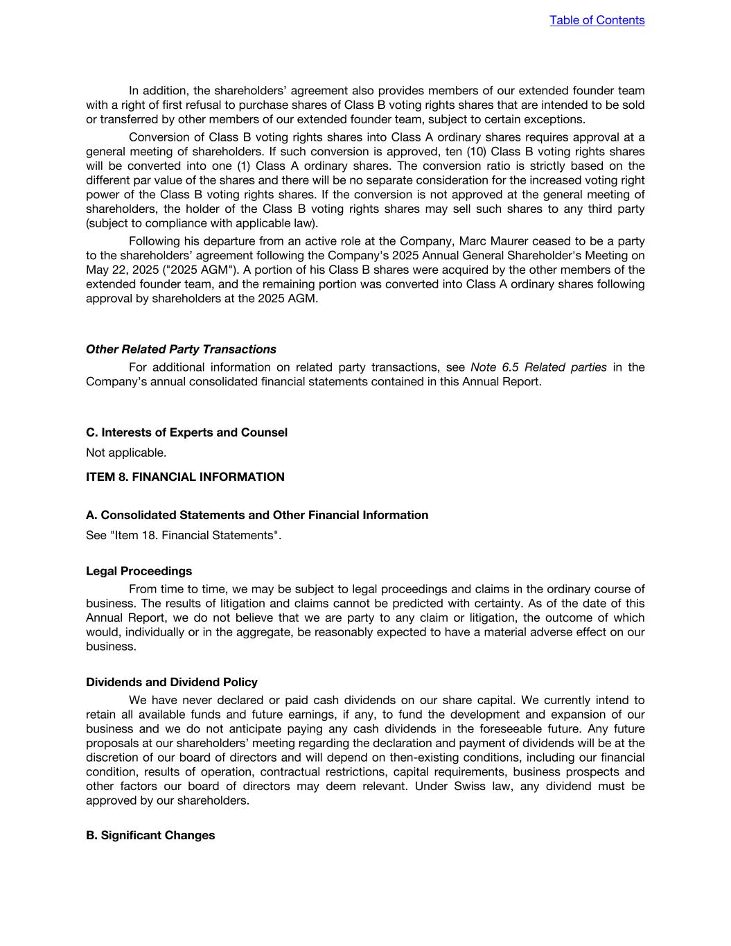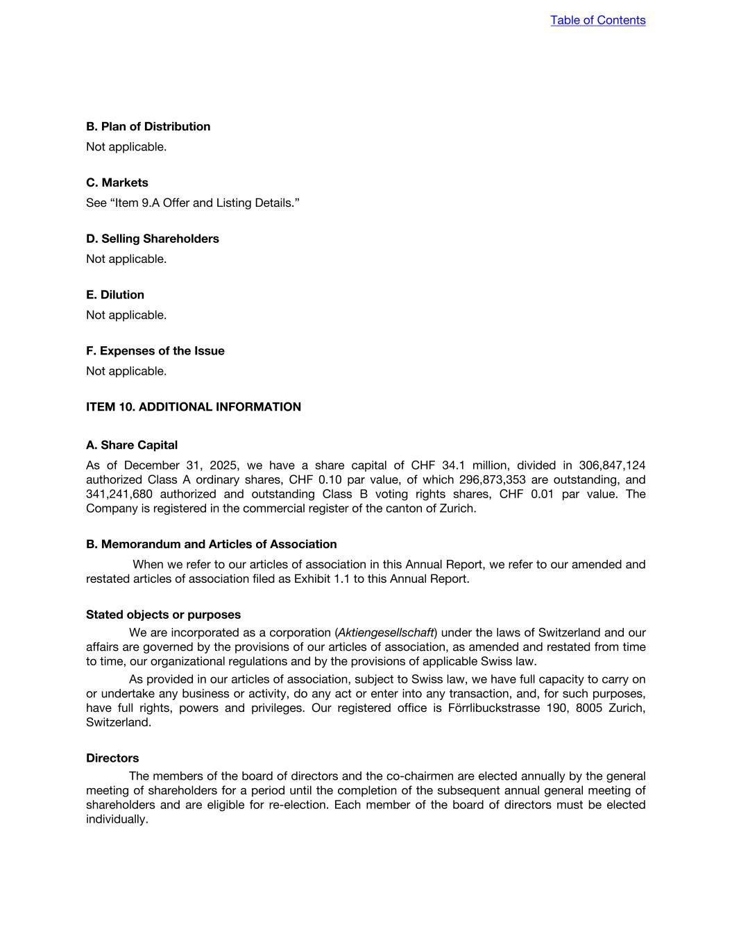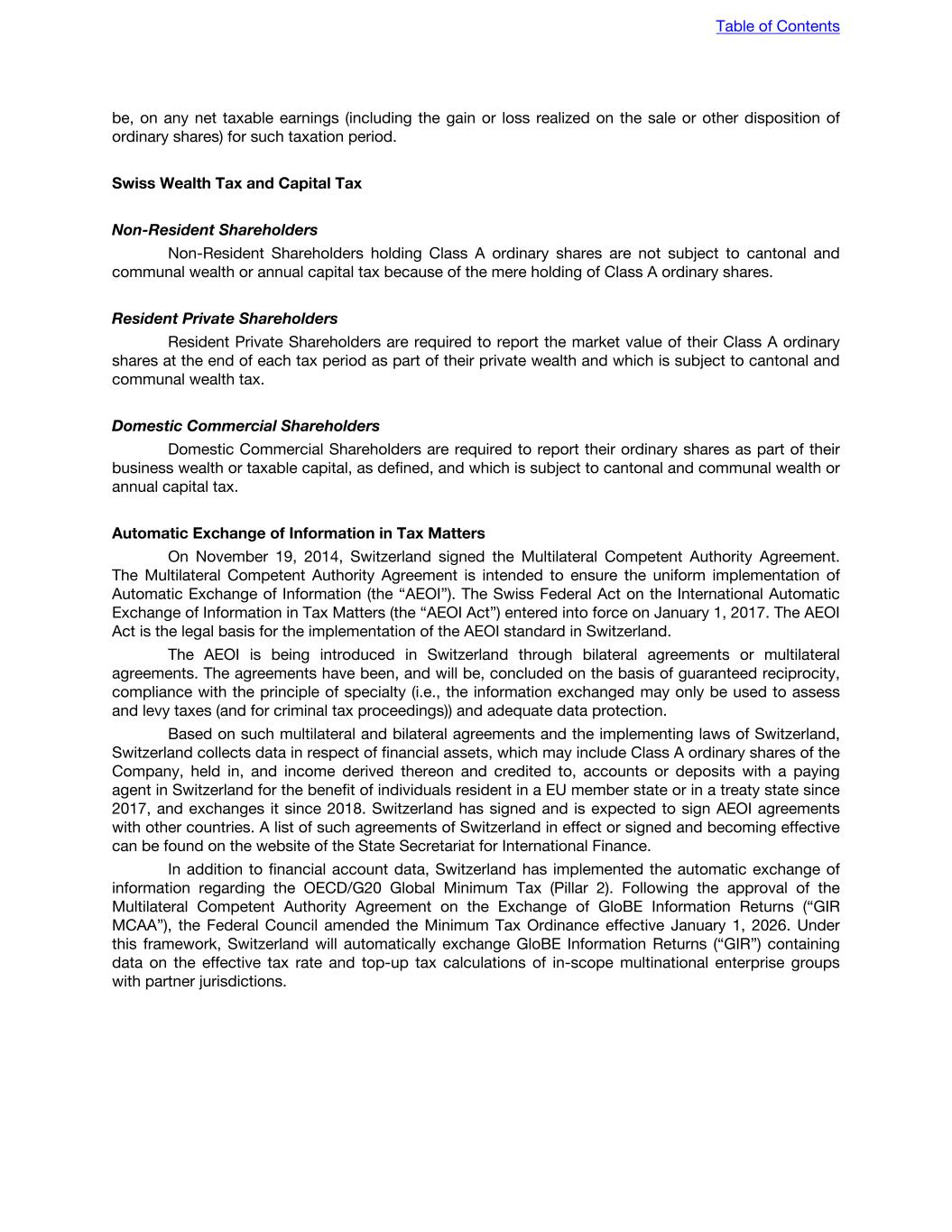 be, on any net taxable earnings (including the gain or loss realized on the sale or other disposition of ordinary shares) for such taxation period. Swiss Wealth Tax and Capital Tax Non-Resident Shareholders Non-Resident Shareholders holding Class A ordinary shares are not subject to cantonal and communal wealth or annual capital tax because of the mere holding of Class A ordinary shares. Resident Private Shareholders Resident Private Shareholders are required to report the market value of their Class A ordinary shares at the end of each tax period as part of their private wealth and which is subject to cantonal and communal wealth tax. Domestic Commercial Shareholders Domestic Commercial Shareholders are required to report their ordinary shares as part of their business wealth or taxable capital, as defined, and which is subject to cantonal and communal wealth or annual capital tax. Automatic Exchange of Information in Tax Matters On November 19, 2014, Switzerland signed the Multilateral Competent Authority Agreement. The Multilateral Competent Authority Agreement is intended to ensure the uniform implementation of Automatic Exchange of Information (the “AEOI”). The Swiss Federal Act on the International Automatic Exchange of Information in Tax Matters (the “AEOI Act”) entered into force on January 1, 2017. The AEOI Act is the legal basis for the implementation of the AEOI standard in Switzerland. The AEOI is being introduced in Switzerland through bilateral agreements or multilateral agreements. The agreements have been, and will be, concluded on the basis of guaranteed reciprocity, compliance with the principle of specialty (i.e., the information exchanged may only be used to assess and levy taxes (and for criminal tax proceedings)) and adequate data protection. Based on such multilateral and bilateral agreements and the implementing laws of Switzerland, Switzerland collects data in respect of financial assets, which may include Class A ordinary shares of the Company, held in, and income derived thereon and credited to, accounts or deposits with a paying agent in Switzerland for the benefit of individuals resident in a EU member state or in a treaty state since 2017, and exchanges it since 2018. Switzerland has signed and is expected to sign AEOI agreements with other countries. A list of such agreements of Switzerland in effect or signed and becoming effective can be found on the website of the State Secretariat for International Finance. In addition to financial account data, Switzerland has implemented the automatic exchange of information regarding the OECD/G20 Global Minimum Tax (Pillar 2). Following the approval of the Multilateral Competent Authority Agreement on the Exchange of GloBE Information Returns (“GIR MCAA”), the Federal Council amended the Minimum Tax Ordinance effective January 1, 2026. Under this framework, Switzerland will automatically exchange GloBE Information Returns (“GIR”) containing data on the effective tax rate and top-up tax calculations of in-scope multinational enterprise groups with partner jurisdictions. Table of Contents