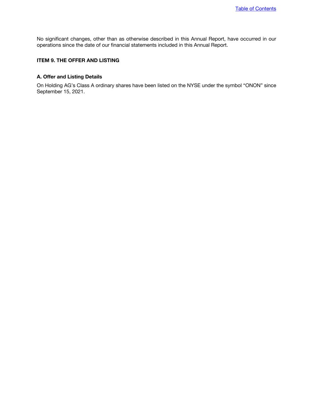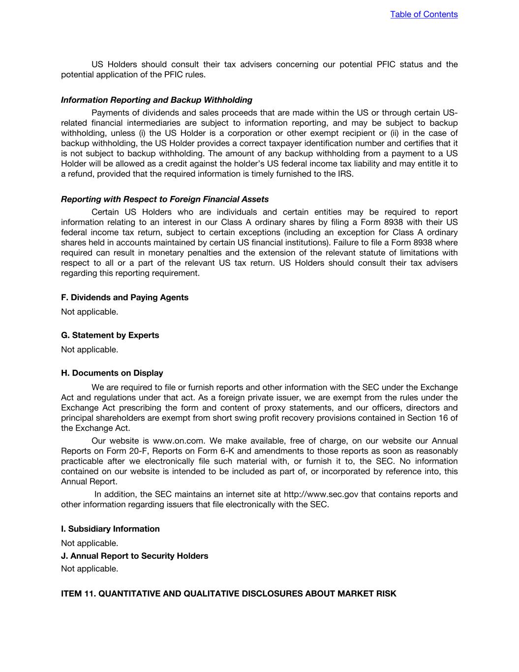 US Holders should consult their tax advisers concerning our potential PFIC status and the potential application of the PFIC rules. Information Reporting and Backup Withholding Payments of dividends and sales proceeds that are made within the US or through certain US- related financial intermediaries are subject to information reporting, and may be subject to backup withholding, unless (i) the US Holder is a corporation or other exempt recipient or (ii) in the case of backup withholding, the US Holder provides a correct taxpayer identification number and certifies that it is not subject to backup withholding. The amount of any backup withholding from a payment to a US Holder will be allowed as a credit against the holder’s US federal income tax liability and may entitle it to a refund, provided that the required information is timely furnished to the IRS. Reporting with Respect to Foreign Financial Assets Certain US Holders who are individuals and certain entities may be required to report information relating to an interest in our Class A ordinary shares by filing a Form 8938 with their US federal income tax return, subject to certain exceptions (including an exception for Class A ordinary shares held in accounts maintained by certain US financial institutions). Failure to file a Form 8938 where required can result in monetary penalties and the extension of the relevant statute of limitations with respect to all or a part of the relevant US tax return. US Holders should consult their tax advisers regarding this reporting requirement. F. Dividends and Paying Agents Not applicable. G. Statement by Experts Not applicable. H. Documents on Display We are required to file or furnish reports and other information with the SEC under the Exchange Act and regulations under that act. As a foreign private issuer, we are exempt from the rules under the Exchange Act prescribing the form and content of proxy statements, and our officers, directors and principal shareholders are exempt from short swing profit recovery provisions contained in Section 16 of the Exchange Act. Our website is www.on.com. We make available, free of charge, on our website our Annual Reports on Form 20-F, Reports on Form 6-K and amendments to those reports as soon as reasonably practicable after we electronically file such material with, or furnish it to, the SEC. No information contained on our website is intended to be included as part of, or incorporated by reference into, this Annual Report. In addition, the SEC maintains an internet site at http://www.sec.gov that contains reports and other information regarding issuers that file electronically with the SEC. I. Subsidiary Information Not applicable. J. Annual Report to Security Holders Not applicable. ITEM 11. QUANTITATIVE AND QUALITATIVE DISCLOSURES ABOUT MARKET RISK Table of Contents