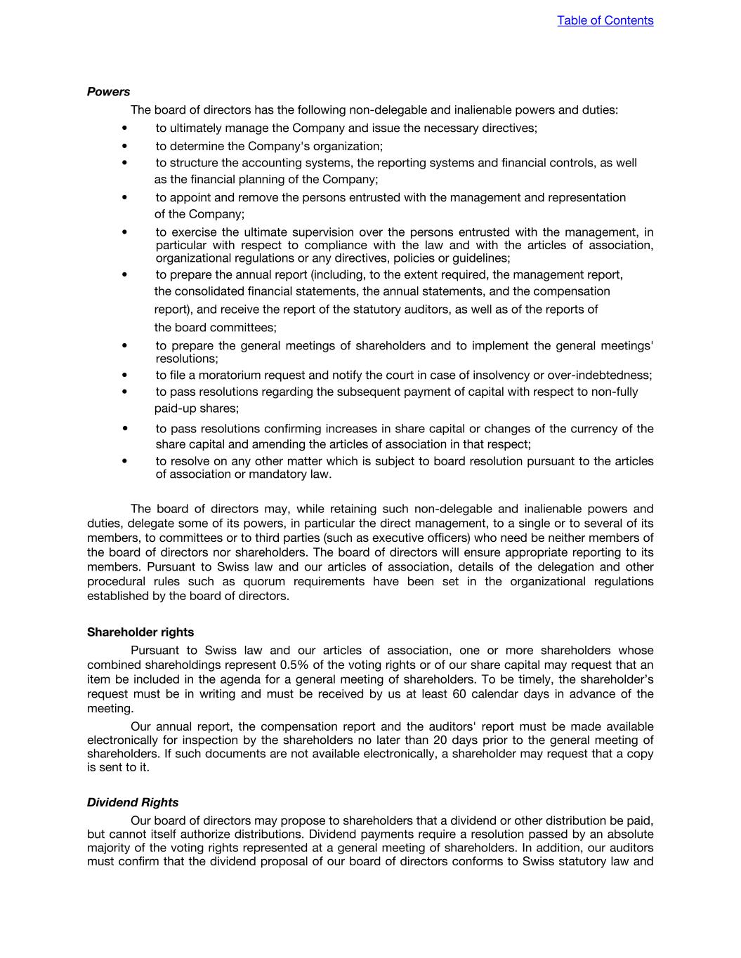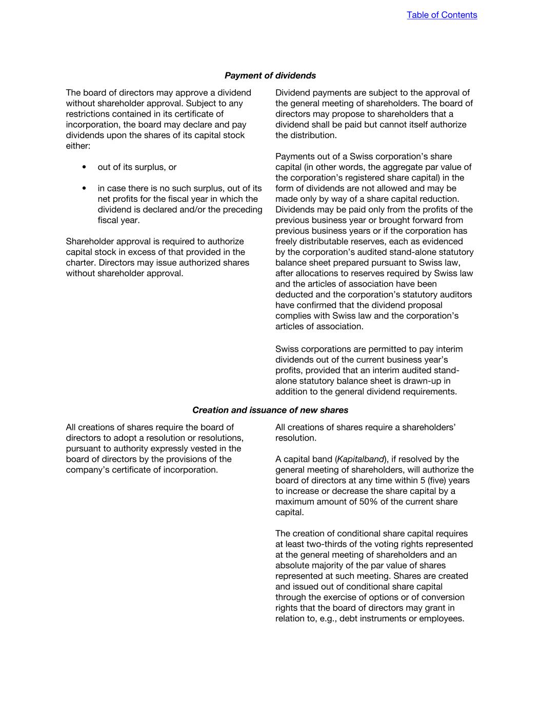 Payment of dividends The board of directors may approve a dividend without shareholder approval. Subject to any restrictions contained in its certificate of incorporation, the board may declare and pay dividends upon the shares of its capital stock either: • out of its surplus, or • in case there is no such surplus, out of its net profits for the fiscal year in which the dividend is declared and/or the preceding fiscal year. Shareholder approval is required to authorize capital stock in excess of that provided in the charter. Directors may issue authorized shares without shareholder approval. Dividend payments are subject to the approval of the general meeting of shareholders. The board of directors may propose to shareholders that a dividend shall be paid but cannot itself authorize the distribution. Payments out of a Swiss corporation’s share capital (in other words, the aggregate par value of the corporation’s registered share capital) in the form of dividends are not allowed and may be made only by way of a share capital reduction. Dividends may be paid only from the profits of the previous business year or brought forward from previous business years or if the corporation has freely distributable reserves, each as evidenced by the corporation’s audited stand-alone statutory balance sheet prepared pursuant to Swiss law, after allocations to reserves required by Swiss law and the articles of association have been deducted and the corporation’s statutory auditors have confirmed that the dividend proposal complies with Swiss law and the corporation’s articles of association. Swiss corporations are permitted to pay interim dividends out of the current business year’s profits, provided that an interim audited stand- alone statutory balance sheet is drawn-up in addition to the general dividend requirements. Creation and issuance of new shares All creations of shares require the board of directors to adopt a resolution or resolutions, pursuant to authority expressly vested in the board of directors by the provisions of the company’s certificate of incorporation. All creations of shares require a shareholders’ resolution. A capital band (Kapitalband), if resolved by the general meeting of shareholders, will authorize the board of directors at any time within 5 (five) years to increase or decrease the share capital by a maximum amount of 50% of the current share capital. The creation of conditional share capital requires at least two-thirds of the voting rights represented at the general meeting of shareholders and an absolute majority of the par value of shares represented at such meeting. Shares are created and issued out of conditional share capital through the exercise of options or of conversion rights that the board of directors may grant in relation to, e.g., debt instruments or employees. Table of Contents