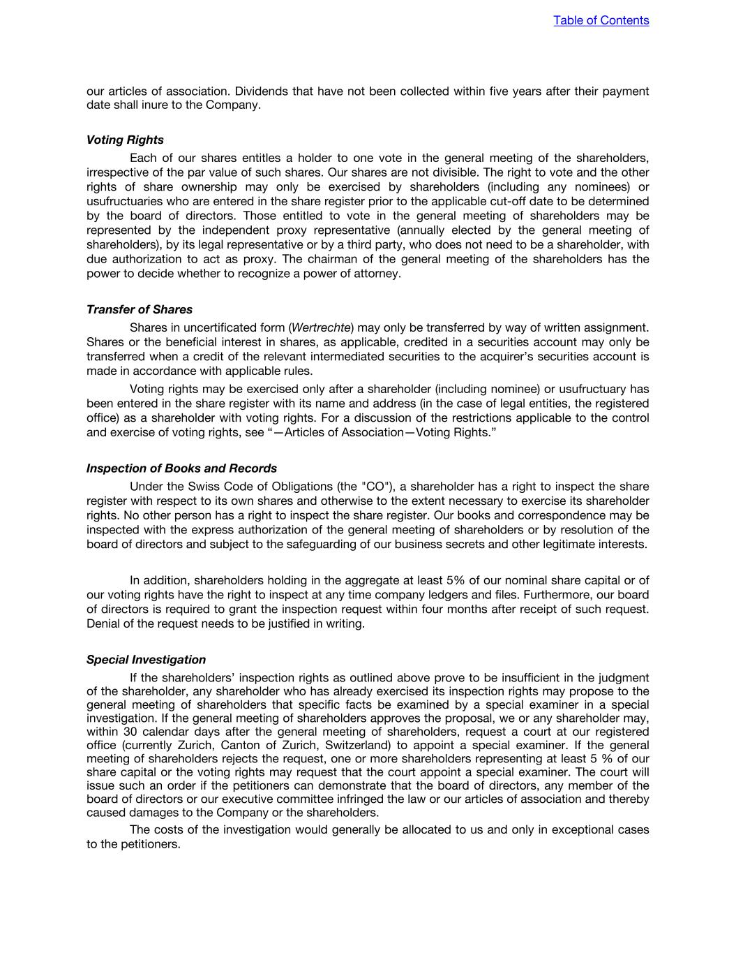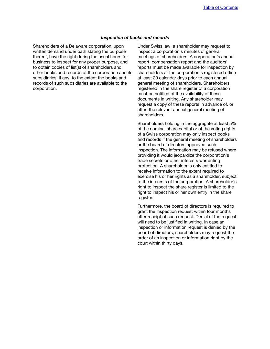 Inspection of books and records Shareholders of a Delaware corporation, upon written demand under oath stating the purpose thereof, have the right during the usual hours for business to inspect for any proper purpose, and to obtain copies of list(s) of shareholders and other books and records of the corporation and its subsidiaries, if any, to the extent the books and records of such subsidiaries are available to the corporation. Under Swiss law, a shareholder may request to inspect a corporation’s minutes of general meetings of shareholders. A corporation’s annual report, compensation report and the auditors’ reports must be made available for inspection by shareholders at the corporation’s registered office at least 20 calendar days prior to each annual general meeting of shareholders. Shareholders registered in the share register of a corporation must be notified of the availability of these documents in writing. Any shareholder may request a copy of these reports in advance of, or after, the relevant annual general meeting of shareholders. Shareholders holding in the aggregate at least 5% of the nominal share capital or of the voting rights of a Swiss corporation may only inspect books and records if the general meeting of shareholders or the board of directors approved such inspection. The information may be refused where providing it would jeopardize the corporation’s trade secrets or other interests warranting protection. A shareholder is only entitled to receive information to the extent required to exercise his or her rights as a shareholder, subject to the interests of the corporation. A shareholder’s right to inspect the share register is limited to the right to inspect his or her own entry in the share register. Furthermore, the board of directors is required to grant the inspection request within four months after receipt of such request. Denial of the request will need to be justified in writing. In case an inspection or information request is denied by the board of directors, shareholders may request the order of an inspection or information right by the court within thirty days. Table of Contents