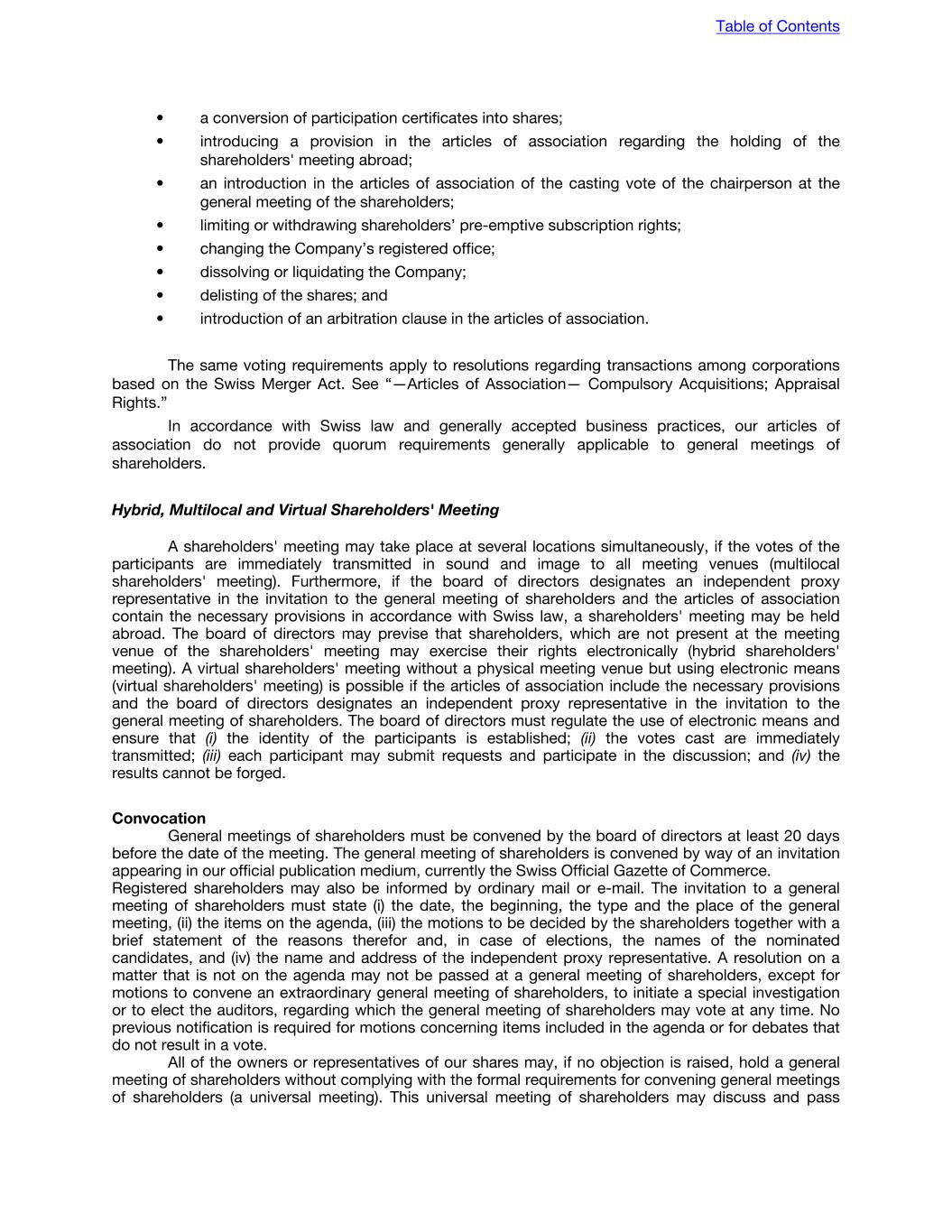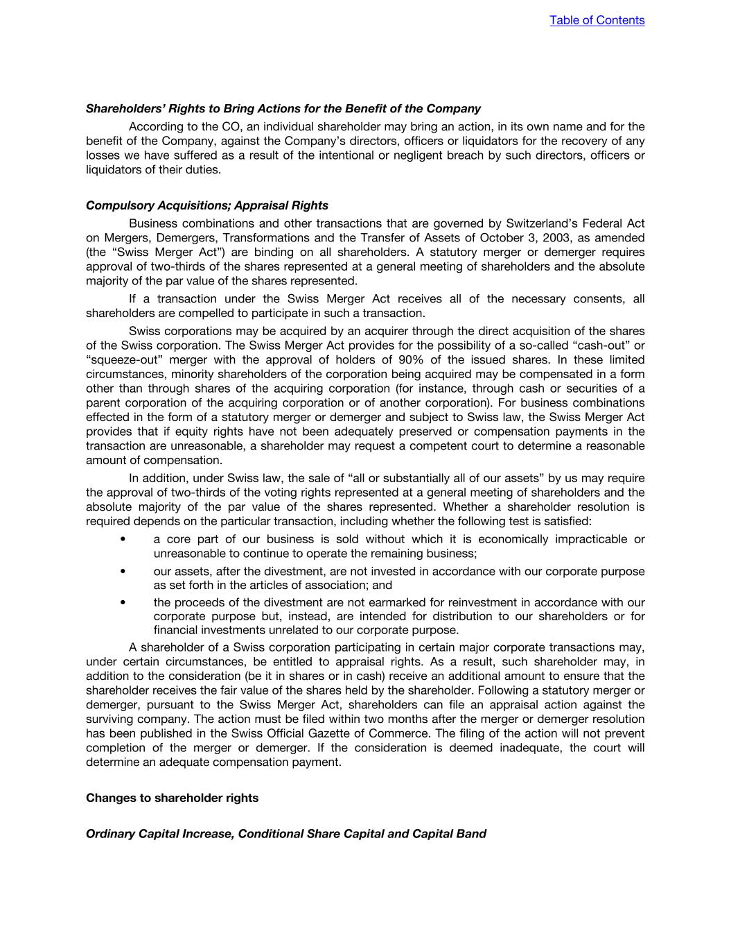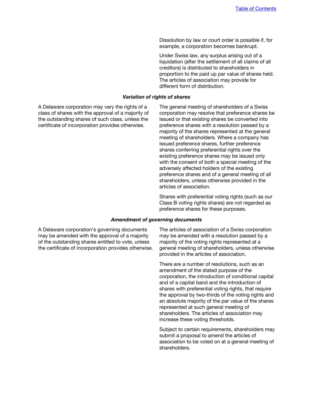 Dissolution by law or court order is possible if, for example, a corporation becomes bankrupt. Under Swiss law, any surplus arising out of a liquidation (after the settlement of all claims of all creditors) is distributed to shareholders in proportion to the paid up par value of shares held. The articles of association may provide for different form of distribution. Variation of rights of shares A Delaware corporation may vary the rights of a class of shares with the approval of a majority of the outstanding shares of such class, unless the certificate of incorporation provides otherwise. The general meeting of shareholders of a Swiss corporation may resolve that preference shares be issued or that existing shares be converted into preference shares with a resolution passed by a majority of the shares represented at the general meeting of shareholders. Where a company has issued preference shares, further preference shares conferring preferential rights over the existing preference shares may be issued only with the consent of both a special meeting of the adversely affected holders of the existing preference shares and of a general meeting of all shareholders, unless otherwise provided in the articles of association. Shares with preferential voting rights (such as our Class B voting rights shares) are not regarded as preference shares for these purposes. Amendment of governing documents A Delaware corporation’s governing documents may be amended with the approval of a majority of the outstanding shares entitled to vote, unless the certificate of incorporation provides otherwise. The articles of association of a Swiss corporation may be amended with a resolution passed by a majority of the voting rights represented at a general meeting of shareholders, unless otherwise provided in the articles of association. There are a number of resolutions, such as an amendment of the stated purpose of the corporation, the introduction of conditional capital and of a capital band and the introduction of shares with preferential voting rights, that require the approval by two-thirds of the voting rights and an absolute majority of the par value of the shares represented at such general meeting of shareholders. The articles of association may increase these voting thresholds. Subject to certain requirements, shareholders may submit a proposal to amend the articles of association to be voted on at a general meeting of shareholders. Table of Contents