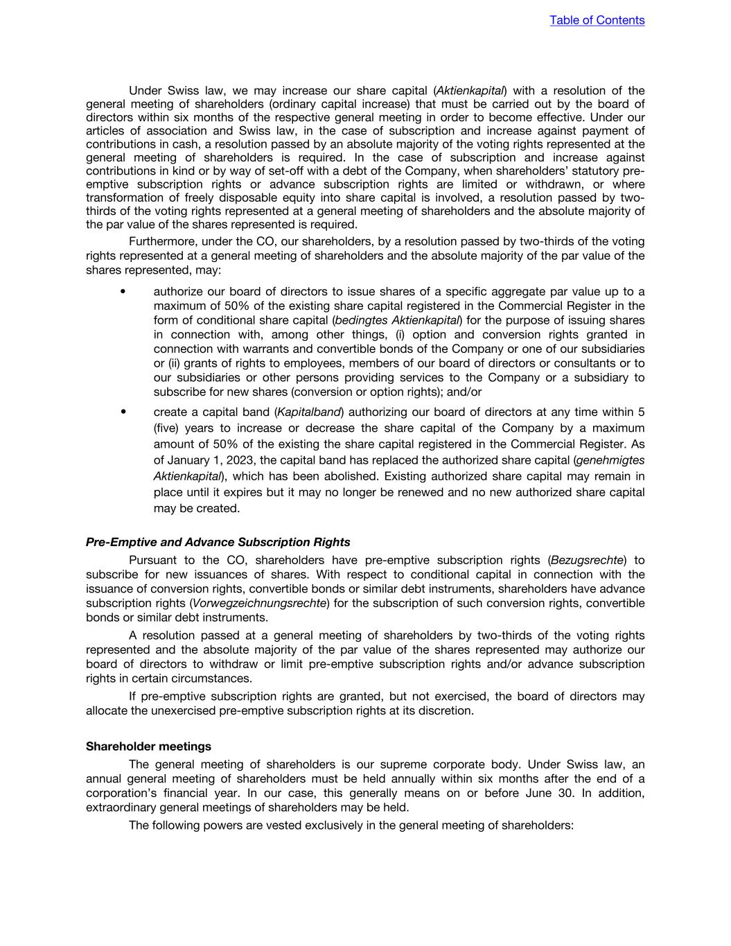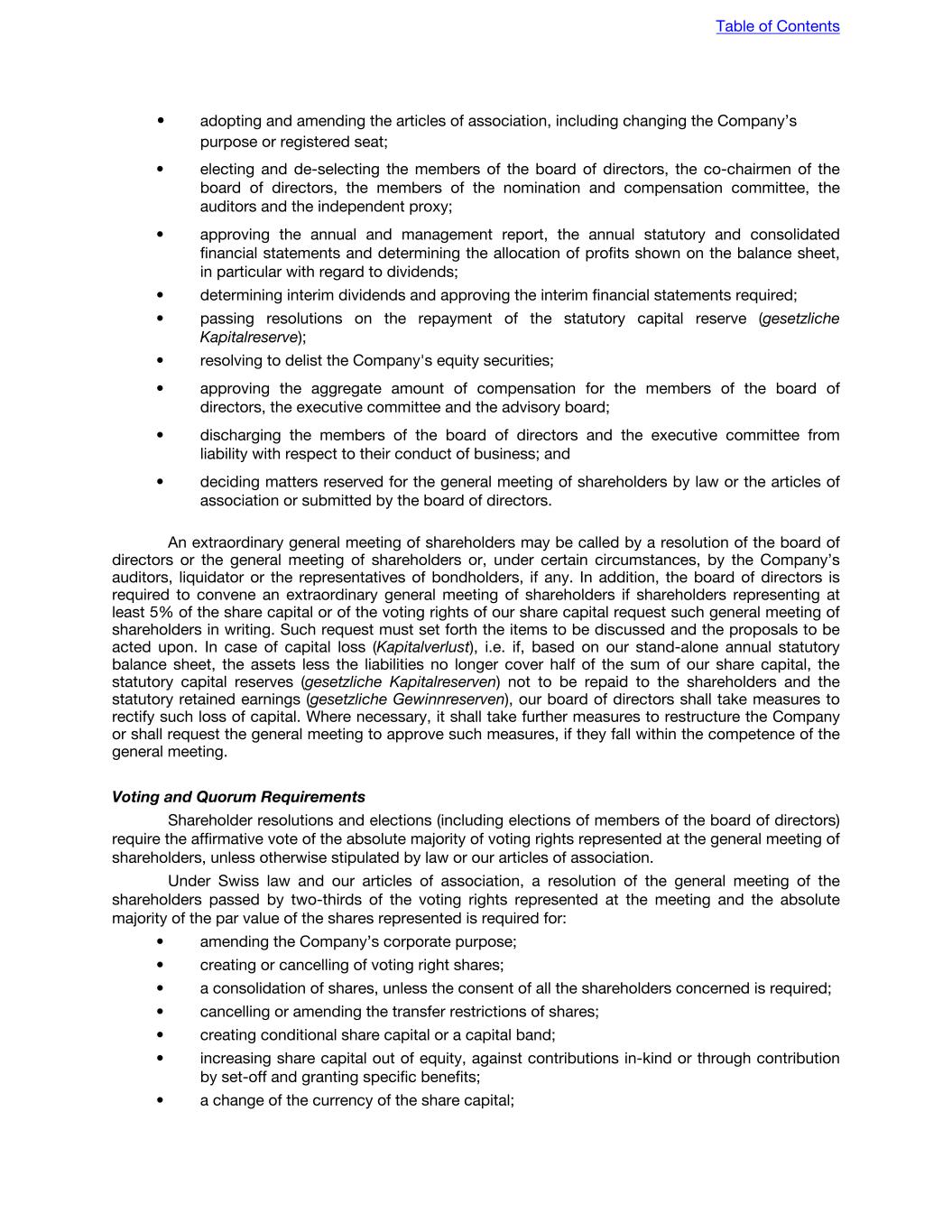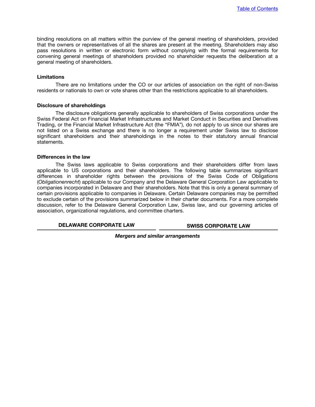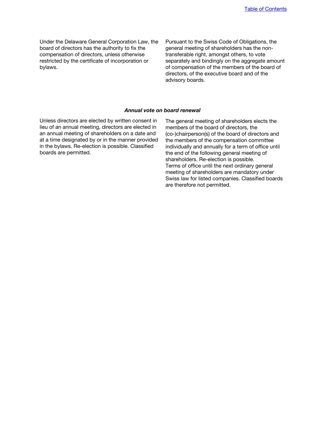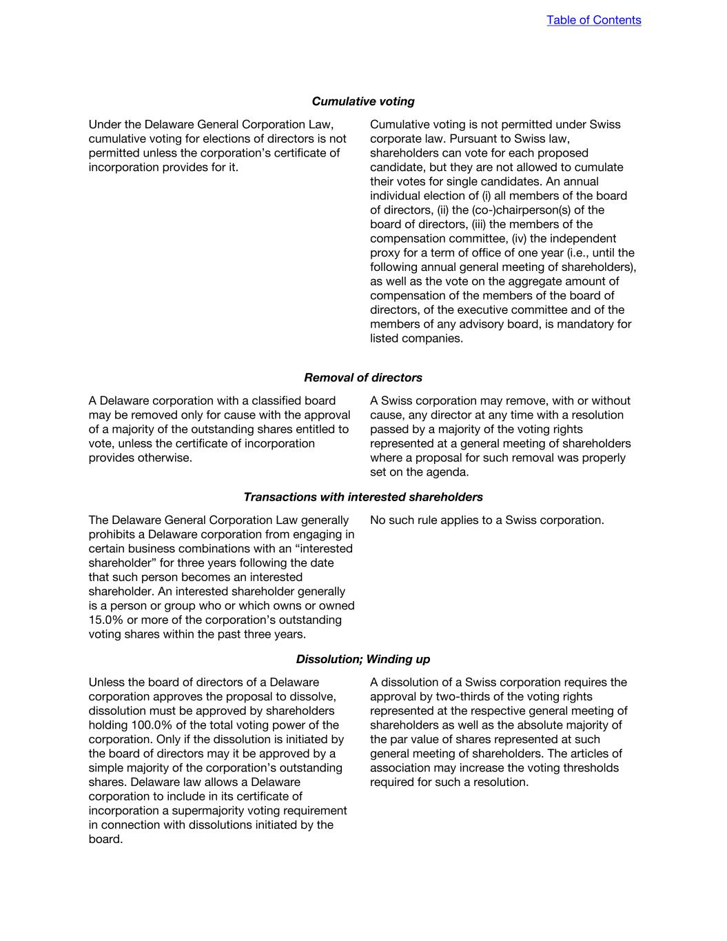 Cumulative voting Under the Delaware General Corporation Law, cumulative voting for elections of directors is not permitted unless the corporation’s certificate of incorporation provides for it. Cumulative voting is not permitted under Swiss corporate law. Pursuant to Swiss law, shareholders can vote for each proposed candidate, but they are not allowed to cumulate their votes for single candidates. An annual individual election of (i) all members of the board of directors, (ii) the (co-)chairperson(s) of the board of directors, (iii) the members of the compensation committee, (iv) the independent proxy for a term of office of one year (i.e., until the following annual general meeting of shareholders), as well as the vote on the aggregate amount of compensation of the members of the board of directors, of the executive committee and of the members of any advisory board, is mandatory for listed companies. Removal of directors A Delaware corporation with a classified board may be removed only for cause with the approval of a majority of the outstanding shares entitled to vote, unless the certificate of incorporation provides otherwise. A Swiss corporation may remove, with or without cause, any director at any time with a resolution passed by a majority of the voting rights represented at a general meeting of shareholders where a proposal for such removal was properly set on the agenda. Transactions with interested shareholders The Delaware General Corporation Law generally prohibits a Delaware corporation from engaging in certain business combinations with an “interested shareholder” for three years following the date that such person becomes an interested shareholder. An interested shareholder generally is a person or group who or which owns or owned 15.0% or more of the corporation’s outstanding voting shares within the past three years. No such rule applies to a Swiss corporation. Dissolution; Winding up Unless the board of directors of a Delaware corporation approves the proposal to dissolve, dissolution must be approved by shareholders holding 100.0% of the total voting power of the corporation. Only if the dissolution is initiated by the board of directors may it be approved by a simple majority of the corporation’s outstanding shares. Delaware law allows a Delaware corporation to include in its certificate of incorporation a supermajority voting requirement in connection with dissolutions initiated by the board. A dissolution of a Swiss corporation requires the approval by two-thirds of the voting rights represented at the respective general meeting of shareholders as well as the absolute majority of the par value of shares represented at such general meeting of shareholders. The articles of association may increase the voting thresholds required for such a resolution. Table of Contents
