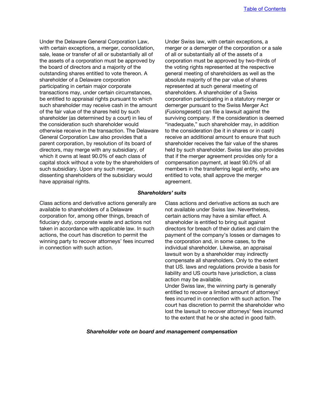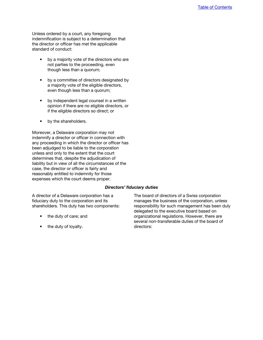 Unless ordered by a court, any foregoing indemnification is subject to a determination that the director or officer has met the applicable standard of conduct: • by a majority vote of the directors who are not parties to the proceeding, even though less than a quorum; • by a committee of directors designated by a majority vote of the eligible directors, even though less than a quorum; • by independent legal counsel in a written opinion if there are no eligible directors, or if the eligible directors so direct; or • by the shareholders. Moreover, a Delaware corporation may not indemnify a director or officer in connection with any proceeding in which the director or officer has been adjudged to be liable to the corporation unless and only to the extent that the court determines that, despite the adjudication of liability but in view of all the circumstances of the case, the director or officer is fairly and reasonably entitled to indemnity for those expenses which the court deems proper. Directors’ fiduciary duties A director of a Delaware corporation has a fiduciary duty to the corporation and its shareholders. This duty has two components: • the duty of care; and • the duty of loyalty. The board of directors of a Swiss corporation manages the business of the corporation, unless responsibility for such management has been duly delegated to the executive board based on organizational regulations. However, there are several non-transferable duties of the board of directors: Table of Contents