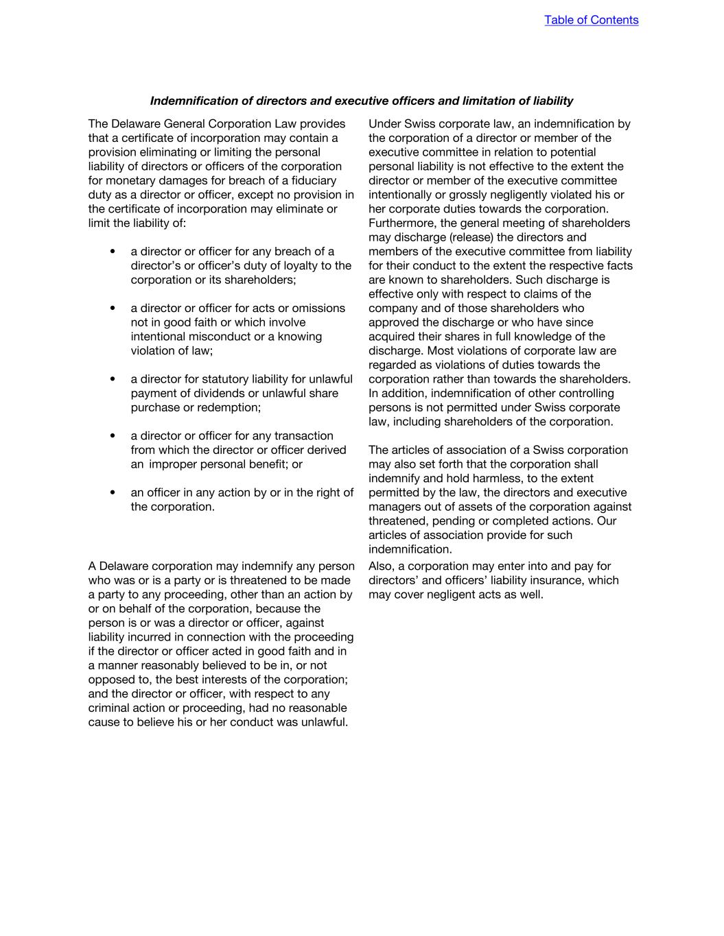 Indemnification of directors and executive officers and limitation of liability The Delaware General Corporation Law provides that a certificate of incorporation may contain a provision eliminating or limiting the personal liability of directors or officers of the corporation for monetary damages for breach of a fiduciary duty as a director or officer, except no provision in the certificate of incorporation may eliminate or limit the liability of: • a director or officer for any breach of a director’s or officer’s duty of loyalty to the corporation or its shareholders; • a director or officer for acts or omissions not in good faith or which involve intentional misconduct or a knowing violation of law; • a director for statutory liability for unlawful payment of dividends or unlawful share purchase or redemption; • a director or officer for any transaction from which the director or officer derived an improper personal benefit; or • an officer in any action by or in the right of the corporation. Under Swiss corporate law, an indemnification by the corporation of a director or member of the executive committee in relation to potential personal liability is not effective to the extent the director or member of the executive committee intentionally or grossly negligently violated his or her corporate duties towards the corporation. Furthermore, the general meeting of shareholders may discharge (release) the directors and members of the executive committee from liability for their conduct to the extent the respective facts are known to shareholders. Such discharge is effective only with respect to claims of the company and of those shareholders who approved the discharge or who have since acquired their shares in full knowledge of the discharge. Most violations of corporate law are regarded as violations of duties towards the corporation rather than towards the shareholders. In addition, indemnification of other controlling persons is not permitted under Swiss corporate law, including shareholders of the corporation. The articles of association of a Swiss corporation may also set forth that the corporation shall indemnify and hold harmless, to the extent permitted by the law, the directors and executive managers out of assets of the corporation against threatened, pending or completed actions. Our articles of association provide for such indemnification. A Delaware corporation may indemnify any person who was or is a party or is threatened to be made a party to any proceeding, other than an action by or on behalf of the corporation, because the person is or was a director or officer, against liability incurred in connection with the proceeding if the director or officer acted in good faith and in a manner reasonably believed to be in, or not opposed to, the best interests of the corporation; and the director or officer, with respect to any criminal action or proceeding, had no reasonable cause to believe his or her conduct was unlawful. Also, a corporation may enter into and pay for directors’ and officers’ liability insurance, which may cover negligent acts as well. Table of Contents