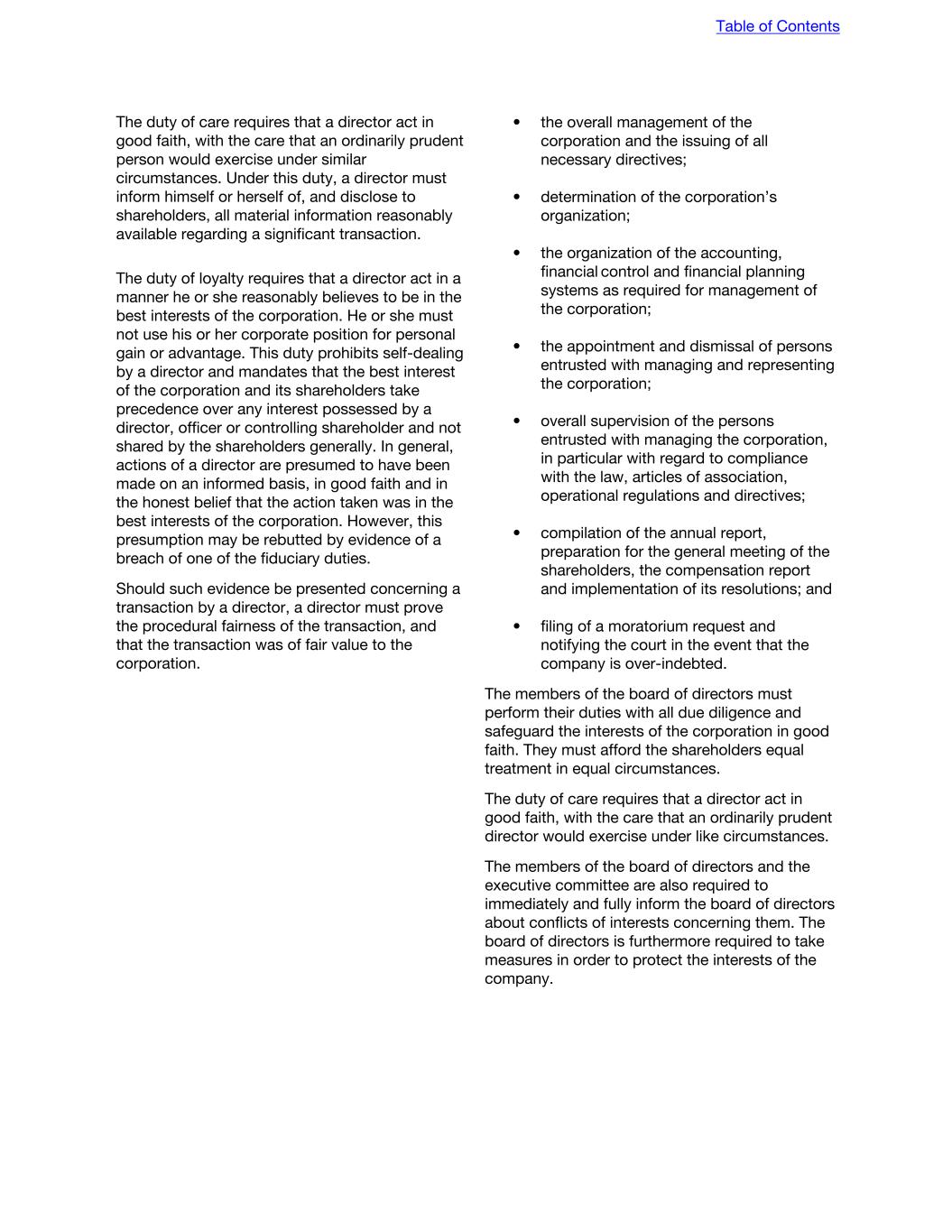 The duty of care requires that a director act in good faith, with the care that an ordinarily prudent person would exercise under similar circumstances. Under this duty, a director must inform himself or herself of, and disclose to shareholders, all material information reasonably available regarding a significant transaction. • the overall management of the corporation and the issuing of all necessary directives; • determination of the corporation’s organization; • the organization of the accounting, financial control and financial planning systems as required for management of the corporation; • the appointment and dismissal of persons entrusted with managing and representing the corporation; • overall supervision of the persons entrusted with managing the corporation, in particular with regard to compliance with the law, articles of association, operational regulations and directives; • compilation of the annual report, preparation for the general meeting of the shareholders, the compensation report and implementation of its resolutions; and • filing of a moratorium request and notifying the court in the event that the company is over-indebted. The duty of loyalty requires that a director act in a manner he or she reasonably believes to be in the best interests of the corporation. He or she must not use his or her corporate position for personal gain or advantage. This duty prohibits self-dealing by a director and mandates that the best interest of the corporation and its shareholders take precedence over any interest possessed by a director, officer or controlling shareholder and not shared by the shareholders generally. In general, actions of a director are presumed to have been made on an informed basis, in good faith and in the honest belief that the action taken was in the best interests of the corporation. However, this presumption may be rebutted by evidence of a breach of one of the fiduciary duties. Should such evidence be presented concerning a transaction by a director, a director must prove the procedural fairness of the transaction, and that the transaction was of fair value to the corporation. The members of the board of directors must perform their duties with all due diligence and safeguard the interests of the corporation in good faith. They must afford the shareholders equal treatment in equal circumstances. The duty of care requires that a director act in good faith, with the care that an ordinarily prudent director would exercise under like circumstances. The members of the board of directors and the executive committee are also required to immediately and fully inform the board of directors about conflicts of interests concerning them. The board of directors is furthermore required to take measures in order to protect the interests of the company. Table of Contents