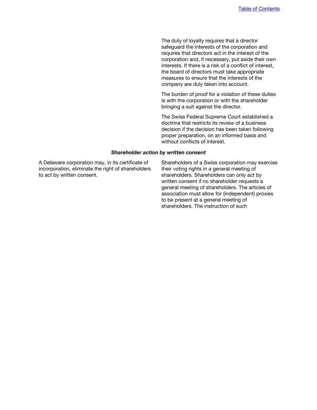 The duty of loyalty requires that a director safeguard the interests of the corporation and requires that directors act in the interest of the corporation and, if necessary, put aside their own interests. If there is a risk of a conflict of interest, the board of directors must take appropriate measures to ensure that the interests of the company are duly taken into account. The burden of proof for a violation of these duties is with the corporation or with the shareholder bringing a suit against the director. The Swiss Federal Supreme Court established a doctrine that restricts its review of a business decision if the decision has been taken following proper preparation, on an informed basis and without conflicts of interest. Shareholder action by written consent A Delaware corporation may, in its certificate of incorporation, eliminate the right of shareholders to act by written consent. Shareholders of a Swiss corporation may exercise their voting rights in a general meeting of shareholders. Shareholders can only act by written consent if no shareholder requests a general meeting of shareholders. The articles of association must allow for (independent) proxies to be present at a general meeting of shareholders. The instruction of such Table of Contents