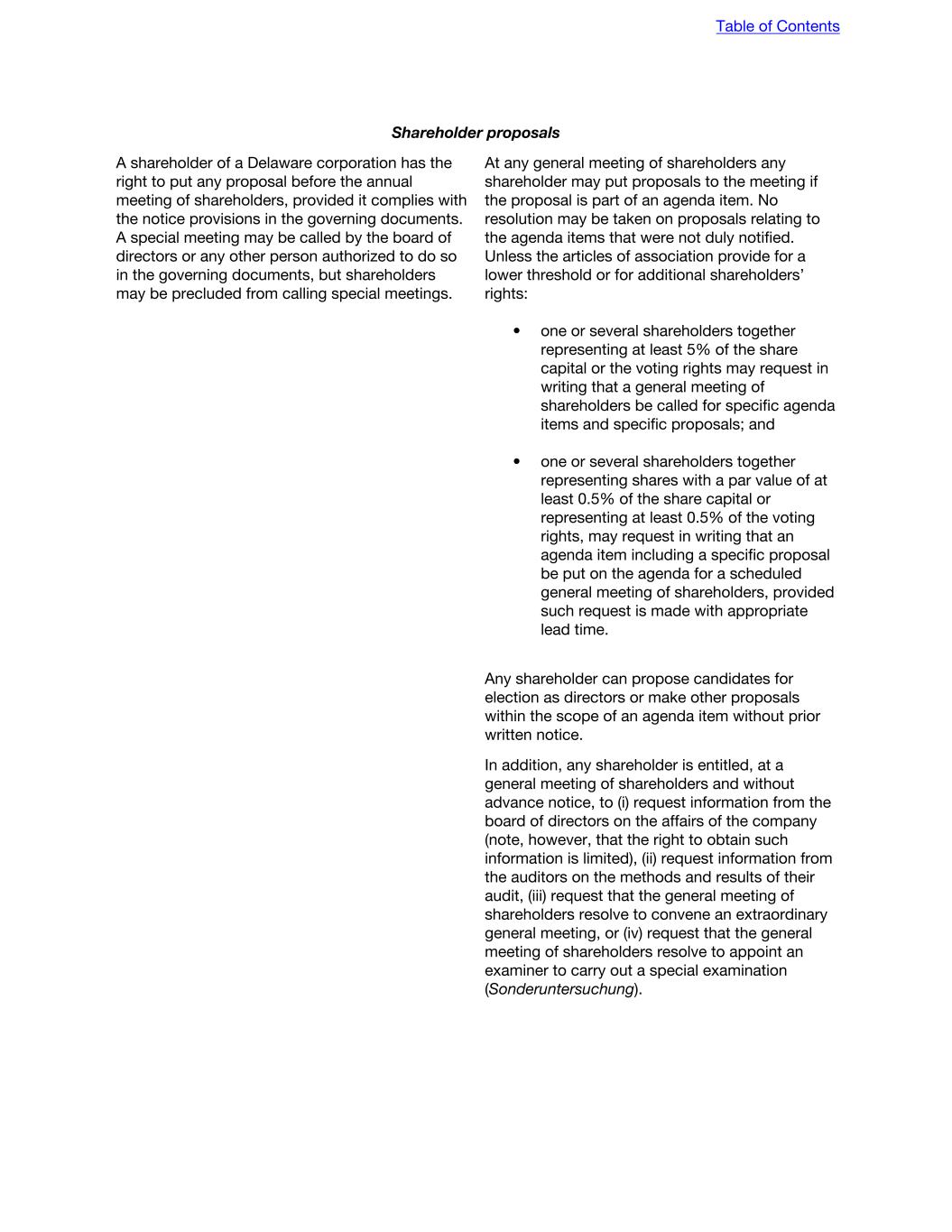 Shareholder proposals A shareholder of a Delaware corporation has the right to put any proposal before the annual meeting of shareholders, provided it complies with the notice provisions in the governing documents. A special meeting may be called by the board of directors or any other person authorized to do so in the governing documents, but shareholders may be precluded from calling special meetings. At any general meeting of shareholders any shareholder may put proposals to the meeting if the proposal is part of an agenda item. No resolution may be taken on proposals relating to the agenda items that were not duly notified. Unless the articles of association provide for a lower threshold or for additional shareholders’ rights: • one or several shareholders together representing at least 5% of the share capital or the voting rights may request in writing that a general meeting of shareholders be called for specific agenda items and specific proposals; and • one or several shareholders together representing shares with a par value of at least 0.5% of the share capital or representing at least 0.5% of the voting rights, may request in writing that an agenda item including a specific proposal be put on the agenda for a scheduled general meeting of shareholders, provided such request is made with appropriate lead time. Any shareholder can propose candidates for election as directors or make other proposals within the scope of an agenda item without prior written notice. In addition, any shareholder is entitled, at a general meeting of shareholders and without advance notice, to (i) request information from the board of directors on the affairs of the company (note, however, that the right to obtain such information is limited), (ii) request information from the auditors on the methods and results of their audit, (iii) request that the general meeting of shareholders resolve to convene an extraordinary general meeting, or (iv) request that the general meeting of shareholders resolve to appoint an examiner to carry out a special examination (Sonderuntersuchung). Table of Contents