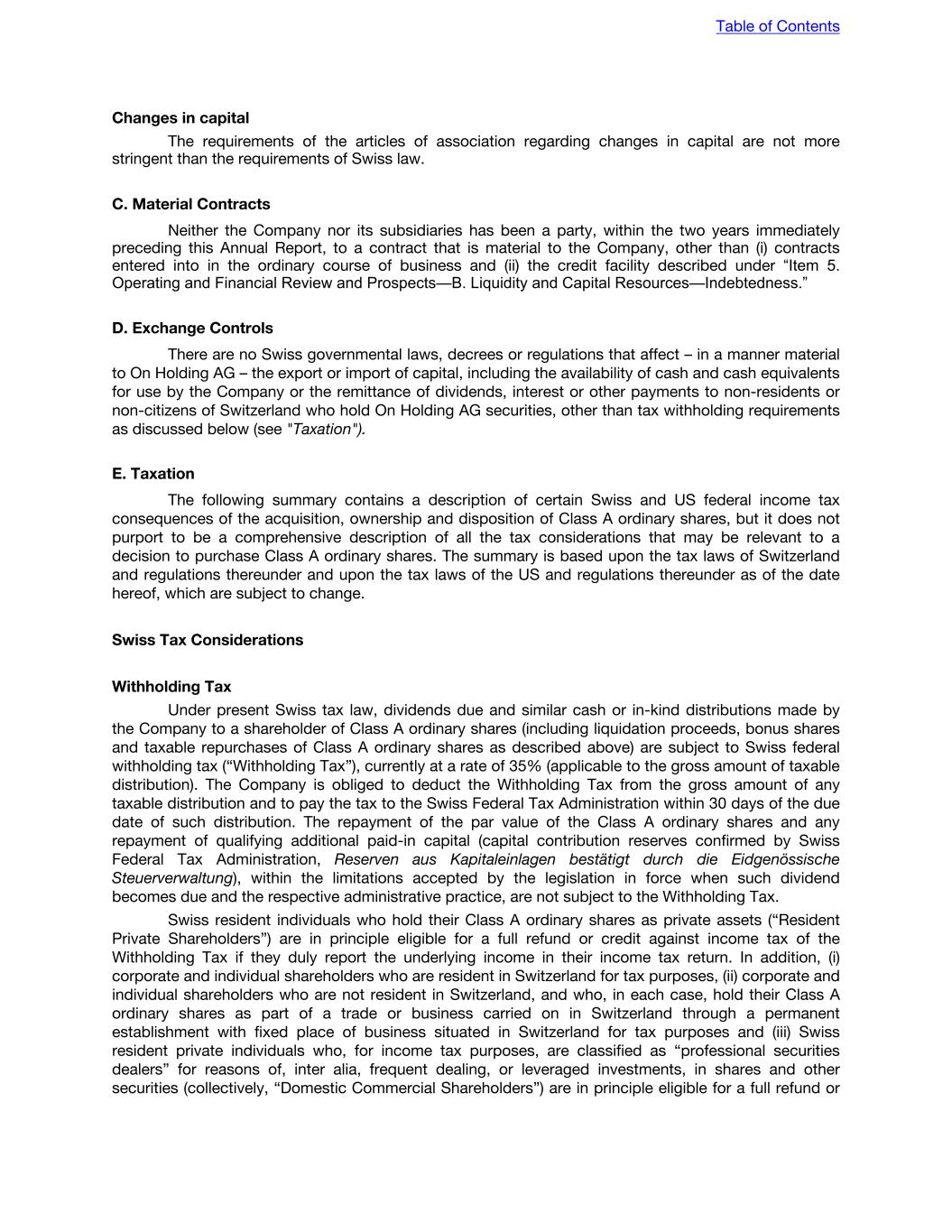 Changes in capital The requirements of the articles of association regarding changes in capital are not more stringent than the requirements of Swiss law. C. Material Contracts Neither the Company nor its subsidiaries has been a party, within the two years immediately preceding this Annual Report, to a contract that is material to the Company, other than (i) contracts entered into in the ordinary course of business and (ii) the credit facility described under “Item 5. Operating and Financial Review and Prospects—B. Liquidity and Capital Resources—Indebtedness.” D. Exchange Controls There are no Swiss governmental laws, decrees or regulations that affect – in a manner material to On Holding AG – the export or import of capital, including the availability of cash and cash equivalents for use by the Company or the remittance of dividends, interest or other payments to non-residents or non-citizens of Switzerland who hold On Holding AG securities, other than tax withholding requirements as discussed below (see "Taxation"). E. Taxation The following summary contains a description of certain Swiss and US federal income tax consequences of the acquisition, ownership and disposition of Class A ordinary shares, but it does not purport to be a comprehensive description of all the tax considerations that may be relevant to a decision to purchase Class A ordinary shares. The summary is based upon the tax laws of Switzerland and regulations thereunder and upon the tax laws of the US and regulations thereunder as of the date hereof, which are subject to change. Swiss Tax Considerations Withholding Tax Under present Swiss tax law, dividends due and similar cash or in-kind distributions made by the Company to a shareholder of Class A ordinary shares (including liquidation proceeds, bonus shares and taxable repurchases of Class A ordinary shares as described above) are subject to Swiss federal withholding tax (“Withholding Tax”), currently at a rate of 35% (applicable to the gross amount of taxable distribution). The Company is obliged to deduct the Withholding Tax from the gross amount of any taxable distribution and to pay the tax to the Swiss Federal Tax Administration within 30 days of the due date of such distribution. The repayment of the par value of the Class A ordinary shares and any repayment of qualifying additional paid-in capital (capital contribution reserves confirmed by Swiss Federal Tax Administration, Reserven aus Kapitaleinlagen bestätigt durch die Eidgenössische Steuerverwaltung), within the limitations accepted by the legislation in force when such dividend becomes due and the respective administrative practice, are not subject to the Withholding Tax. Swiss resident individuals who hold their Class A ordinary shares as private assets (“Resident Private Shareholders”) are in principle eligible for a full refund or credit against income tax of the Withholding Tax if they duly report the underlying income in their income tax return. In addition, (i) corporate and individual shareholders who are resident in Switzerland for tax purposes, (ii) corporate and individual shareholders who are not resident in Switzerland, and who, in each case, hold their Class A ordinary shares as part of a trade or business carried on in Switzerland through a permanent establishment with fixed place of business situated in Switzerland for tax purposes and (iii) Swiss resident private individuals who, for income tax purposes, are classified as “professional securities dealers” for reasons of, inter alia, frequent dealing, or leveraged investments, in shares and other securities (collectively, “Domestic Commercial Shareholders”) are in principle eligible for a full refund or Table of Contents