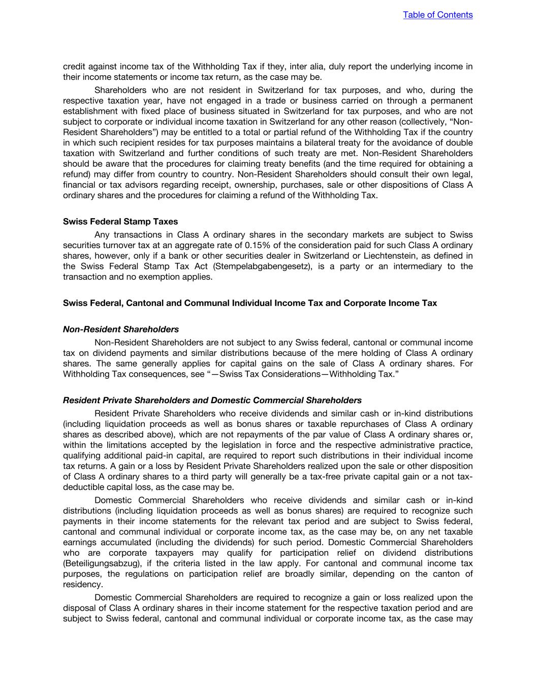 credit against income tax of the Withholding Tax if they, inter alia, duly report the underlying income in their income statements or income tax return, as the case may be. Shareholders who are not resident in Switzerland for tax purposes, and who, during the respective taxation year, have not engaged in a trade or business carried on through a permanent establishment with fixed place of business situated in Switzerland for tax purposes, and who are not subject to corporate or individual income taxation in Switzerland for any other reason (collectively, “Non- Resident Shareholders”) may be entitled to a total or partial refund of the Withholding Tax if the country in which such recipient resides for tax purposes maintains a bilateral treaty for the avoidance of double taxation with Switzerland and further conditions of such treaty are met. Non-Resident Shareholders should be aware that the procedures for claiming treaty benefits (and the time required for obtaining a refund) may differ from country to country. Non-Resident Shareholders should consult their own legal, financial or tax advisors regarding receipt, ownership, purchases, sale or other dispositions of Class A ordinary shares and the procedures for claiming a refund of the Withholding Tax. Swiss Federal Stamp Taxes Any transactions in Class A ordinary shares in the secondary markets are subject to Swiss securities turnover tax at an aggregate rate of 0.15% of the consideration paid for such Class A ordinary shares, however, only if a bank or other securities dealer in Switzerland or Liechtenstein, as defined in the Swiss Federal Stamp Tax Act (Stempelabgabengesetz), is a party or an intermediary to the transaction and no exemption applies. Swiss Federal, Cantonal and Communal Individual Income Tax and Corporate Income Tax Non-Resident Shareholders Non-Resident Shareholders are not subject to any Swiss federal, cantonal or communal income tax on dividend payments and similar distributions because of the mere holding of Class A ordinary shares. The same generally applies for capital gains on the sale of Class A ordinary shares. For Withholding Tax consequences, see “—Swiss Tax Considerations—Withholding Tax.” Resident Private Shareholders and Domestic Commercial Shareholders Resident Private Shareholders who receive dividends and similar cash or in-kind distributions (including liquidation proceeds as well as bonus shares or taxable repurchases of Class A ordinary shares as described above), which are not repayments of the par value of Class A ordinary shares or, within the limitations accepted by the legislation in force and the respective administrative practice, qualifying additional paid-in capital, are required to report such distributions in their individual income tax returns. A gain or a loss by Resident Private Shareholders realized upon the sale or other disposition of Class A ordinary shares to a third party will generally be a tax-free private capital gain or a not tax- deductible capital loss, as the case may be. Domestic Commercial Shareholders who receive dividends and similar cash or in-kind distributions (including liquidation proceeds as well as bonus shares) are required to recognize such payments in their income statements for the relevant tax period and are subject to Swiss federal, cantonal and communal individual or corporate income tax, as the case may be, on any net taxable earnings accumulated (including the dividends) for such period. Domestic Commercial Shareholders who are corporate taxpayers may qualify for participation relief on dividend distributions (Beteiligungsabzug), if the criteria listed in the law apply. For cantonal and communal income tax purposes, the regulations on participation relief are broadly similar, depending on the canton of residency. Domestic Commercial Shareholders are required to recognize a gain or loss realized upon the disposal of Class A ordinary shares in their income statement for the respective taxation period and are subject to Swiss federal, cantonal and communal individual or corporate income tax, as the case may Table of Contents