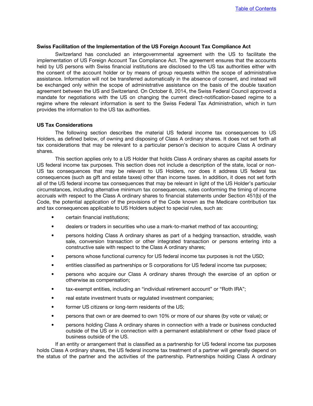 Swiss Facilitation of the Implementation of the US Foreign Account Tax Compliance Act Switzerland has concluded an intergovernmental agreement with the US to facilitate the implementation of US Foreign Account Tax Compliance Act. The agreement ensures that the accounts held by US persons with Swiss financial institutions are disclosed to the US tax authorities either with the consent of the account holder or by means of group requests within the scope of administrative assistance. Information will not be transferred automatically in the absence of consent, and instead will be exchanged only within the scope of administrative assistance on the basis of the double taxation agreement between the US and Switzerland. On October 8, 2014, the Swiss Federal Council approved a mandate for negotiations with the US on changing the current direct-notification-based regime to a regime where the relevant information is sent to the Swiss Federal Tax Administration, which in turn provides the information to the US tax authorities. US Tax Considerations The following section describes the material US federal income tax consequences to US Holders, as defined below, of owning and disposing of Class A ordinary shares. It does not set forth all tax considerations that may be relevant to a particular person’s decision to acquire Class A ordinary shares. This section applies only to a US Holder that holds Class A ordinary shares as capital assets for US federal income tax purposes. This section does not include a description of the state, local or non- US tax consequences that may be relevant to US Holders, nor does it address US federal tax consequences (such as gift and estate taxes) other than income taxes. In addition, it does not set forth all of the US federal income tax consequences that may be relevant in light of the US Holder’s particular circumstances, including alternative minimum tax consequences, rules conforming the timing of income accruals with respect to the Class A ordinary shares to financial statements under Section 451(b) of the Code, the potential application of the provisions of the Code known as the Medicare contribution tax and tax consequences applicable to US Holders subject to special rules, such as: • certain financial institutions; • dealers or traders in securities who use a mark-to-market method of tax accounting; • persons holding Class A ordinary shares as part of a hedging transaction, straddle, wash sale, conversion transaction or other integrated transaction or persons entering into a constructive sale with respect to the Class A ordinary shares; • persons whose functional currency for US federal income tax purposes is not the USD; • entities classified as partnerships or S corporations for US federal income tax purposes; • persons who acquire our Class A ordinary shares through the exercise of an option or otherwise as compensation; • tax-exempt entities, including an “individual retirement account” or “Roth IRA”; • real estate investment trusts or regulated investment companies; • former US citizens or long-term residents of the US; • persons that own or are deemed to own 10% or more of our shares (by vote or value); or • persons holding Class A ordinary shares in connection with a trade or business conducted outside of the US or in connection with a permanent establishment or other fixed place of business outside of the US. If an entity or arrangement that is classified as a partnership for US federal income tax purposes holds Class A ordinary shares, the US federal income tax treatment of a partner will generally depend on the status of the partner and the activities of the partnership. Partnerships holding Class A ordinary Table of Contents