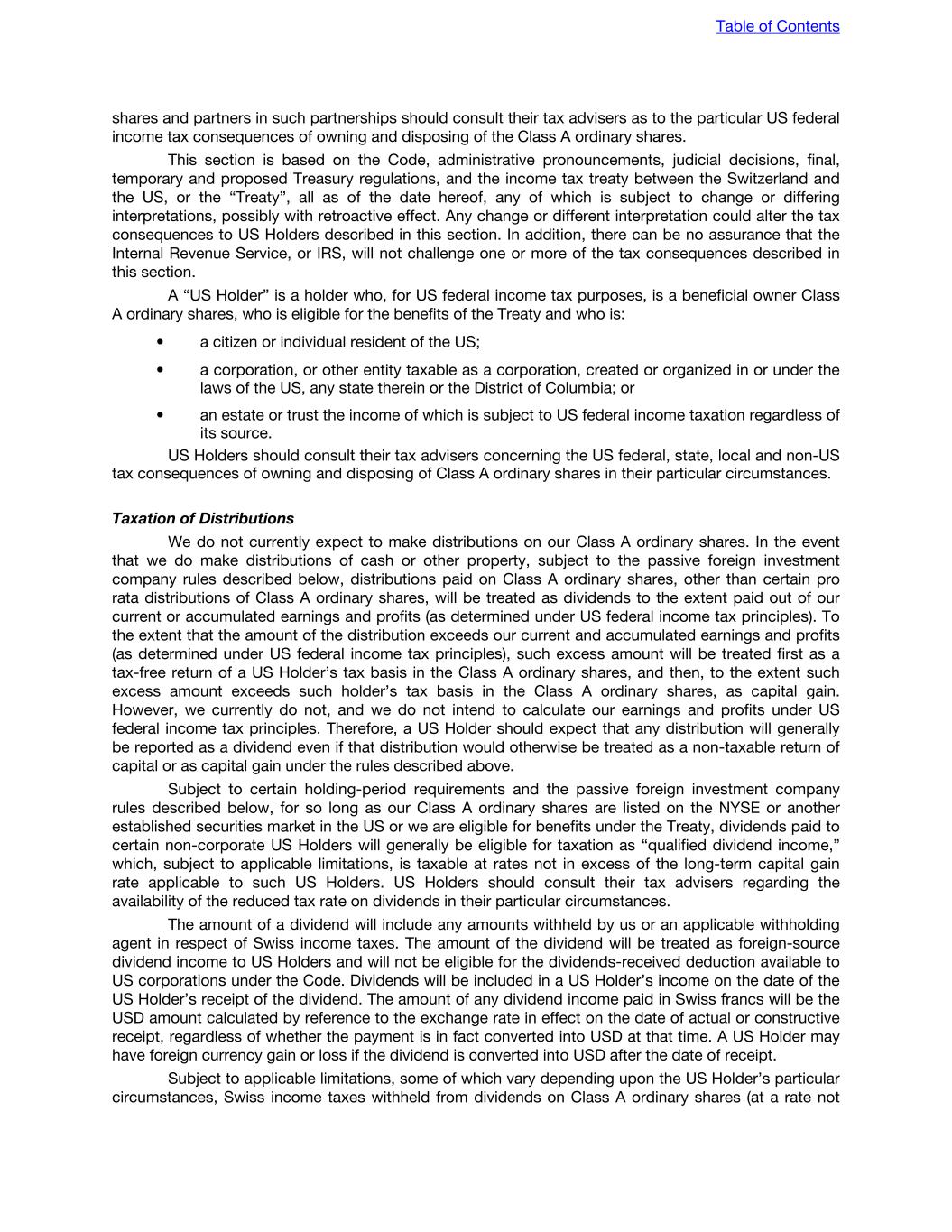 shares and partners in such partnerships should consult their tax advisers as to the particular US federal income tax consequences of owning and disposing of the Class A ordinary shares. This section is based on the Code, administrative pronouncements, judicial decisions, final, temporary and proposed Treasury regulations, and the income tax treaty between the Switzerland and the US, or the “Treaty”, all as of the date hereof, any of which is subject to change or differing interpretations, possibly with retroactive effect. Any change or different interpretation could alter the tax consequences to US Holders described in this section. In addition, there can be no assurance that the Internal Revenue Service, or IRS, will not challenge one or more of the tax consequences described in this section. A “US Holder” is a holder who, for US federal income tax purposes, is a beneficial owner Class A ordinary shares, who is eligible for the benefits of the Treaty and who is: • a citizen or individual resident of the US; • a corporation, or other entity taxable as a corporation, created or organized in or under the laws of the US, any state therein or the District of Columbia; or • an estate or trust the income of which is subject to US federal income taxation regardless of its source. US Holders should consult their tax advisers concerning the US federal, state, local and non-US tax consequences of owning and disposing of Class A ordinary shares in their particular circumstances. Taxation of Distributions We do not currently expect to make distributions on our Class A ordinary shares. In the event that we do make distributions of cash or other property, subject to the passive foreign investment company rules described below, distributions paid on Class A ordinary shares, other than certain pro rata distributions of Class A ordinary shares, will be treated as dividends to the extent paid out of our current or accumulated earnings and profits (as determined under US federal income tax principles). To the extent that the amount of the distribution exceeds our current and accumulated earnings and profits (as determined under US federal income tax principles), such excess amount will be treated first as a tax-free return of a US Holder’s tax basis in the Class A ordinary shares, and then, to the extent such excess amount exceeds such holder’s tax basis in the Class A ordinary shares, as capital gain. However, we currently do not, and we do not intend to calculate our earnings and profits under US federal income tax principles. Therefore, a US Holder should expect that any distribution will generally be reported as a dividend even if that distribution would otherwise be treated as a non-taxable return of capital or as capital gain under the rules described above. Subject to certain holding-period requirements and the passive foreign investment company rules described below, for so long as our Class A ordinary shares are listed on the NYSE or another established securities market in the US or we are eligible for benefits under the Treaty, dividends paid to certain non-corporate US Holders will generally be eligible for taxation as “qualified dividend income,” which, subject to applicable limitations, is taxable at rates not in excess of the long-term capital gain rate applicable to such US Holders. US Holders should consult their tax advisers regarding the availability of the reduced tax rate on dividends in their particular circumstances. The amount of a dividend will include any amounts withheld by us or an applicable withholding agent in respect of Swiss income taxes. The amount of the dividend will be treated as foreign-source dividend income to US Holders and will not be eligible for the dividends-received deduction available to US corporations under the Code. Dividends will be included in a US Holder’s income on the date of the US Holder’s receipt of the dividend. The amount of any dividend income paid in Swiss francs will be the USD amount calculated by reference to the exchange rate in effect on the date of actual or constructive receipt, regardless of whether the payment is in fact converted into USD at that time. A US Holder may have foreign currency gain or loss if the dividend is converted into USD after the date of receipt. Subject to applicable limitations, some of which vary depending upon the US Holder’s particular circumstances, Swiss income taxes withheld from dividends on Class A ordinary shares (at a rate not Table of Contents