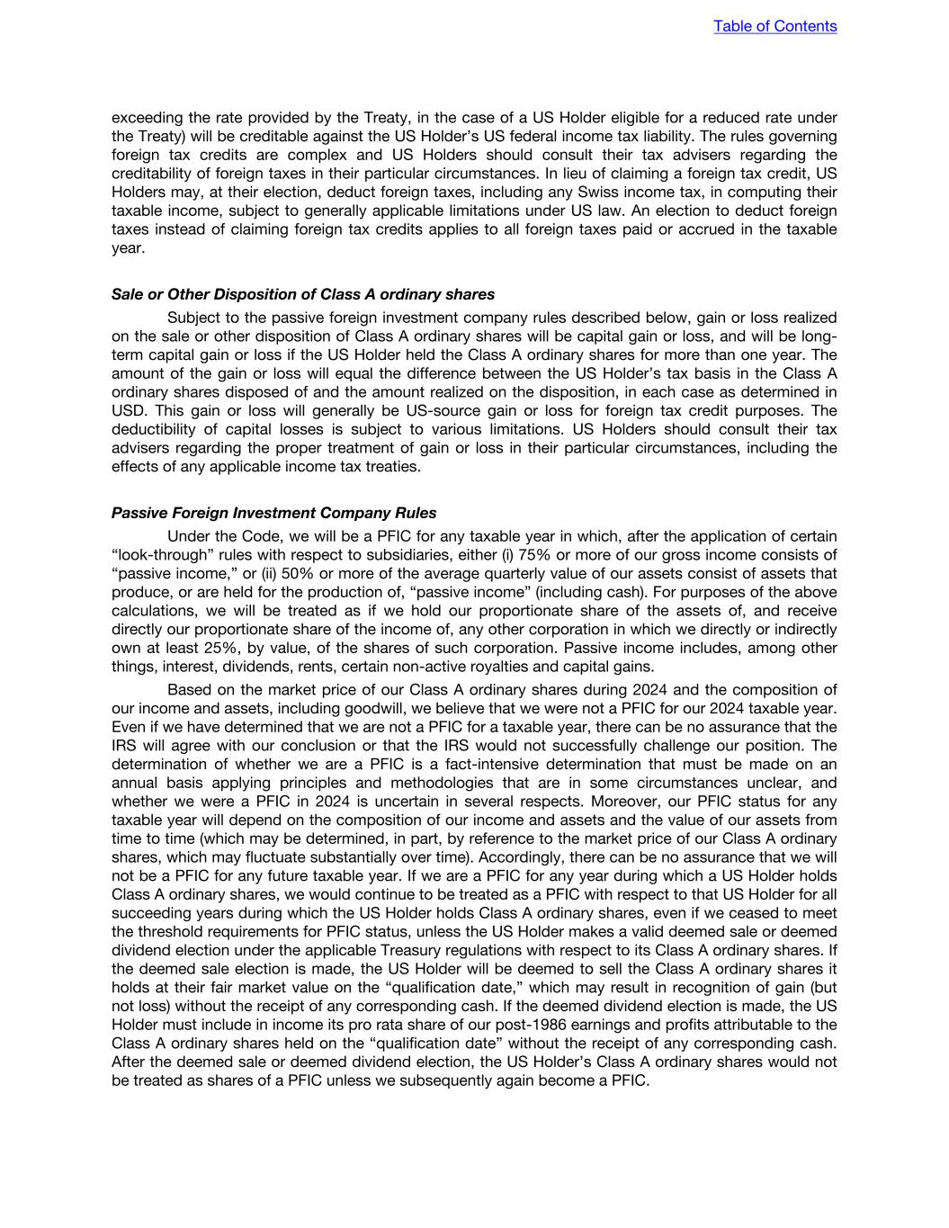 exceeding the rate provided by the Treaty, in the case of a US Holder eligible for a reduced rate under the Treaty) will be creditable against the US Holder’s US federal income tax liability. The rules governing foreign tax credits are complex and US Holders should consult their tax advisers regarding the creditability of foreign taxes in their particular circumstances. In lieu of claiming a foreign tax credit, US Holders may, at their election, deduct foreign taxes, including any Swiss income tax, in computing their taxable income, subject to generally applicable limitations under US law. An election to deduct foreign taxes instead of claiming foreign tax credits applies to all foreign taxes paid or accrued in the taxable year. Sale or Other Disposition of Class A ordinary shares Subject to the passive foreign investment company rules described below, gain or loss realized on the sale or other disposition of Class A ordinary shares will be capital gain or loss, and will be long- term capital gain or loss if the US Holder held the Class A ordinary shares for more than one year. The amount of the gain or loss will equal the difference between the US Holder’s tax basis in the Class A ordinary shares disposed of and the amount realized on the disposition, in each case as determined in USD. This gain or loss will generally be US-source gain or loss for foreign tax credit purposes. The deductibility of capital losses is subject to various limitations. US Holders should consult their tax advisers regarding the proper treatment of gain or loss in their particular circumstances, including the effects of any applicable income tax treaties. Passive Foreign Investment Company Rules Under the Code, we will be a PFIC for any taxable year in which, after the application of certain “look-through” rules with respect to subsidiaries, either (i) 75% or more of our gross income consists of “passive income,” or (ii) 50% or more of the average quarterly value of our assets consist of assets that produce, or are held for the production of, “passive income” (including cash). For purposes of the above calculations, we will be treated as if we hold our proportionate share of the assets of, and receive directly our proportionate share of the income of, any other corporation in which we directly or indirectly own at least 25%, by value, of the shares of such corporation. Passive income includes, among other things, interest, dividends, rents, certain non-active royalties and capital gains. Based on the market price of our Class A ordinary shares during 2024 and the composition of our income and assets, including goodwill, we believe that we were not a PFIC for our 2024 taxable year. Even if we have determined that we are not a PFIC for a taxable year, there can be no assurance that the IRS will agree with our conclusion or that the IRS would not successfully challenge our position. The determination of whether we are a PFIC is a fact-intensive determination that must be made on an annual basis applying principles and methodologies that are in some circumstances unclear, and whether we were a PFIC in 2024 is uncertain in several respects. Moreover, our PFIC status for any taxable year will depend on the composition of our income and assets and the value of our assets from time to time (which may be determined, in part, by reference to the market price of our Class A ordinary shares, which may fluctuate substantially over time). Accordingly, there can be no assurance that we will not be a PFIC for any future taxable year. If we are a PFIC for any year during which a US Holder holds Class A ordinary shares, we would continue to be treated as a PFIC with respect to that US Holder for all succeeding years during which the US Holder holds Class A ordinary shares, even if we ceased to meet the threshold requirements for PFIC status, unless the US Holder makes a valid deemed sale or deemed dividend election under the applicable Treasury regulations with respect to its Class A ordinary shares. If the deemed sale election is made, the US Holder will be deemed to sell the Class A ordinary shares it holds at their fair market value on the “qualification date,” which may result in recognition of gain (but not loss) without the receipt of any corresponding cash. If the deemed dividend election is made, the US Holder must include in income its pro rata share of our post-1986 earnings and profits attributable to the Class A ordinary shares held on the “qualification date” without the receipt of any corresponding cash. After the deemed sale or deemed dividend election, the US Holder’s Class A ordinary shares would not be treated as shares of a PFIC unless we subsequently again become a PFIC. Table of Contents