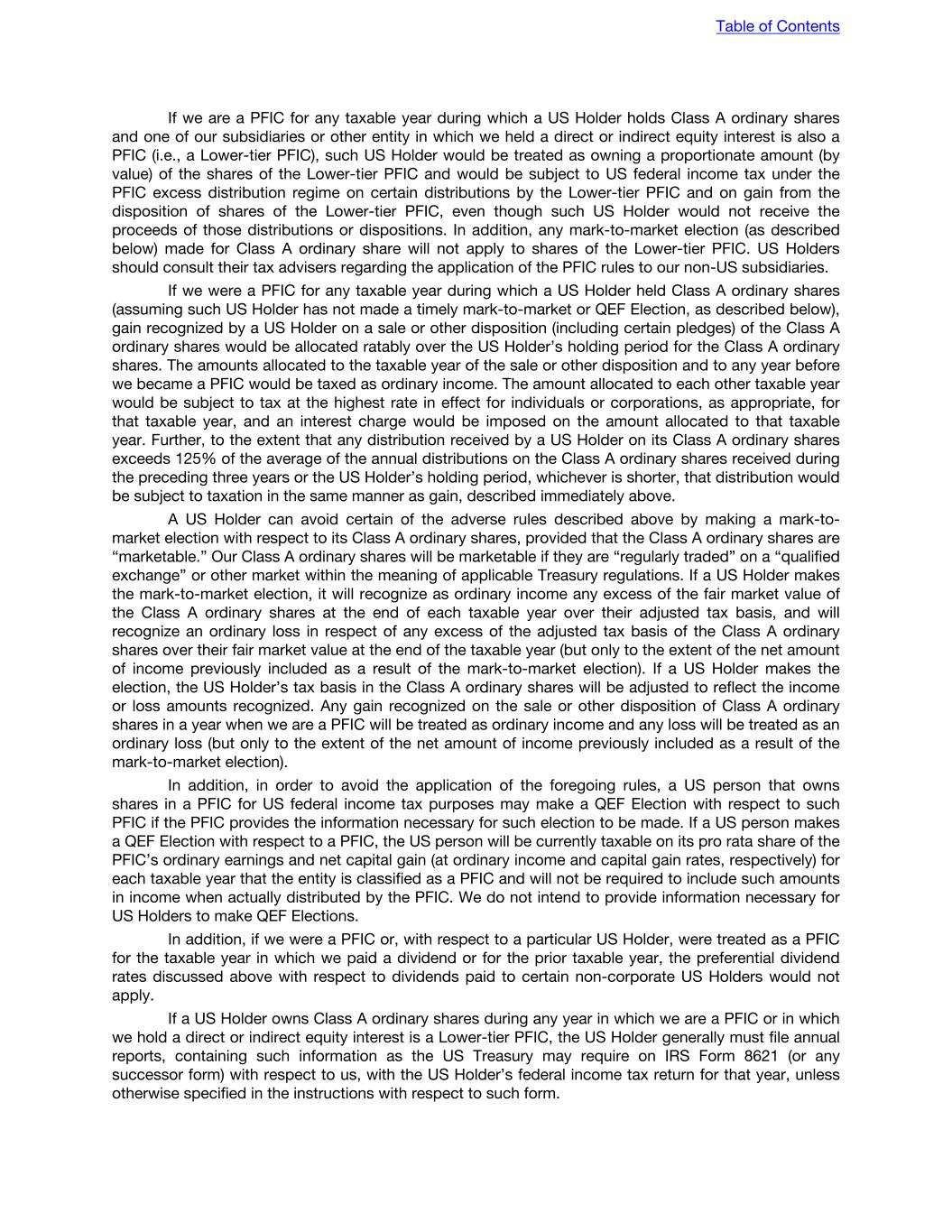 If we are a PFIC for any taxable year during which a US Holder holds Class A ordinary shares and one of our subsidiaries or other entity in which we held a direct or indirect equity interest is also a PFIC (i.e., a Lower-tier PFIC), such US Holder would be treated as owning a proportionate amount (by value) of the shares of the Lower-tier PFIC and would be subject to US federal income tax under the PFIC excess distribution regime on certain distributions by the Lower-tier PFIC and on gain from the disposition of shares of the Lower-tier PFIC, even though such US Holder would not receive the proceeds of those distributions or dispositions. In addition, any mark-to-market election (as described below) made for Class A ordinary share will not apply to shares of the Lower-tier PFIC. US Holders should consult their tax advisers regarding the application of the PFIC rules to our non-US subsidiaries. If we were a PFIC for any taxable year during which a US Holder held Class A ordinary shares (assuming such US Holder has not made a timely mark-to-market or QEF Election, as described below), gain recognized by a US Holder on a sale or other disposition (including certain pledges) of the Class A ordinary shares would be allocated ratably over the US Holder’s holding period for the Class A ordinary shares. The amounts allocated to the taxable year of the sale or other disposition and to any year before we became a PFIC would be taxed as ordinary income. The amount allocated to each other taxable year would be subject to tax at the highest rate in effect for individuals or corporations, as appropriate, for that taxable year, and an interest charge would be imposed on the amount allocated to that taxable year. Further, to the extent that any distribution received by a US Holder on its Class A ordinary shares exceeds 125% of the average of the annual distributions on the Class A ordinary shares received during the preceding three years or the US Holder’s holding period, whichever is shorter, that distribution would be subject to taxation in the same manner as gain, described immediately above. A US Holder can avoid certain of the adverse rules described above by making a mark-to- market election with respect to its Class A ordinary shares, provided that the Class A ordinary shares are “marketable.” Our Class A ordinary shares will be marketable if they are “regularly traded” on a “qualified exchange” or other market within the meaning of applicable Treasury regulations. If a US Holder makes the mark-to-market election, it will recognize as ordinary income any excess of the fair market value of the Class A ordinary shares at the end of each taxable year over their adjusted tax basis, and will recognize an ordinary loss in respect of any excess of the adjusted tax basis of the Class A ordinary shares over their fair market value at the end of the taxable year (but only to the extent of the net amount of income previously included as a result of the mark-to-market election). If a US Holder makes the election, the US Holder’s tax basis in the Class A ordinary shares will be adjusted to reflect the income or loss amounts recognized. Any gain recognized on the sale or other disposition of Class A ordinary shares in a year when we are a PFIC will be treated as ordinary income and any loss will be treated as an ordinary loss (but only to the extent of the net amount of income previously included as a result of the mark-to-market election). In addition, in order to avoid the application of the foregoing rules, a US person that owns shares in a PFIC for US federal income tax purposes may make a QEF Election with respect to such PFIC if the PFIC provides the information necessary for such election to be made. If a US person makes a QEF Election with respect to a PFIC, the US person will be currently taxable on its pro rata share of the PFIC’s ordinary earnings and net capital gain (at ordinary income and capital gain rates, respectively) for each taxable year that the entity is classified as a PFIC and will not be required to include such amounts in income when actually distributed by the PFIC. We do not intend to provide information necessary for US Holders to make QEF Elections. In addition, if we were a PFIC or, with respect to a particular US Holder, were treated as a PFIC for the taxable year in which we paid a dividend or for the prior taxable year, the preferential dividend rates discussed above with respect to dividends paid to certain non-corporate US Holders would not apply. If a US Holder owns Class A ordinary shares during any year in which we are a PFIC or in which we hold a direct or indirect equity interest is a Lower-tier PFIC, the US Holder generally must file annual reports, containing such information as the US Treasury may require on IRS Form 8621 (or any successor form) with respect to us, with the US Holder’s federal income tax return for that year, unless otherwise specified in the instructions with respect to such form. Table of Contents