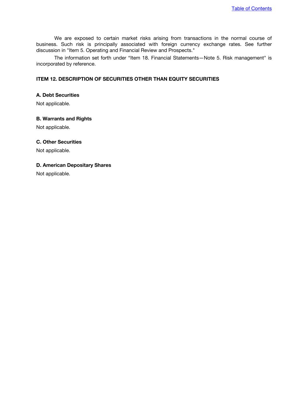 We are exposed to certain market risks arising from transactions in the normal course of business. Such risk is principally associated with foreign currency exchange rates. See further discussion in "Item 5. Operating and Financial Review and Prospects." The information set forth under “Item 18. Financial Statements—Note 5. Risk management" is incorporated by reference. ITEM 12. DESCRIPTION OF SECURITIES OTHER THAN EQUITY SECURITIES A. Debt Securities Not applicable. B. Warrants and Rights Not applicable. C. Other Securities Not applicable. D. American Depositary Shares Not applicable. Table of Contents