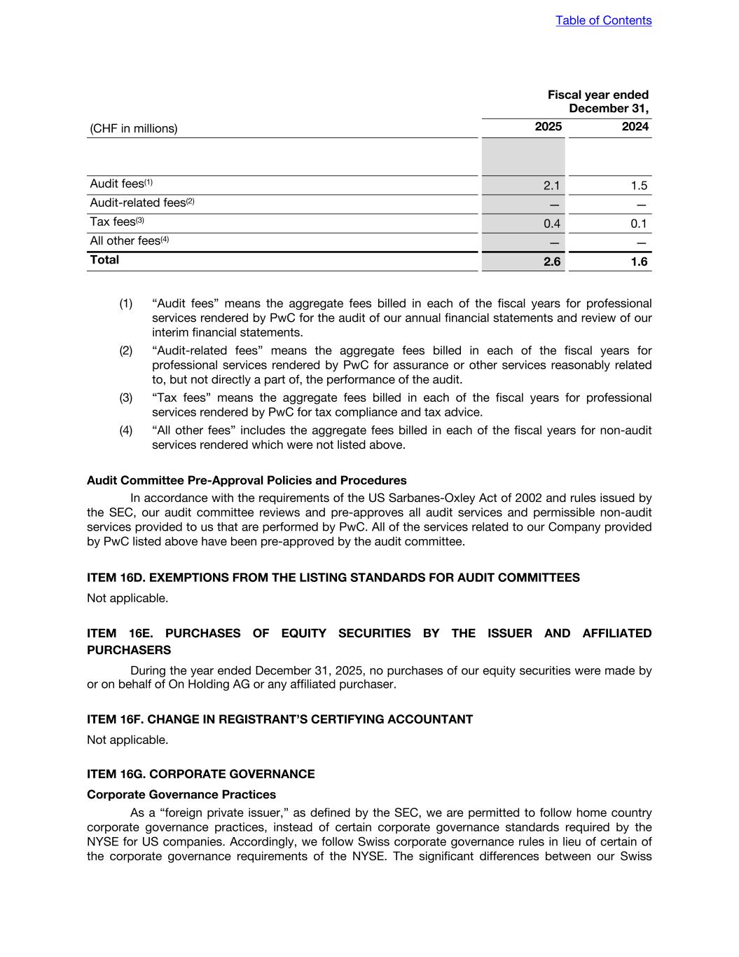 Fiscal year ended December 31, (CHF in millions) 2025 2024 Audit fees(1) 2.1 1.5 Audit-related fees(2) — — Tax fees(3) 0.4 0.1 All other fees(4) — — Total 2.6 1.6 (1) “Audit fees” means the aggregate fees billed in each of the fiscal years for professional services rendered by PwC for the audit of our annual financial statements and review of our interim financial statements. (2) “Audit-related fees” means the aggregate fees billed in each of the fiscal years for professional services rendered by PwC for assurance or other services reasonably related to, but not directly a part of, the performance of the audit. (3) “Tax fees” means the aggregate fees billed in each of the fiscal years for professional services rendered by PwC for tax compliance and tax advice. (4) “All other fees” includes the aggregate fees billed in each of the fiscal years for non-audit services rendered which were not listed above. Audit Committee Pre-Approval Policies and Procedures In accordance with the requirements of the US Sarbanes-Oxley Act of 2002 and rules issued by the SEC, our audit committee reviews and pre-approves all audit services and permissible non-audit services provided to us that are performed by PwC. All of the services related to our Company provided by PwC listed above have been pre-approved by the audit committee. ITEM 16D. EXEMPTIONS FROM THE LISTING STANDARDS FOR AUDIT COMMITTEES Not applicable. ITEM 16E. PURCHASES OF EQUITY SECURITIES BY THE ISSUER AND AFFILIATED PURCHASERS During the year ended December 31, 2025, no purchases of our equity securities were made by or on behalf of On Holding AG or any affiliated purchaser. ITEM 16F. CHANGE IN REGISTRANT’S CERTIFYING ACCOUNTANT Not applicable. ITEM 16G. CORPORATE GOVERNANCE Corporate Governance Practices As a “foreign private issuer,” as defined by the SEC, we are permitted to follow home country corporate governance practices, instead of certain corporate governance standards required by the NYSE for US companies. Accordingly, we follow Swiss corporate governance rules in lieu of certain of the corporate governance requirements of the NYSE. The significant differences between our Swiss Table of Contents