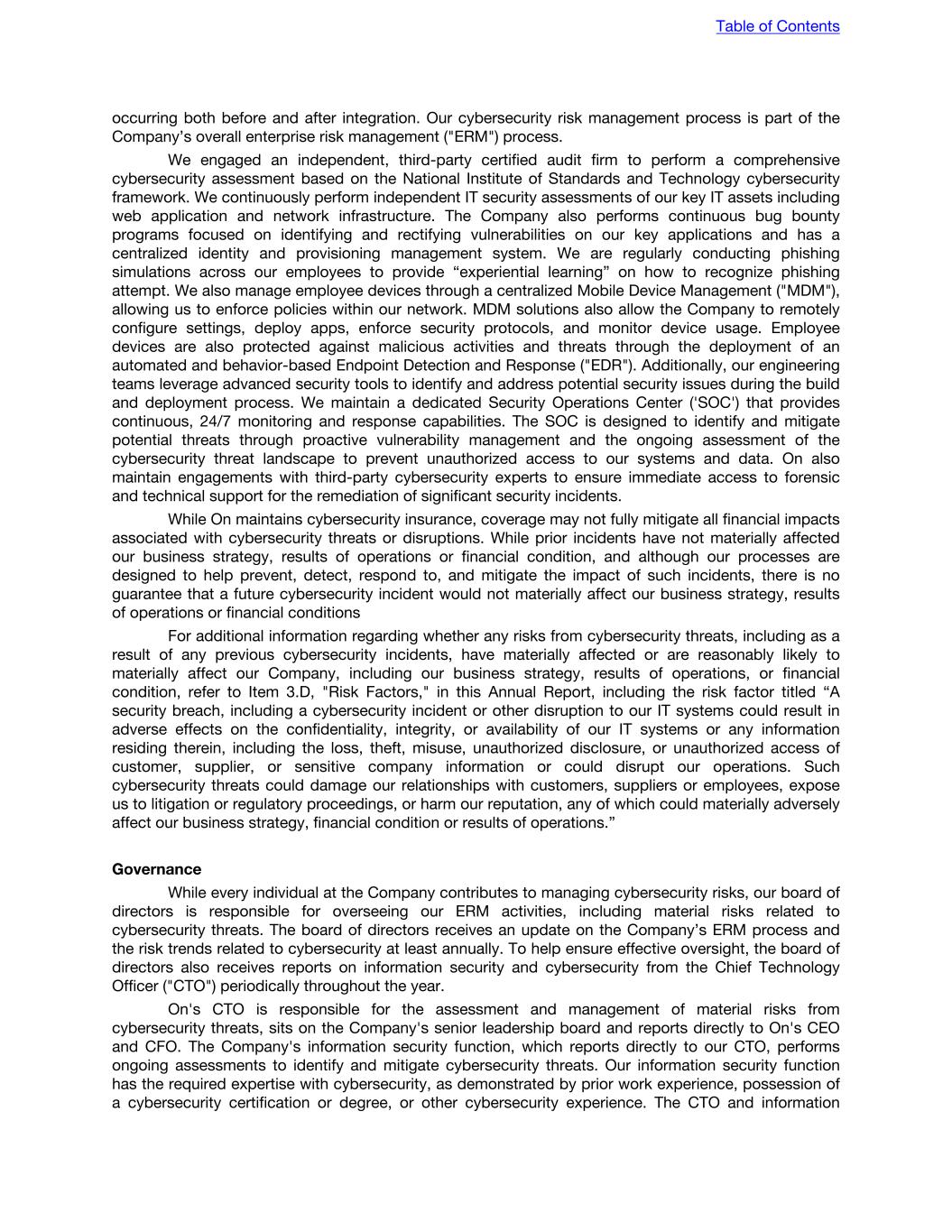 occurring both before and after integration. Our cybersecurity risk management process is part of the Company’s overall enterprise risk management ("ERM") process. We engaged an independent, third-party certified audit firm to perform a comprehensive cybersecurity assessment based on the National Institute of Standards and Technology cybersecurity framework. We continuously perform independent IT security assessments of our key IT assets including web application and network infrastructure. The Company also performs continuous bug bounty programs focused on identifying and rectifying vulnerabilities on our key applications and has a centralized identity and provisioning management system. We are regularly conducting phishing simulations across our employees to provide “experiential learning” on how to recognize phishing attempt. We also manage employee devices through a centralized Mobile Device Management ("MDM"), allowing us to enforce policies within our network. MDM solutions also allow the Company to remotely configure settings, deploy apps, enforce security protocols, and monitor device usage. Employee devices are also protected against malicious activities and threats through the deployment of an automated and behavior-based Endpoint Detection and Response ("EDR"). Additionally, our engineering teams leverage advanced security tools to identify and address potential security issues during the build and deployment process. We maintain a dedicated Security Operations Center ('SOC') that provides continuous, 24/7 monitoring and response capabilities. The SOC is designed to identify and mitigate potential threats through proactive vulnerability management and the ongoing assessment of the cybersecurity threat landscape to prevent unauthorized access to our systems and data. On also maintain engagements with third-party cybersecurity experts to ensure immediate access to forensic and technical support for the remediation of significant security incidents. While On maintains cybersecurity insurance, coverage may not fully mitigate all financial impacts associated with cybersecurity threats or disruptions. While prior incidents have not materially affected our business strategy, results of operations or financial condition, and although our processes are designed to help prevent, detect, respond to, and mitigate the impact of such incidents, there is no guarantee that a future cybersecurity incident would not materially affect our business strategy, results of operations or financial conditions For additional information regarding whether any risks from cybersecurity threats, including as a result of any previous cybersecurity incidents, have materially affected or are reasonably likely to materially affect our Company, including our business strategy, results of operations, or financial condition, refer to Item 3.D, "Risk Factors," in this Annual Report, including the risk factor titled “A security breach, including a cybersecurity incident or other disruption to our IT systems could result in adverse effects on the confidentiality, integrity, or availability of our IT systems or any information residing therein, including the loss, theft, misuse, unauthorized disclosure, or unauthorized access of customer, supplier, or sensitive company information or could disrupt our operations. Such cybersecurity threats could damage our relationships with customers, suppliers or employees, expose us to litigation or regulatory proceedings, or harm our reputation, any of which could materially adversely affect our business strategy, financial condition or results of operations.” Governance While every individual at the Company contributes to managing cybersecurity risks, our board of directors is responsible for overseeing our ERM activities, including material risks related to cybersecurity threats. The board of directors receives an update on the Company’s ERM process and the risk trends related to cybersecurity at least annually. To help ensure effective oversight, the board of directors also receives reports on information security and cybersecurity from the Chief Technology Officer ("CTO") periodically throughout the year. On's CTO is responsible for the assessment and management of material risks from cybersecurity threats, sits on the Company's senior leadership board and reports directly to On's CEO and CFO. The Company's information security function, which reports directly to our CTO, performs ongoing assessments to identify and mitigate cybersecurity threats. Our information security function has the required expertise with cybersecurity, as demonstrated by prior work experience, possession of a cybersecurity certification or degree, or other cybersecurity experience. The CTO and information Table of Contents