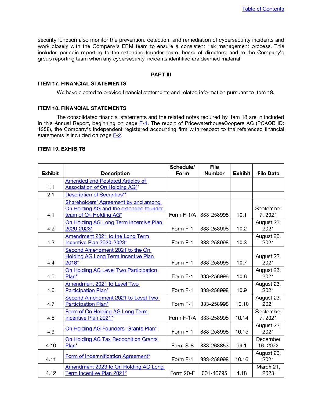 security function also monitor the prevention, detection, and remediation of cybersecurity incidents and work closely with the Company's ERM team to ensure a consistent risk management process. This includes periodic reporting to the extended founder team, board of directors, and to the Company's group reporting team when any cybersecurity incidents identified are deemed material. PART III ITEM 17. FINANCIAL STATEMENTS We have elected to provide financial statements and related information pursuant to Item 18. ITEM 18. FINANCIAL STATEMENTS The consolidated financial statements and the related notes required by Item 18 are in included in this Annual Report, beginning on page F-1. The report of PricewaterhouseCoopers AG (PCAOB ID: 1358), the Company's independent registered accounting firm with respect to the referenced financial statements is included on page F-2. ITEM 19. EXHIBITS Exhibit Description Schedule/ Form File Number Exhibit File Date 1.1 Amended and Restated Articles of Association of On Holding AG** 2.1 Description of Securities** 4.1 Shareholders’ Agreement by and among On Holding AG and the extended founder team of On Holding AG* Form F-1/A 333-258998 10.1 September 7, 2021 4.2 On Holding AG Long Term Incentive Plan 2020-2023* Form F-1 333-258998 10.2 August 23, 2021 4.3 Amendment 2021 to the Long Term Incentive Plan 2020-2023* Form F-1 333-258998 10.3 August 23, 2021 4.4 Second Amendment 2021 to the On Holding AG Long Term Incentive Plan 2018* Form F-1 333-258998 10.7 August 23, 2021 4.5 On Holding AG Level Two Participation Plan* Form F-1 333-258998 10.8 August 23, 2021 4.6 Amendment 2021 to Level Two Participation Plan* Form F-1 333-258998 10.9 August 23, 2021 4.7 Second Amendment 2021 to Level Two Participation Plan* Form F-1 333-258998 10.10 August 23, 2021 4.8 Form of On Holding AG Long Term Incentive Plan 2021* Form F-1/A 333-258998 10.14 September 7, 2021 4.9 On Holding AG Founders’ Grants Plan* Form F-1 333-258998 10.15 August 23, 2021 4.10 On Holding AG Tax Recognition Grants Plan* Form S-8 333-268853 99.1 December 16, 2022 4.11 Form of Indemnification Agreement* Form F-1 333-258998 10.16 August 23, 2021 4.12 Amendment 2023 to On Holding AG Long Term Incentive Plan 2021* Form 20-F 001-40795 4.18 March 21, 2023 Table of Contents