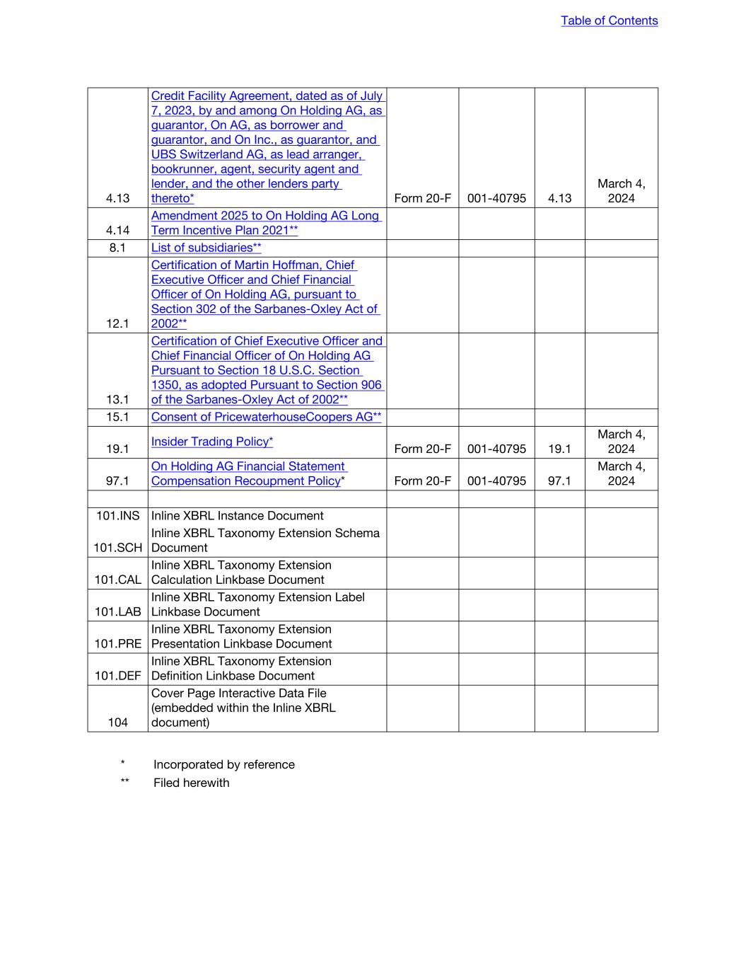 4.13 Credit Facility Agreement, dated as of July 7, 2023, by and among On Holding AG, as guarantor, On AG, as borrower and guarantor, and On Inc., as guarantor, and UBS Switzerland AG, as lead arranger, bookrunner, agent, security agent and lender, and the other lenders party thereto* Form 20-F 001-40795 4.13 March 4, 2024 4.14 Amendment 2025 to On Holding AG Long Term Incentive Plan 2021** 8.1 List of subsidiaries** 12.1 Certification of Martin Hoffman, Chief Executive Officer and Chief Financial Officer of On Holding AG, pursuant to Section 302 of the Sarbanes-Oxley Act of 2002** 13.1 Certification of Chief Executive Officer and Chief Financial Officer of On Holding AG Pursuant to Section 18 U.S.C. Section 1350, as adopted Pursuant to Section 906 of the Sarbanes-Oxley Act of 2002** 15.1 Consent of PricewaterhouseCoopers AG** 19.1 Insider Trading Policy* Form 20-F 001-40795 19.1 March 4, 2024 97.1 On Holding AG Financial Statement Compensation Recoupment Policy* Form 20-F 001-40795 97.1 March 4, 2024 101.INS Inline XBRL Instance Document 101.SCH Inline XBRL Taxonomy Extension Schema Document 101.CAL Inline XBRL Taxonomy Extension Calculation Linkbase Document 101.LAB Inline XBRL Taxonomy Extension Label Linkbase Document 101.PRE Inline XBRL Taxonomy Extension Presentation Linkbase Document 101.DEF Inline XBRL Taxonomy Extension Definition Linkbase Document 104 Cover Page Interactive Data File (embedded within the Inline XBRL document) * Incorporated by reference ** Filed herewith Table of Contents