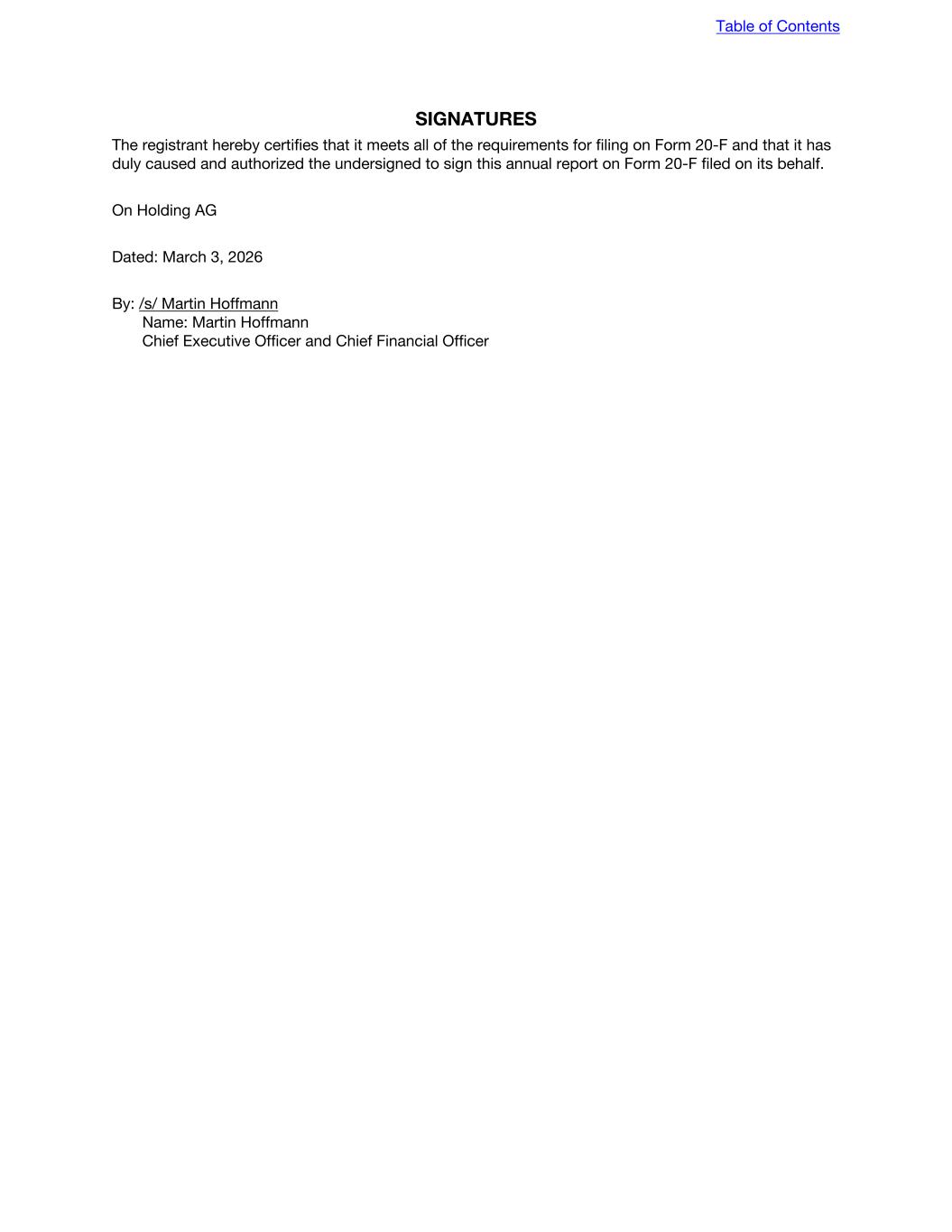 SIGNATURES The registrant hereby certifies that it meets all of the requirements for filing on Form 20-F and that it has duly caused and authorized the undersigned to sign this annual report on Form 20-F filed on its behalf. On Holding AG Dated: March 3, 2026 By: /s/ Martin Hoffmann Name: Martin Hoffmann Chief Executive Officer and Chief Financial Officer Table of Contents