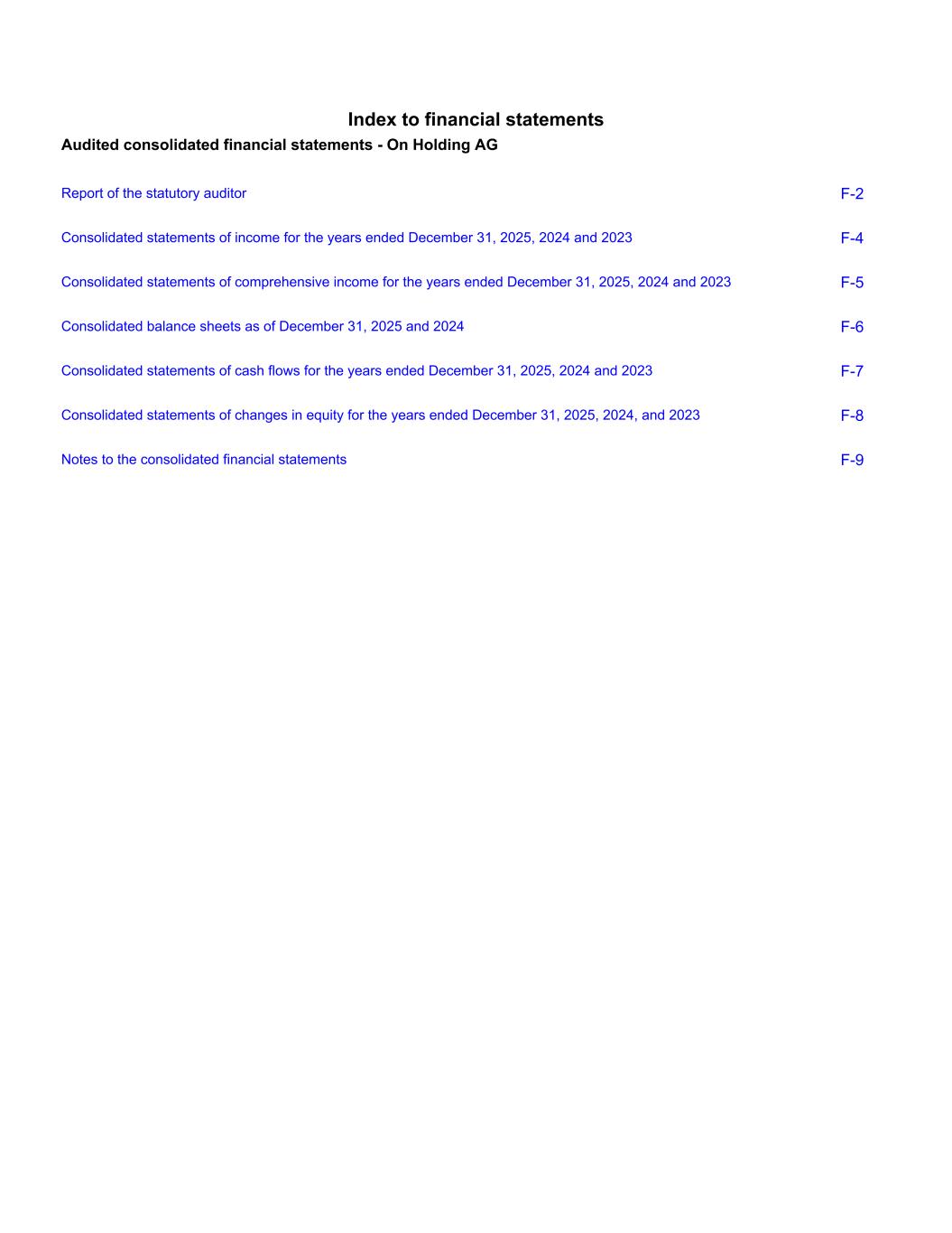 Index to financial statements Audited consolidated financial statements - On Holding AG Report of the statutory auditor F-2 Consolidated statements of income for the years ended December 31, 2025, 2024 and 2023 F-4 Consolidated statements of comprehensive income for the years ended December 31, 2025, 2024 and 2023 F-5 Consolidated balance sheets as of December 31, 2025 and 2024 F-6 Consolidated statements of cash flows for the years ended December 31, 2025, 2024 and 2023 F-7 Consolidated statements of changes in equity for the years ended December 31, 2025, 2024, and 2023 F-8 Notes to the consolidated financial statements F-9