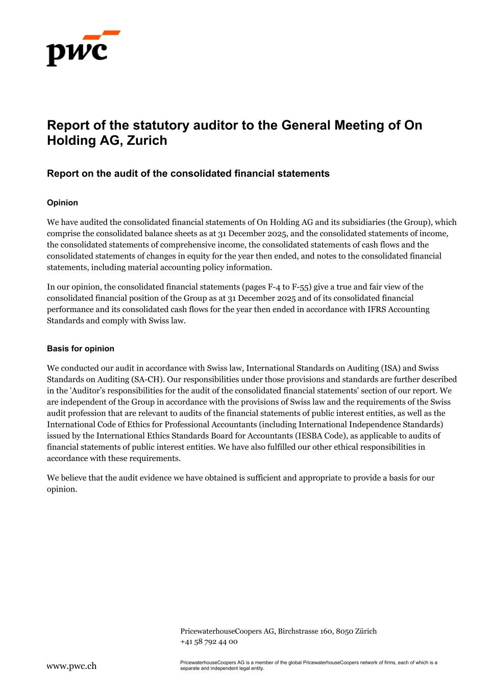 Report of the statutory auditor to the General Meeting of On Holding AG, Zurich Report on the audit of the consolidated financial statements Opinion We have audited the consolidated financial statements of On Holding AG and its subsidiaries (the Group), which comprise the consolidated balance sheets as at 31 December 2025, and the consolidated statements of income, the consolidated statements of comprehensive income, the consolidated statements of cash flows and the consolidated statements of changes in equity for the year then ended, and notes to the consolidated financial statements, including material accounting policy information. In our opinion, the consolidated financial statements (pages F-4 to F-55) give a true and fair view of the consolidated financial position of the Group as at 31 December 2025 and of its consolidated financial performance and its consolidated cash flows for the year then ended in accordance with IFRS Accounting Standards and comply with Swiss law. Basis for opinion We conducted our audit in accordance with Swiss law, International Standards on Auditing (ISA) and Swiss Standards on Auditing (SA-CH). Our responsibilities under those provisions and standards are further described in the 'Auditor’s responsibilities for the audit of the consolidated financial statements' section of our report. We are independent of the Group in accordance with the provisions of Swiss law and the requirements of the Swiss audit profession that are relevant to audits of the financial statements of public interest entities, as well as the International Code of Ethics for Professional Accountants (including International Independence Standards) issued by the International Ethics Standards Board for Accountants (IESBA Code), as applicable to audits of financial statements of public interest entities. We have also fulfilled our other ethical responsibilities in accordance with these requirements. We believe that the audit evidence we have obtained is sufficient and appropriate to provide a basis for our opinion. PricewaterhouseCoopers AG, Birchstrasse 160, 8050 Zürich +41 58 792 44 00 www.pwc.ch PricewaterhouseCoopers AG is a member of the global PricewaterhouseCoopers network of firms, each of which is a separate and independent legal entity.
