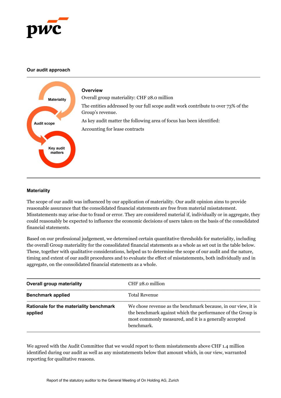 Our audit approach Overview Overall group materiality: CHF 28.0 million The entities addressed by our full scope audit work contribute to over 73% of the Group’s revenue. As key audit matter the following area of focus has been identified: Accounting for lease contracts Materiality The scope of our audit was influenced by our application of materiality. Our audit opinion aims to provide reasonable assurance that the consolidated financial statements are free from material misstatement. Misstatements may arise due to fraud or error. They are considered material if, individually or in aggregate, they could reasonably be expected to influence the economic decisions of users taken on the basis of the consolidated financial statements. Based on our professional judgement, we determined certain quantitative thresholds for materiality, including the overall Group materiality for the consolidated financial statements as a whole as set out in the table below. These, together with qualitative considerations, helped us to determine the scope of our audit and the nature, timing and extent of our audit procedures and to evaluate the effect of misstatements, both individually and in aggregate, on the consolidated financial statements as a whole. Overall group materiality CHF 28.0 million Benchmark applied Total Revenue Rationale for the materiality benchmark applied We chose revenue as the benchmark because, in our view, it is the benchmark against which the performance of the Group is most commonly measured, and it is a generally accepted benchmark. We agreed with the Audit Committee that we would report to them misstatements above CHF 1.4 million identified during our audit as well as any misstatements below that amount which, in our view, warranted reporting for qualitative reasons. Report of the statutory auditor to the General Meeting of On Holding AG, Zurich
