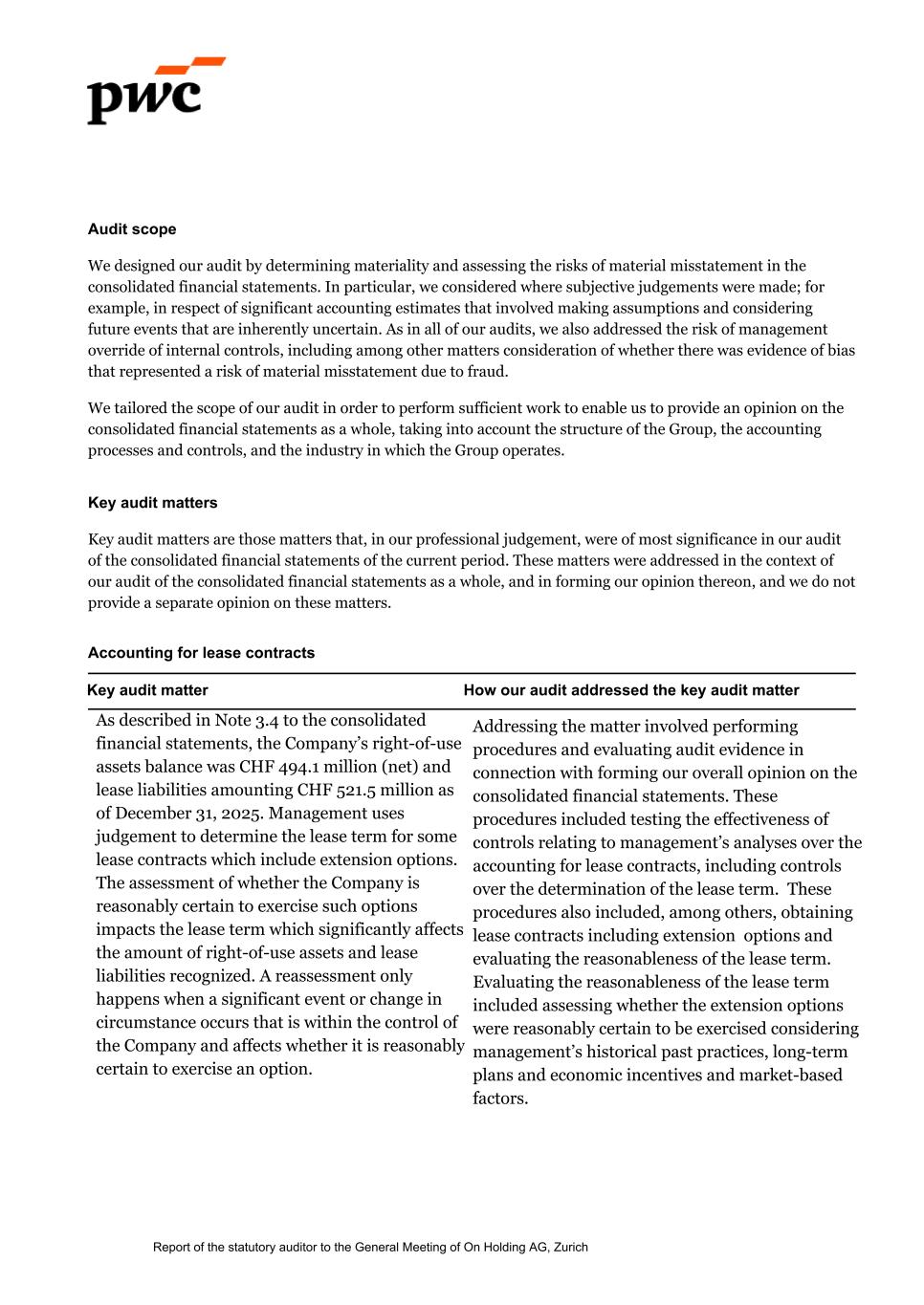 Audit scope We designed our audit by determining materiality and assessing the risks of material misstatement in the consolidated financial statements. In particular, we considered where subjective judgements were made; for example, in respect of significant accounting estimates that involved making assumptions and considering future events that are inherently uncertain. As in all of our audits, we also addressed the risk of management override of internal controls, including among other matters consideration of whether there was evidence of bias that represented a risk of material misstatement due to fraud. We tailored the scope of our audit in order to perform sufficient work to enable us to provide an opinion on the consolidated financial statements as a whole, taking into account the structure of the Group, the accounting processes and controls, and the industry in which the Group operates. Key audit matters Key audit matters are those matters that, in our professional judgement, were of most significance in our audit of the consolidated financial statements of the current period. These matters were addressed in the context of our audit of the consolidated financial statements as a whole, and in forming our opinion thereon, and we do not provide a separate opinion on these matters. Accounting for lease contracts Key audit matter How our audit addressed the key audit matter As described in Note 3.4 to the consolidated financial statements, the Company’s right-of-use assets balance was CHF 494.1 million (net) and lease liabilities amounting CHF 521.5 million as of December 31, 2025. Management uses judgement to determine the lease term for some lease contracts which include extension options. The assessment of whether the Company is reasonably certain to exercise such options impacts the lease term which significantly affects the amount of right-of-use assets and lease liabilities recognized. A reassessment only happens when a significant event or change in circumstance occurs that is within the control of the Company and affects whether it is reasonably certain to exercise an option. Addressing the matter involved performing procedures and evaluating audit evidence in connection with forming our overall opinion on the consolidated financial statements. These procedures included testing the effectiveness of controls relating to management’s analyses over the accounting for lease contracts, including controls over the determination of the lease term. These procedures also included, among others, obtaining lease contracts including extension options and evaluating the reasonableness of the lease term. Evaluating the reasonableness of the lease term included assessing whether the extension options were reasonably certain to be exercised considering management’s historical past practices, long-term plans and economic incentives and market-based factors. Report of the statutory auditor to the General Meeting of On Holding AG, Zurich