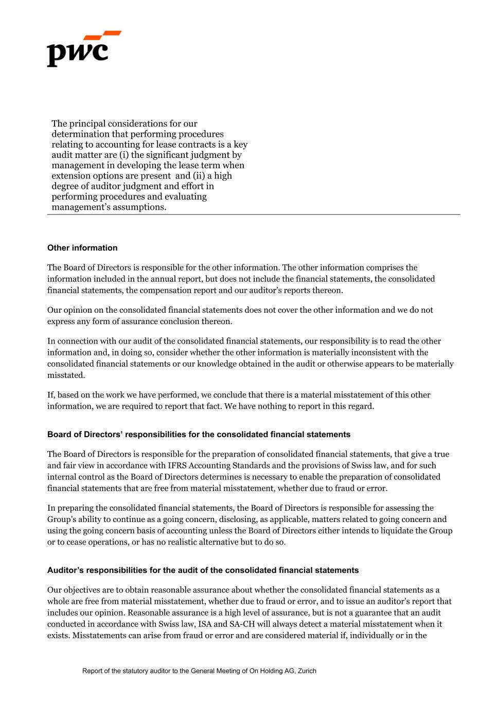 The principal considerations for our determination that performing procedures relating to accounting for lease contracts is a key audit matter are (i) the significant judgment by management in developing the lease term when extension options are present and (ii) a high degree of auditor judgment and effort in performing procedures and evaluating management’s assumptions. Other information The Board of Directors is responsible for the other information. The other information comprises the information included in the annual report, but does not include the financial statements, the consolidated financial statements, the compensation report and our auditor’s reports thereon. Our opinion on the consolidated financial statements does not cover the other information and we do not express any form of assurance conclusion thereon. In connection with our audit of the consolidated financial statements, our responsibility is to read the other information and, in doing so, consider whether the other information is materially inconsistent with the consolidated financial statements or our knowledge obtained in the audit or otherwise appears to be materially misstated. If, based on the work we have performed, we conclude that there is a material misstatement of this other information, we are required to report that fact. We have nothing to report in this regard. Board of Directors’ responsibilities for the consolidated financial statements The Board of Directors is responsible for the preparation of consolidated financial statements, that give a true and fair view in accordance with IFRS Accounting Standards and the provisions of Swiss law, and for such internal control as the Board of Directors determines is necessary to enable the preparation of consolidated financial statements that are free from material misstatement, whether due to fraud or error. In preparing the consolidated financial statements, the Board of Directors is responsible for assessing the Group’s ability to continue as a going concern, disclosing, as applicable, matters related to going concern and using the going concern basis of accounting unless the Board of Directors either intends to liquidate the Group or to cease operations, or has no realistic alternative but to do so. Auditor’s responsibilities for the audit of the consolidated financial statements Our objectives are to obtain reasonable assurance about whether the consolidated financial statements as a whole are free from material misstatement, whether due to fraud or error, and to issue an auditor’s report that includes our opinion. Reasonable assurance is a high level of assurance, but is not a guarantee that an audit conducted in accordance with Swiss law, ISA and SA-CH will always detect a material misstatement when it exists. Misstatements can arise from fraud or error and are considered material if, individually or in the Report of the statutory auditor to the General Meeting of On Holding AG, Zurich