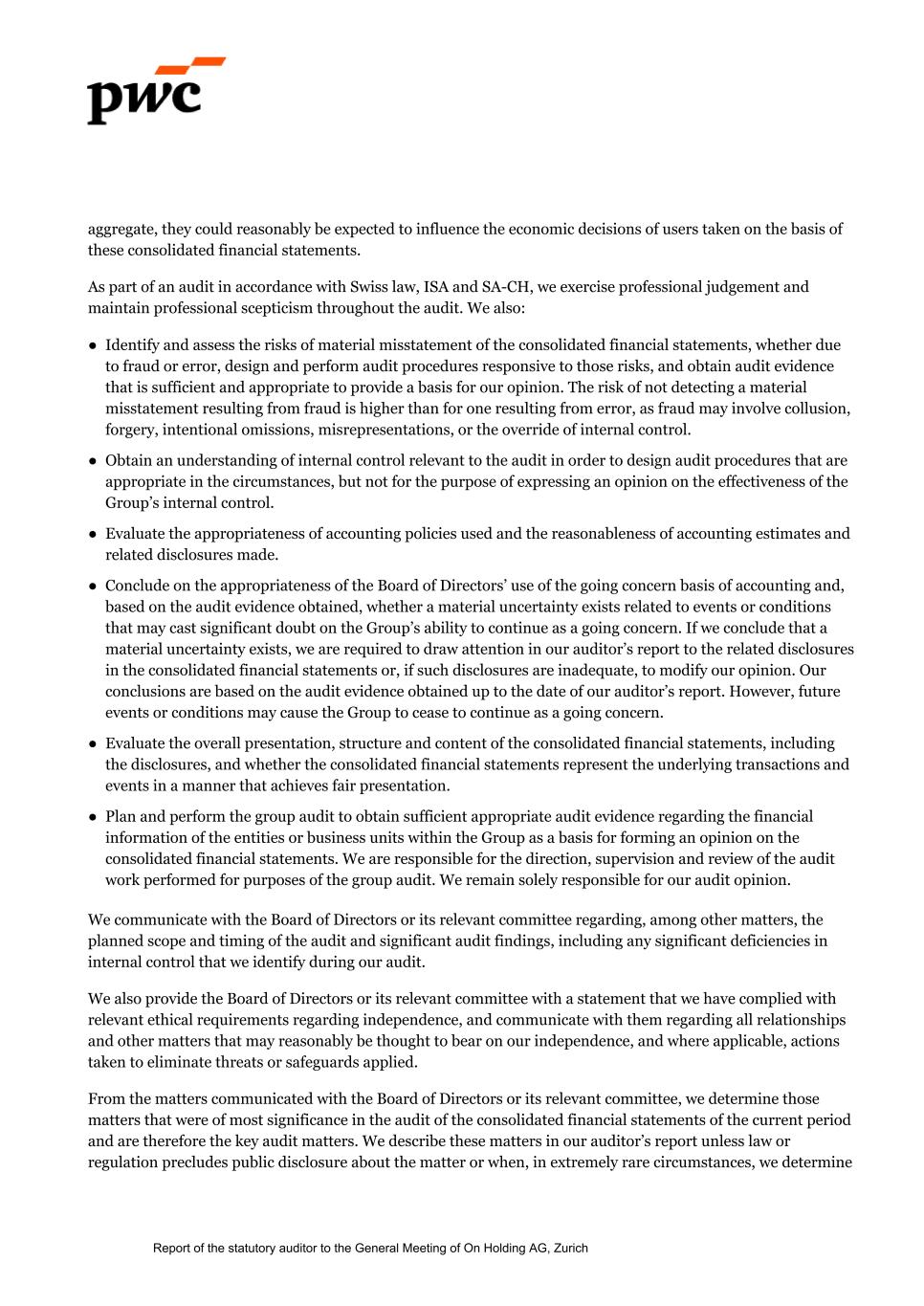 aggregate, they could reasonably be expected to influence the economic decisions of users taken on the basis of these consolidated financial statements. As part of an audit in accordance with Swiss law, ISA and SA-CH, we exercise professional judgement and maintain professional scepticism throughout the audit. We also: ● Identify and assess the risks of material misstatement of the consolidated financial statements, whether due to fraud or error, design and perform audit procedures responsive to those risks, and obtain audit evidence that is sufficient and appropriate to provide a basis for our opinion. The risk of not detecting a material misstatement resulting from fraud is higher than for one resulting from error, as fraud may involve collusion, forgery, intentional omissions, misrepresentations, or the override of internal control. ● Obtain an understanding of internal control relevant to the audit in order to design audit procedures that are appropriate in the circumstances, but not for the purpose of expressing an opinion on the effectiveness of the Group’s internal control. ● Evaluate the appropriateness of accounting policies used and the reasonableness of accounting estimates and related disclosures made. ● Conclude on the appropriateness of the Board of Directors’ use of the going concern basis of accounting and, based on the audit evidence obtained, whether a material uncertainty exists related to events or conditions that may cast significant doubt on the Group’s ability to continue as a going concern. If we conclude that a material uncertainty exists, we are required to draw attention in our auditor’s report to the related disclosures in the consolidated financial statements or, if such disclosures are inadequate, to modify our opinion. Our conclusions are based on the audit evidence obtained up to the date of our auditor’s report. However, future events or conditions may cause the Group to cease to continue as a going concern. ● Evaluate the overall presentation, structure and content of the consolidated financial statements, including the disclosures, and whether the consolidated financial statements represent the underlying transactions and events in a manner that achieves fair presentation. ● Plan and perform the group audit to obtain sufficient appropriate audit evidence regarding the financial information of the entities or business units within the Group as a basis for forming an opinion on the consolidated financial statements. We are responsible for the direction, supervision and review of the audit work performed for purposes of the group audit. We remain solely responsible for our audit opinion. We communicate with the Board of Directors or its relevant committee regarding, among other matters, the planned scope and timing of the audit and significant audit findings, including any significant deficiencies in internal control that we identify during our audit. We also provide the Board of Directors or its relevant committee with a statement that we have complied with relevant ethical requirements regarding independence, and communicate with them regarding all relationships and other matters that may reasonably be thought to bear on our independence, and where applicable, actions taken to eliminate threats or safeguards applied. From the matters communicated with the Board of Directors or its relevant committee, we determine those matters that were of most significance in the audit of the consolidated financial statements of the current period and are therefore the key audit matters. We describe these matters in our auditor’s report unless law or regulation precludes public disclosure about the matter or when, in extremely rare circumstances, we determine Report of the statutory auditor to the General Meeting of On Holding AG, Zurich